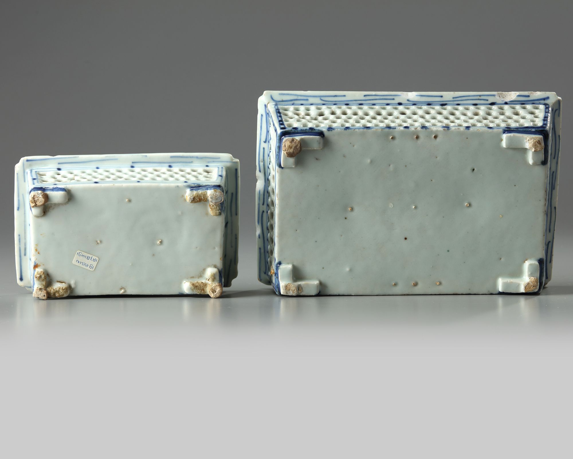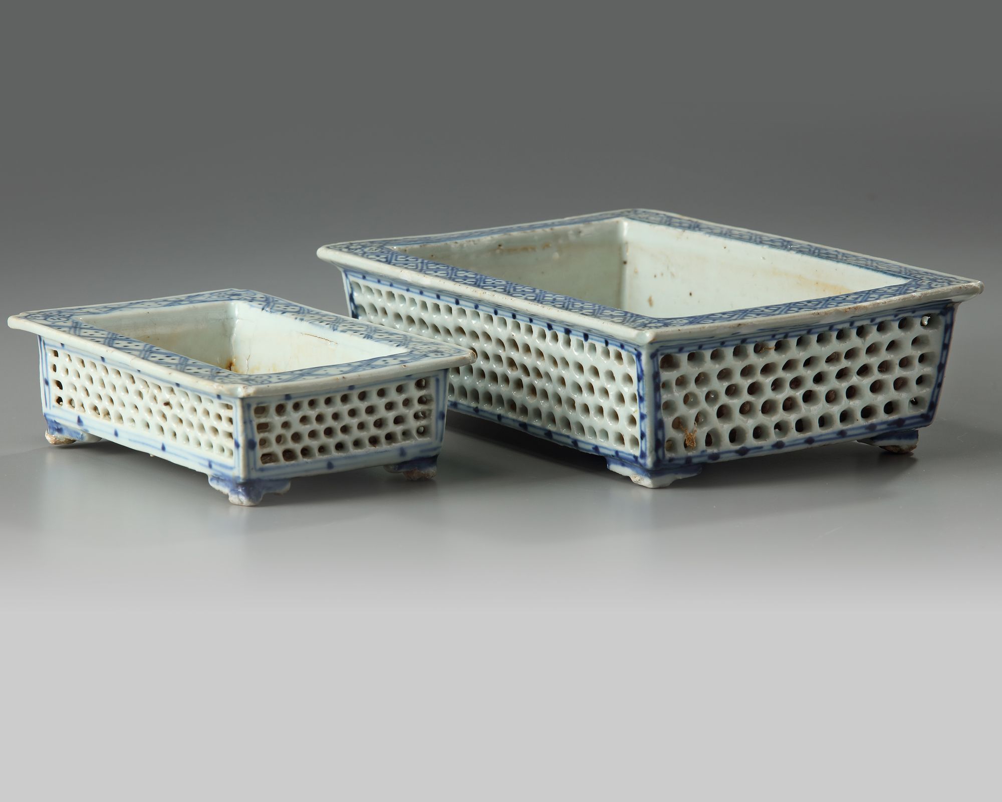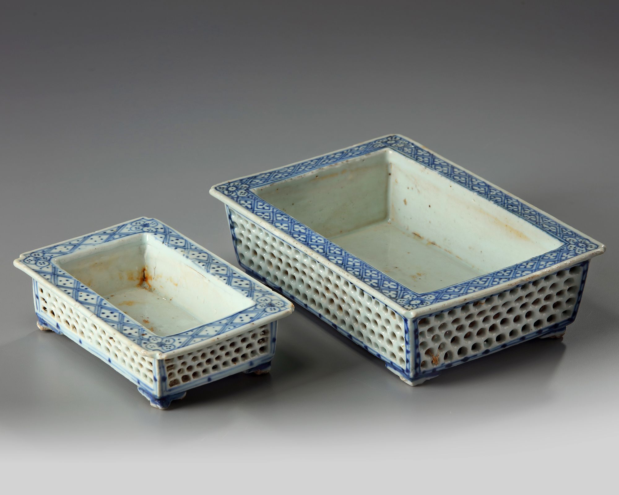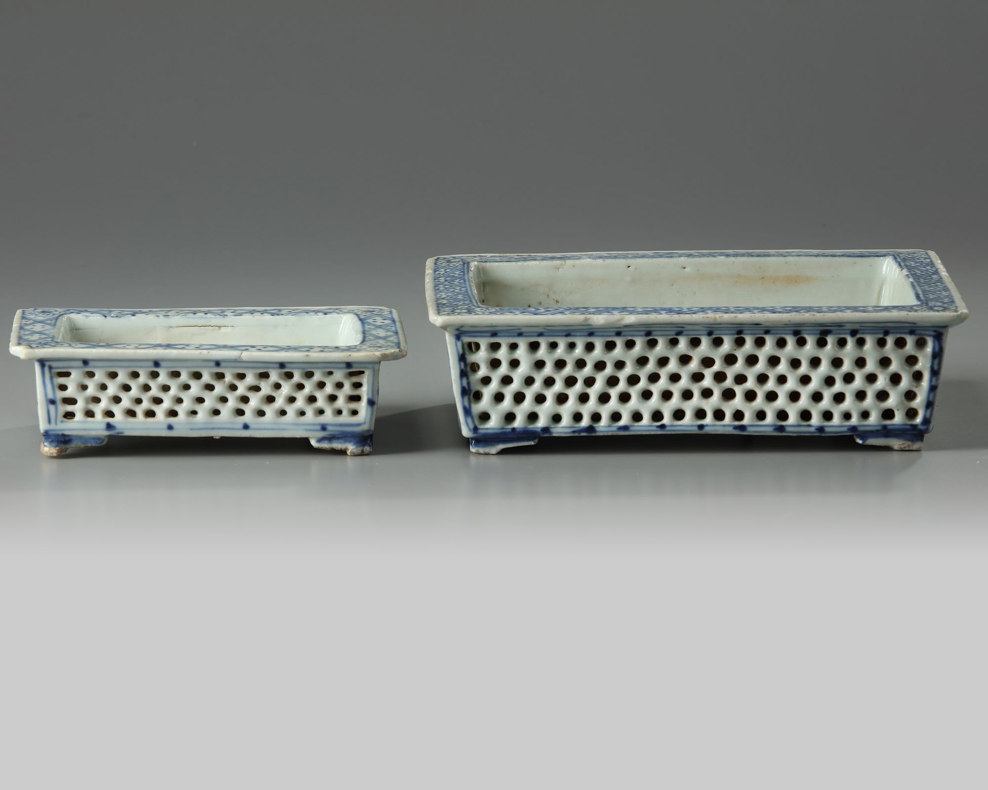 Each vessel is of rectangular form standing on four feet, the sides decorated with an pierced honeycomb pattern, the flattened rims decorated with a diaper band and flower heads to the corners.