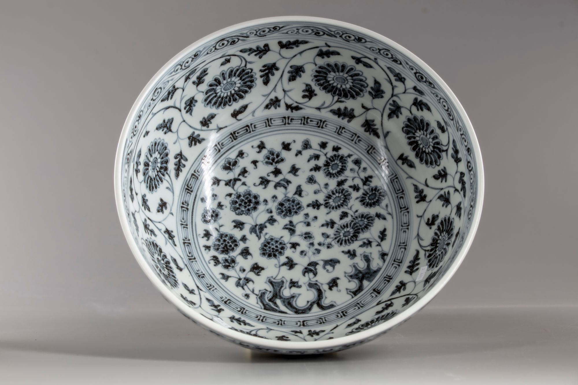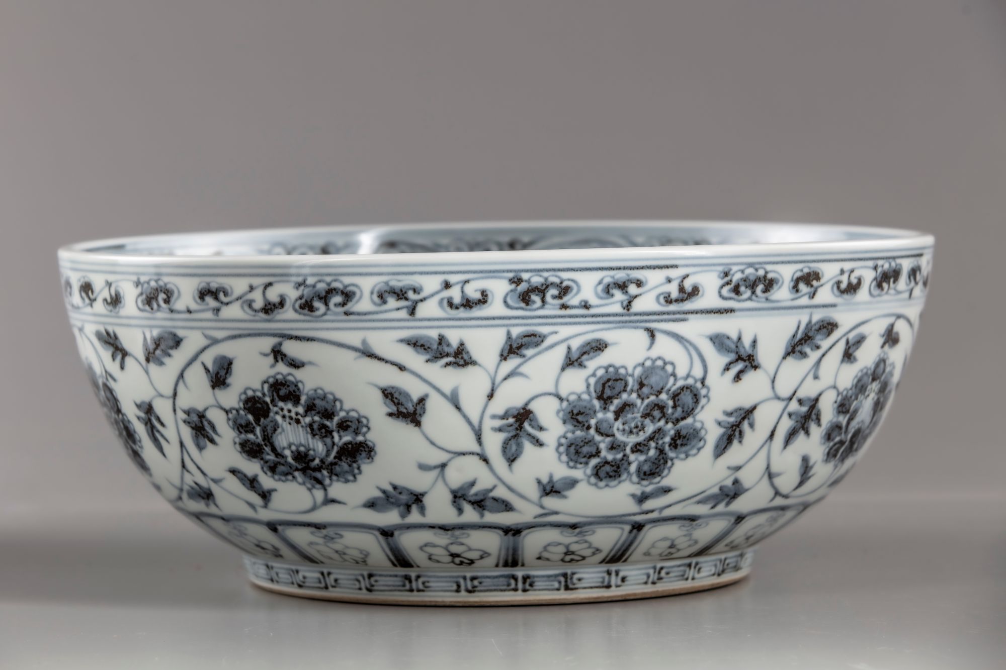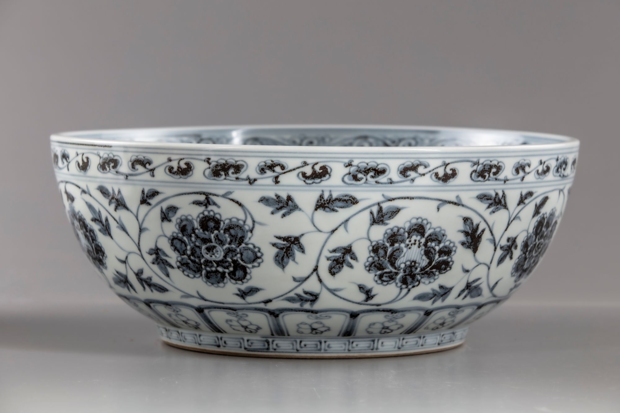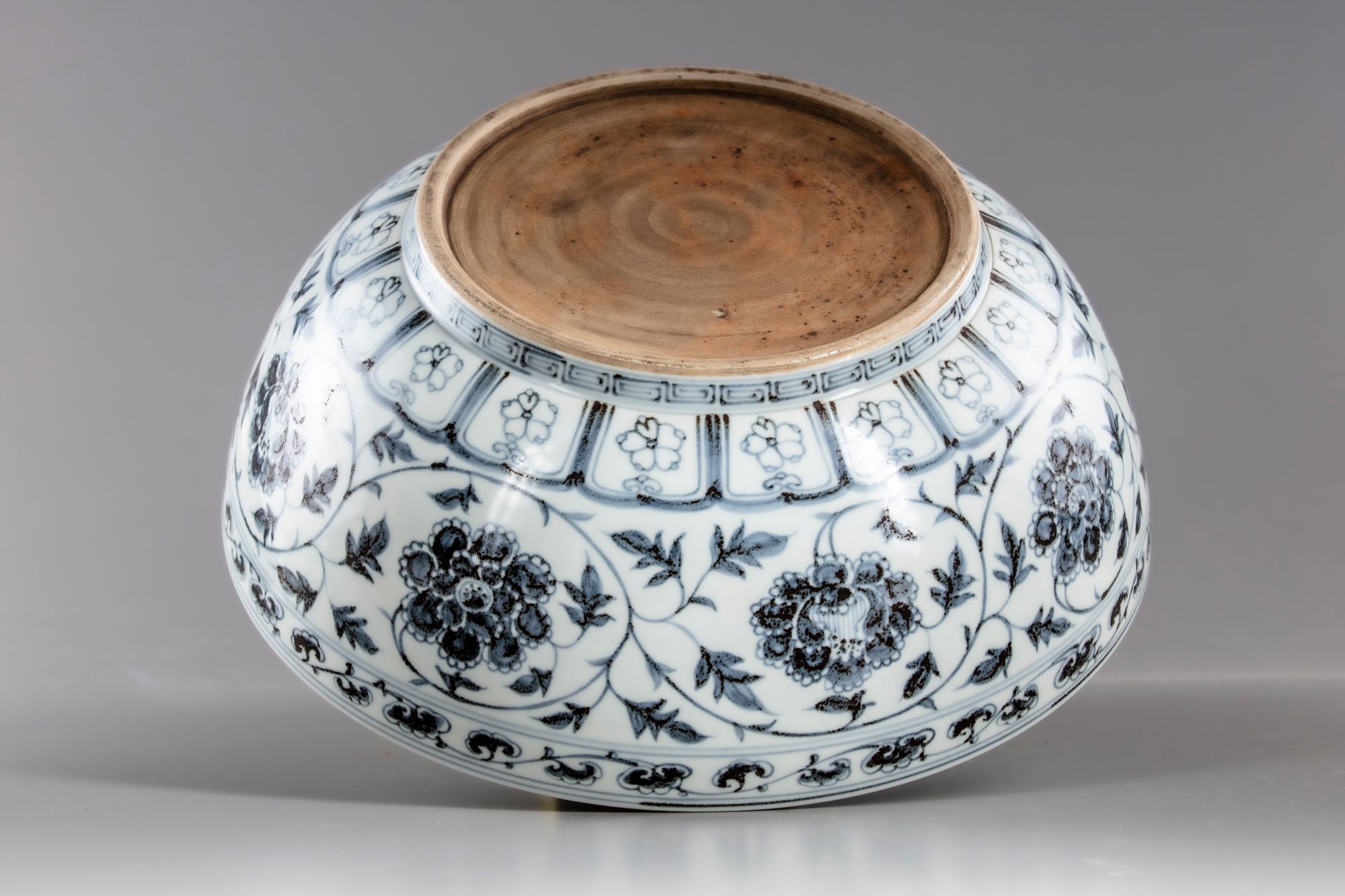 The bowl with deep rounded sides rising from a short straight foot, painted in subtle pinkish-red tones with a leafy peony scroll, the blooms seen alternating from the front and side, all between a classic scroll band and key-fret border encircling the rim and foot respectively, the interior centred with a medallion enclosing flowering branches growing from ornamental rocks, accompanied by a dainty bud, surrounded by a bold leafy chrysanthemum scroll, all below a key-fret band encircling the inner mouth, the base unglazed.