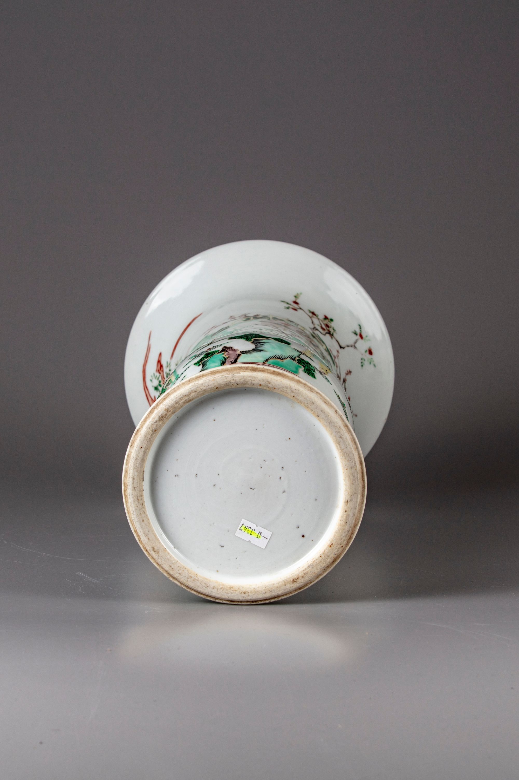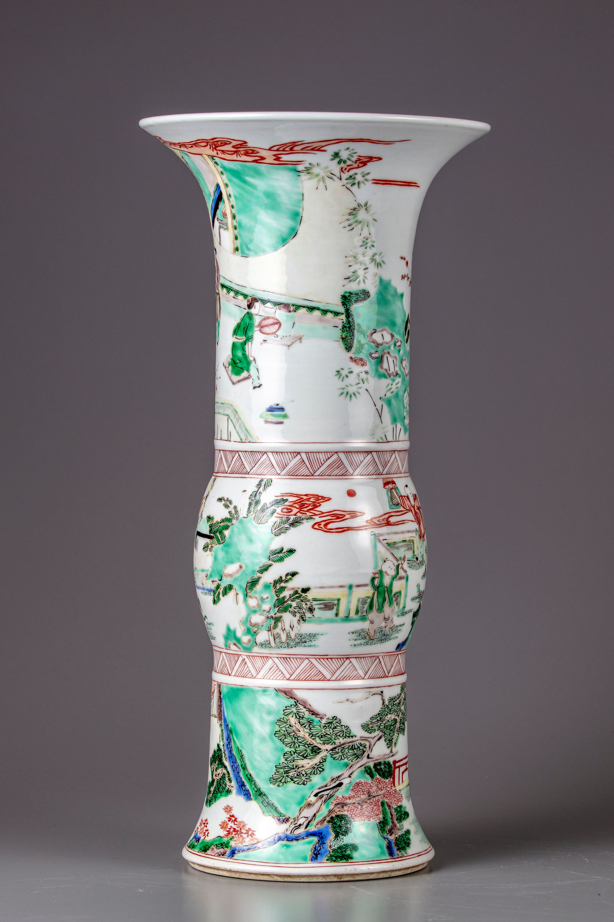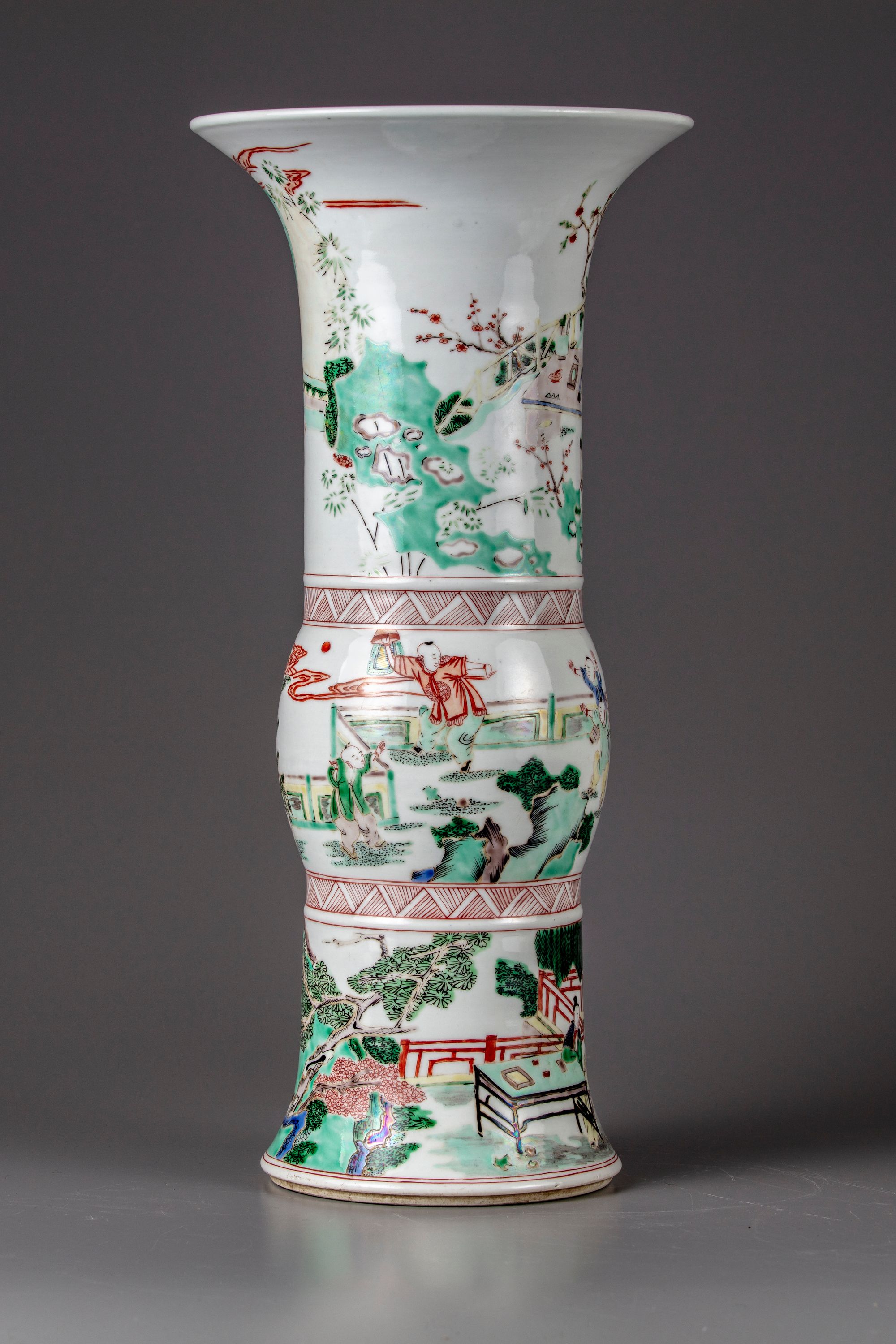 The vase is decorated in three registers, each depicting a continuous scene of scholars and ladies at leisure with attendants in a fenced garden amongst rocks, plantain, and trees.