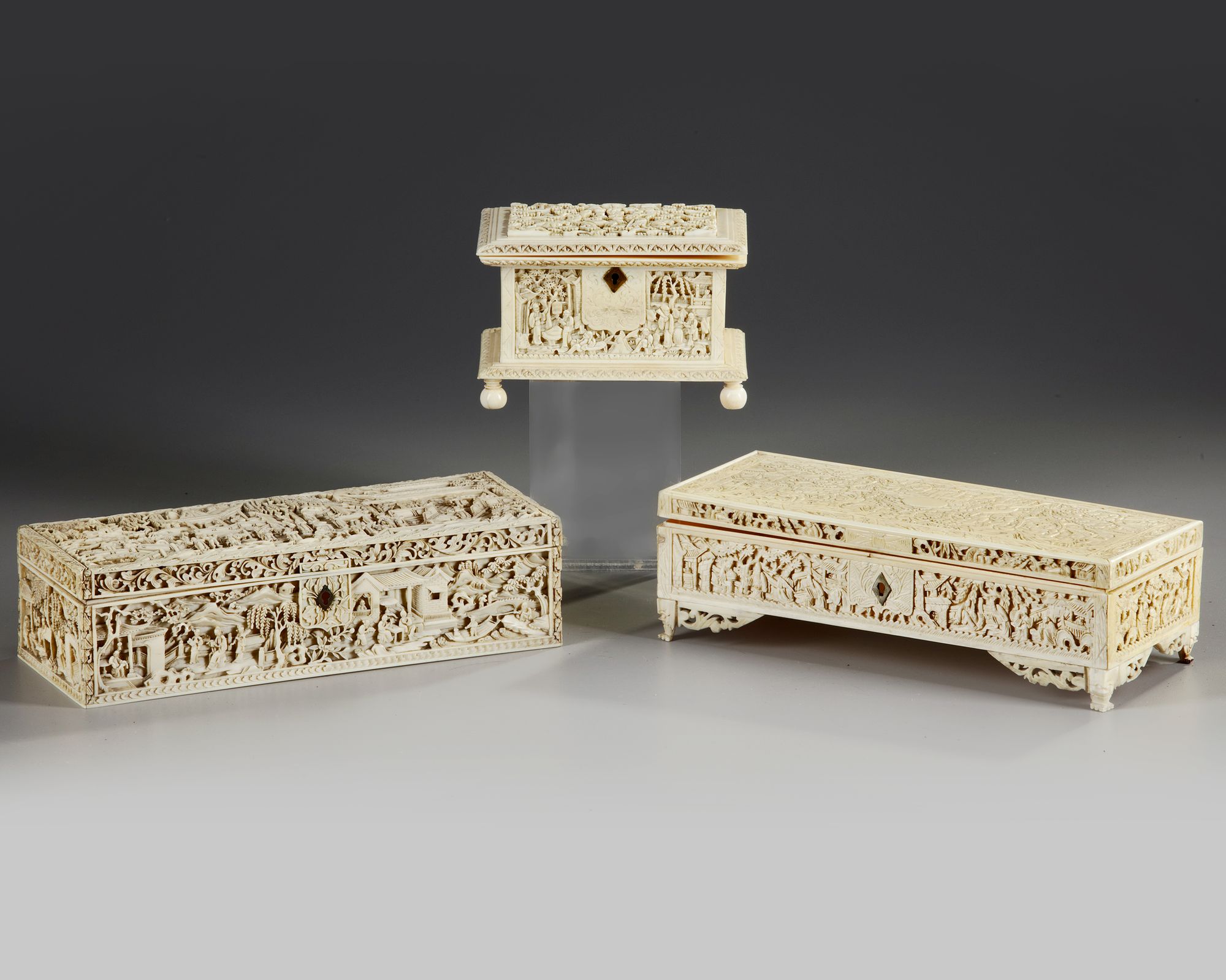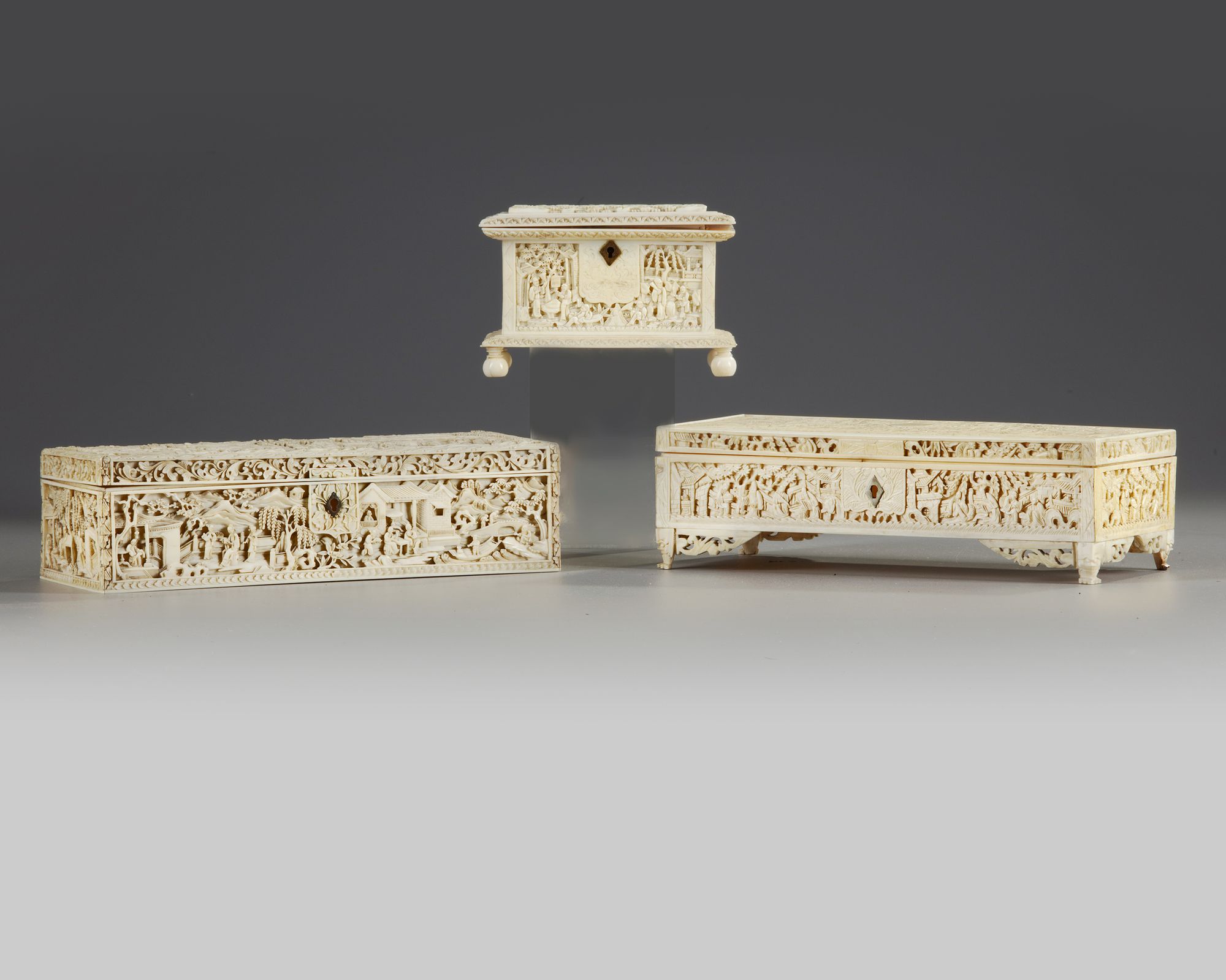 The boxes of various sizes, each carved with panels depicting figures amongst trees and pavilions.