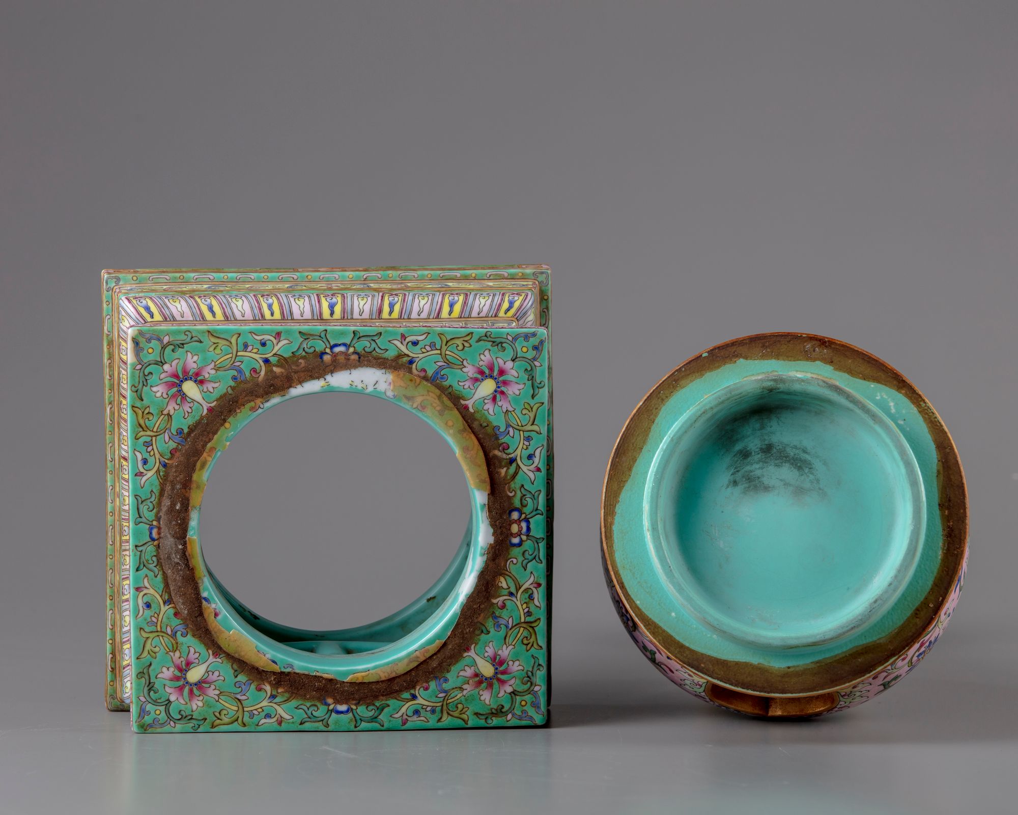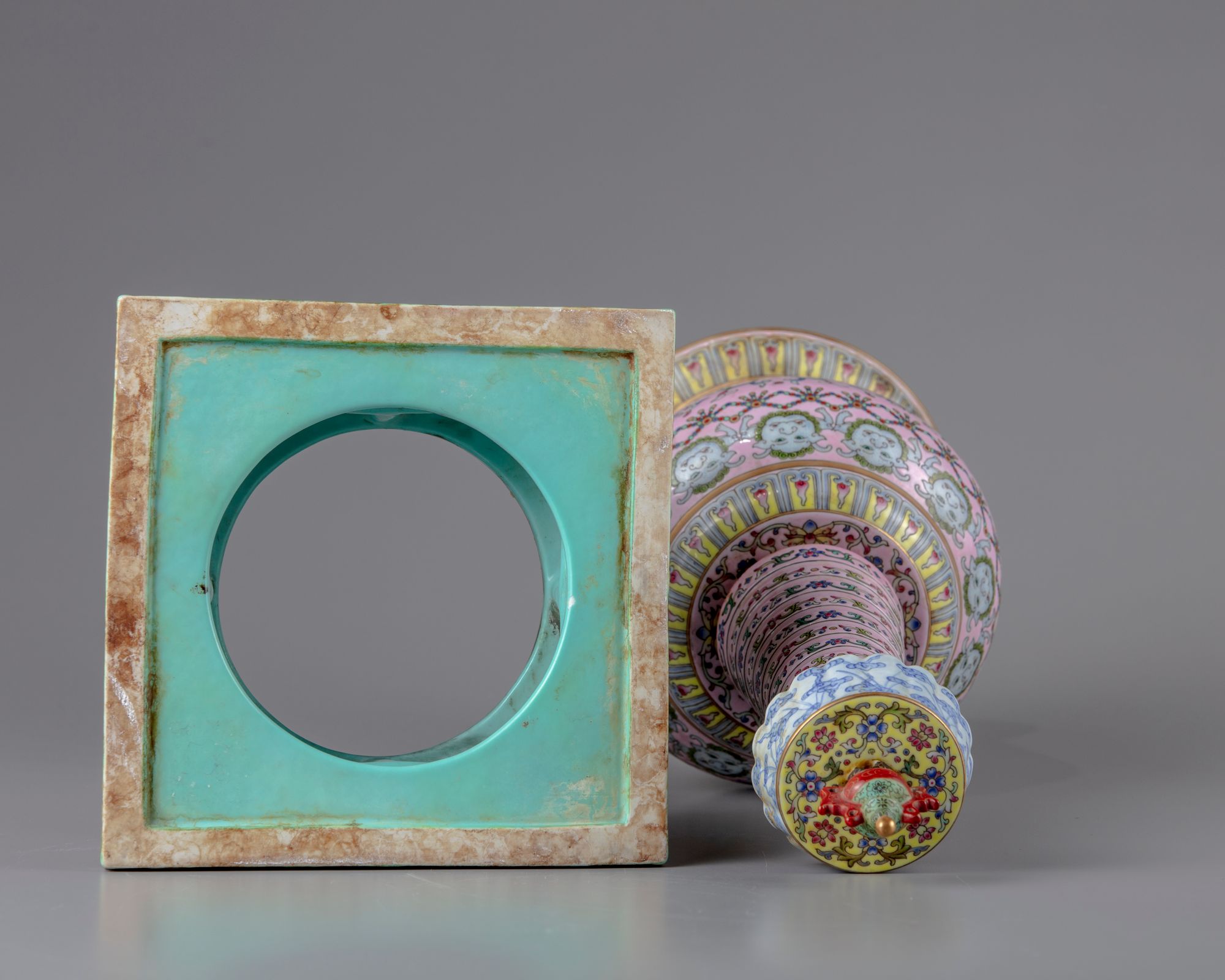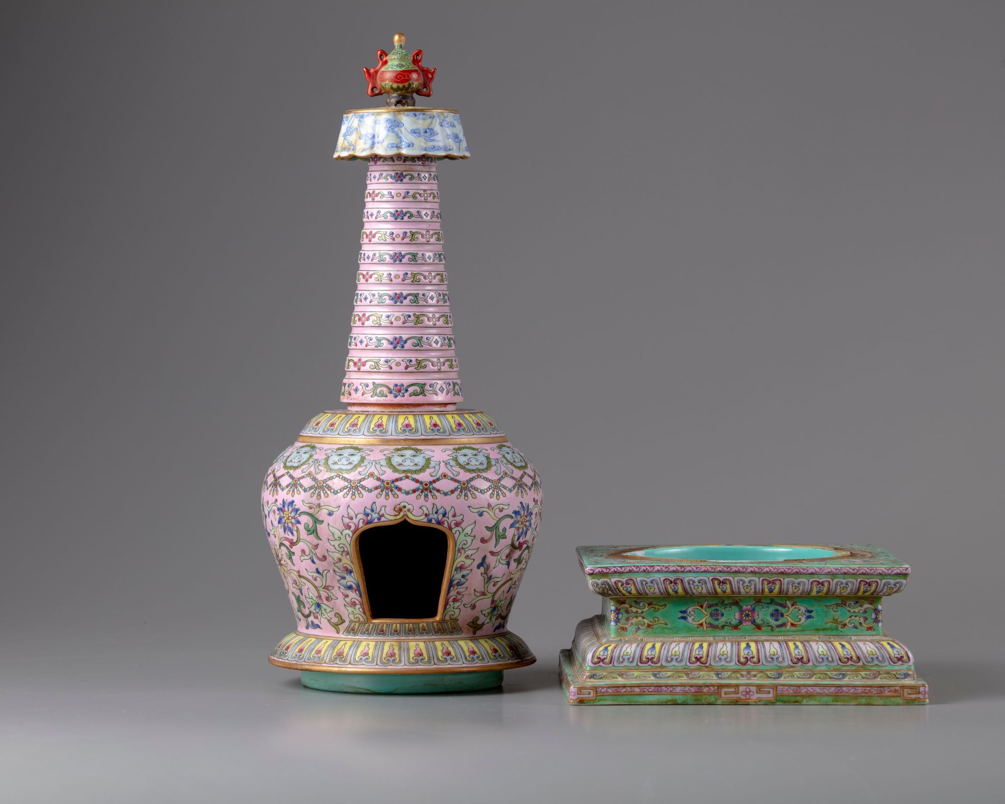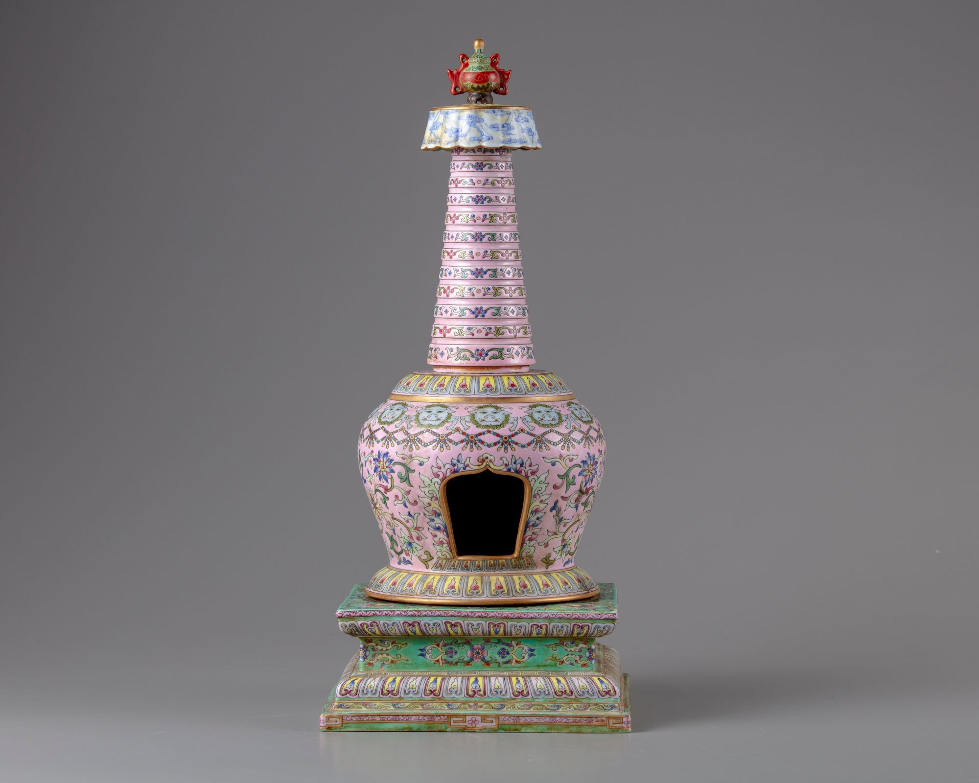 The stupa is decorated and gilt with scrolling lotus below monster masks linked by beaded chains. The shrine supports a series of graduated sections, each tier is decorated with a narrow floral band. The tapering column is surmounted by a skirted cap supporting a beribboned Treasure Vase, one of the Eight Buddhist Emblems. The stupa supported on a square base decorated with bands of lappets and floral scrolls on a green ground. The underside is enamelled turquoise.