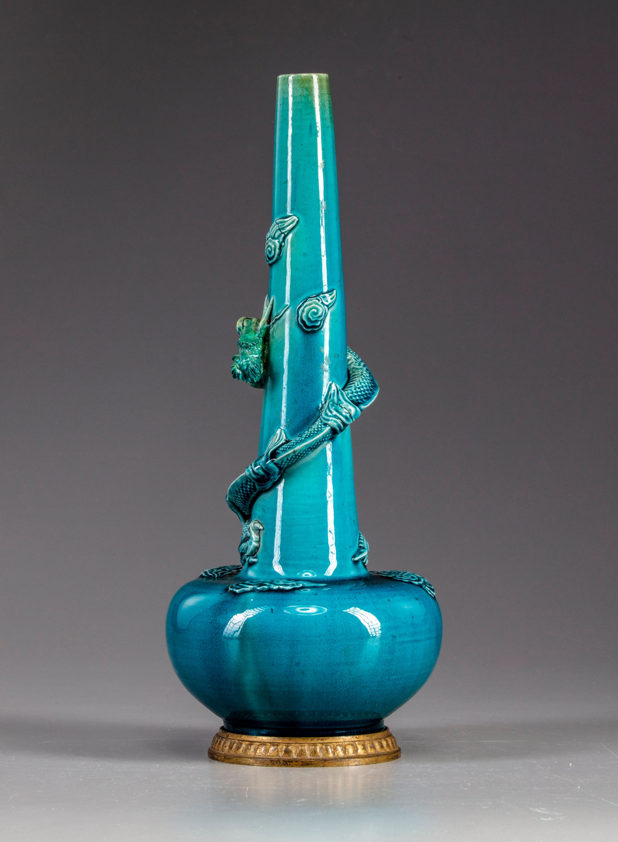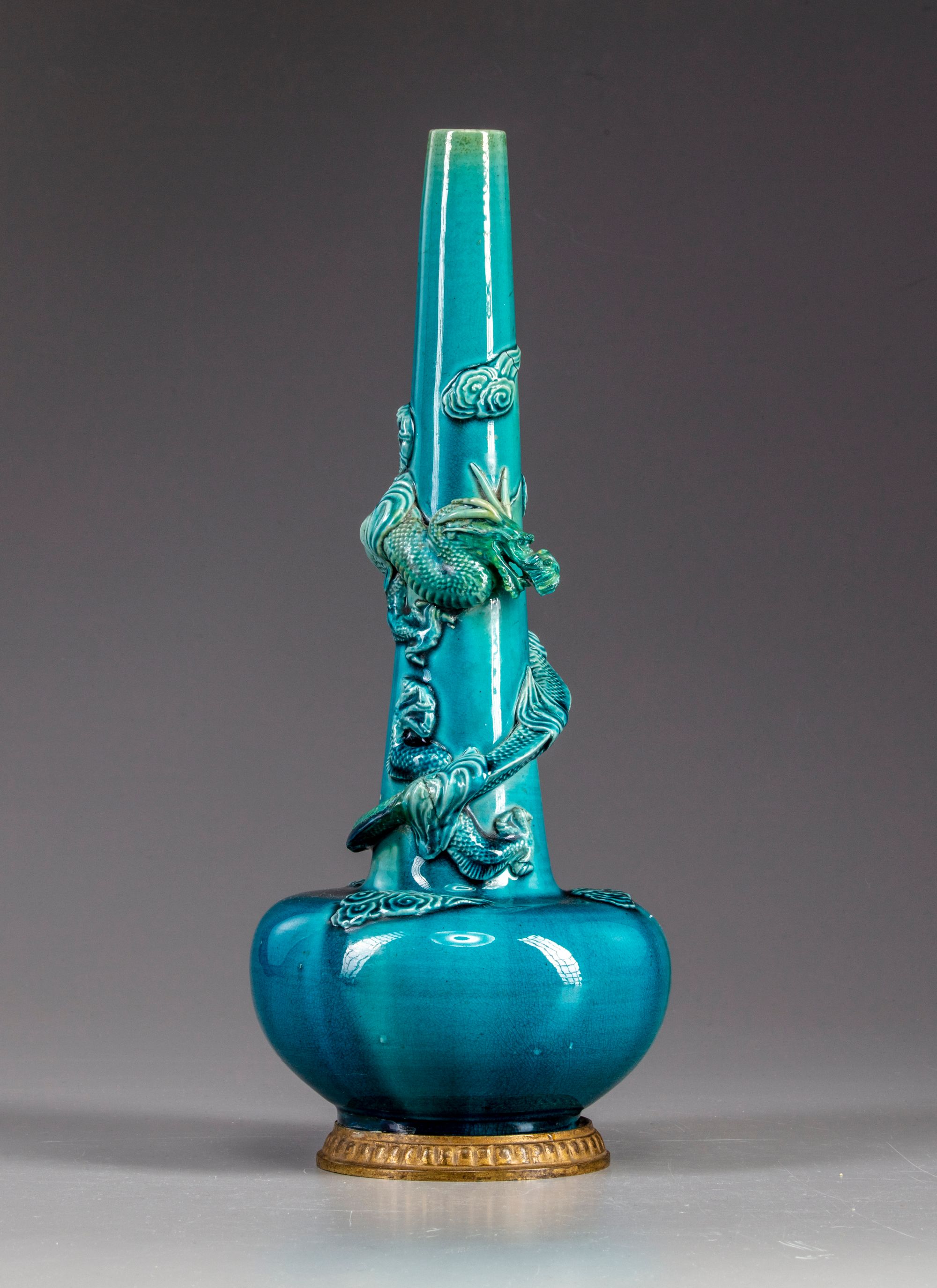 The vase is decorated to the squat body with three cloud scrolls, the tapering long neck is surrounded by a three-clawed moulded and applique dragon amongst clouds. The foot is bound with a metal rim.