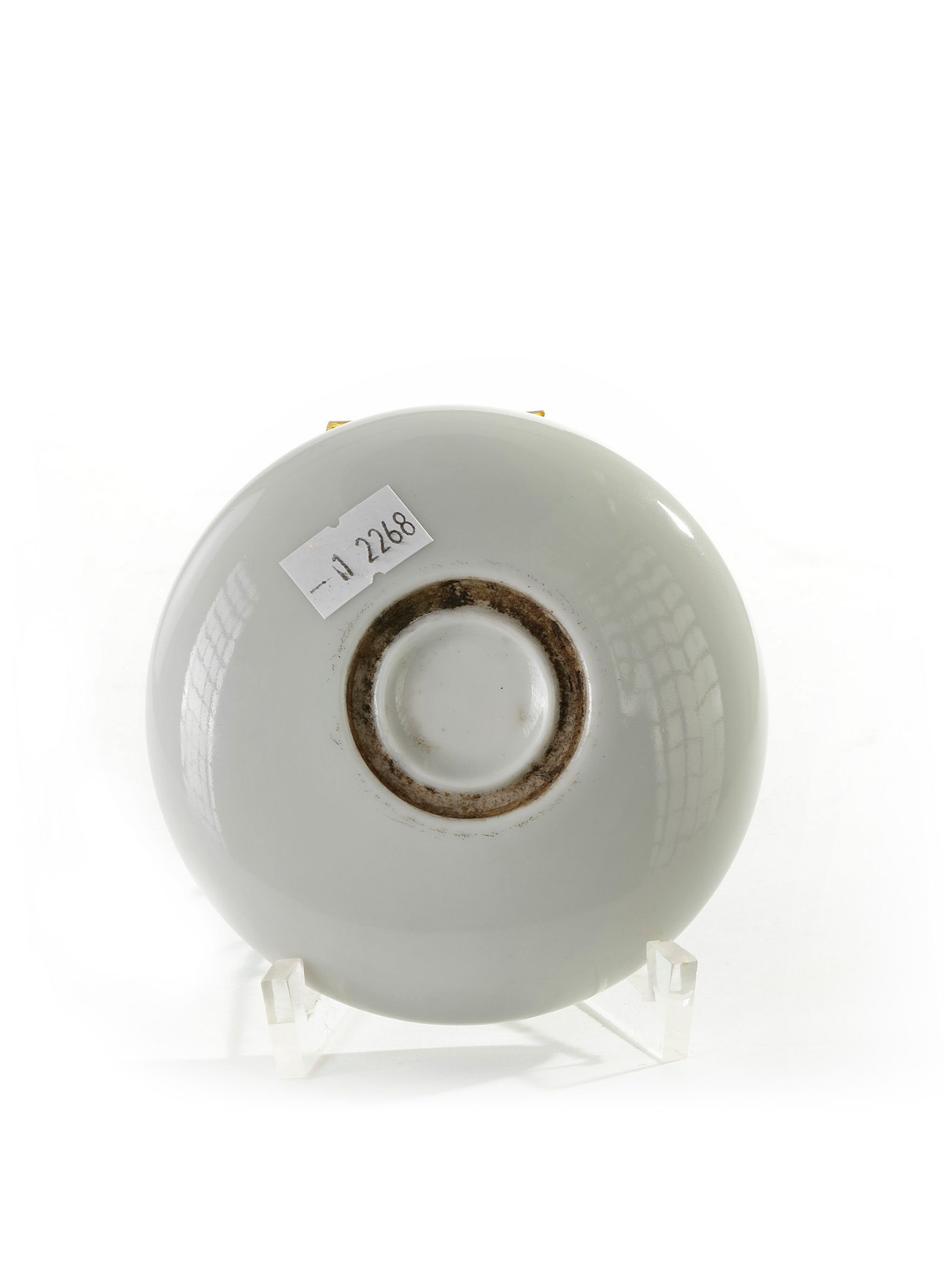 The circular washer is crafted with an inward curled lip, the interior is decorated with a cricket perched upon a flowering chrysanthemum. The scene is entitled 'dong li qiuse' which may be translated as 'fall colours by the eastern fence', and is date gengchen year and with the signature of Li Mingliang.