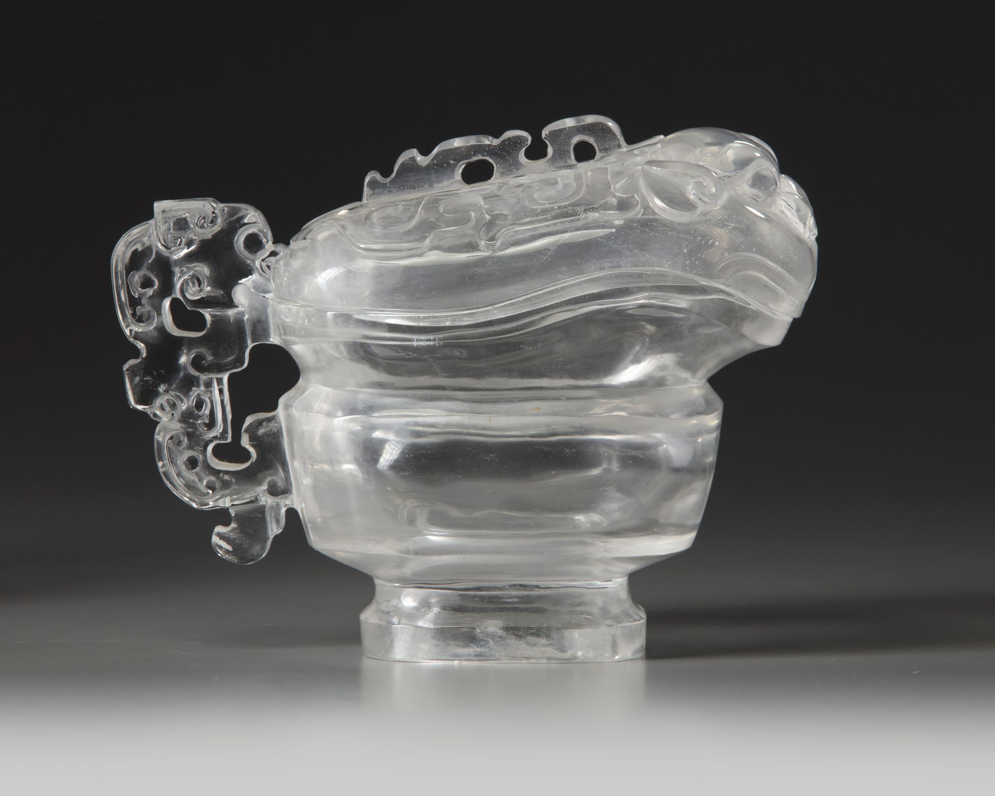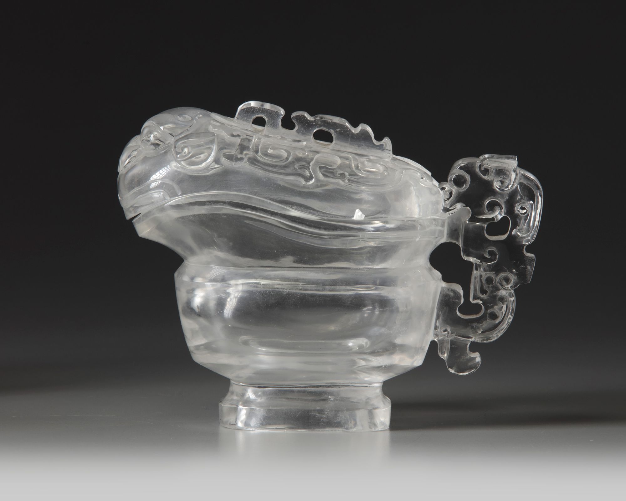 The archaistic pouring vessel is carved with a stylised dragon handle to one side. The cover carved with kui dragons flanking a raised flange to the spine which leads to a mythical beast head.