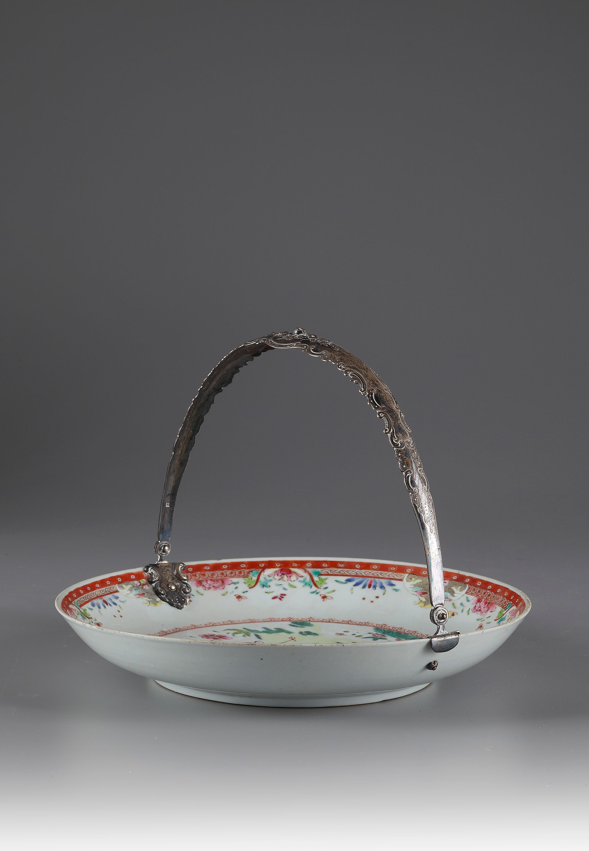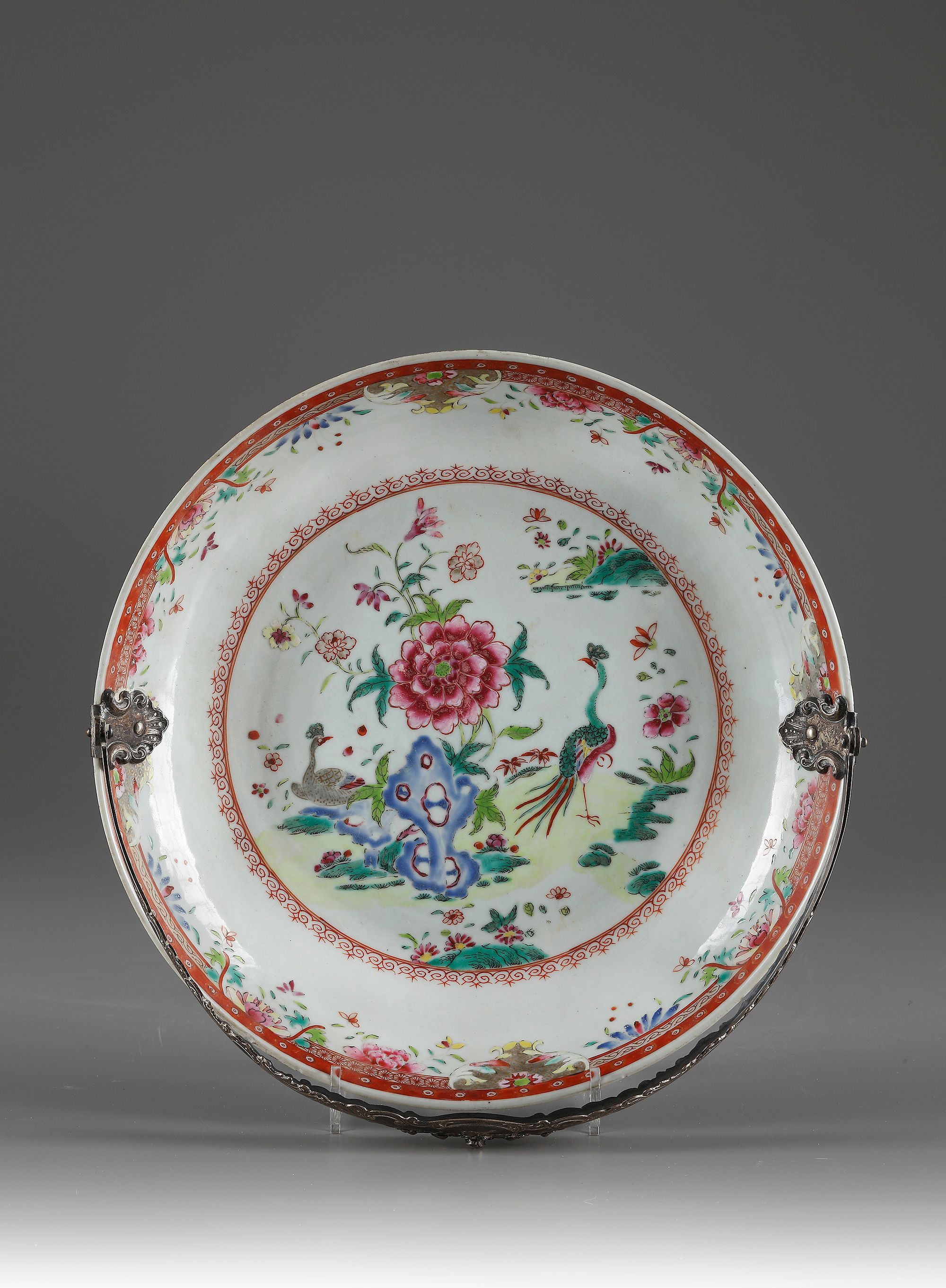 with a central decoration of two phoenixes within a rocky garden scene, mounted with a 19th century silver handle.