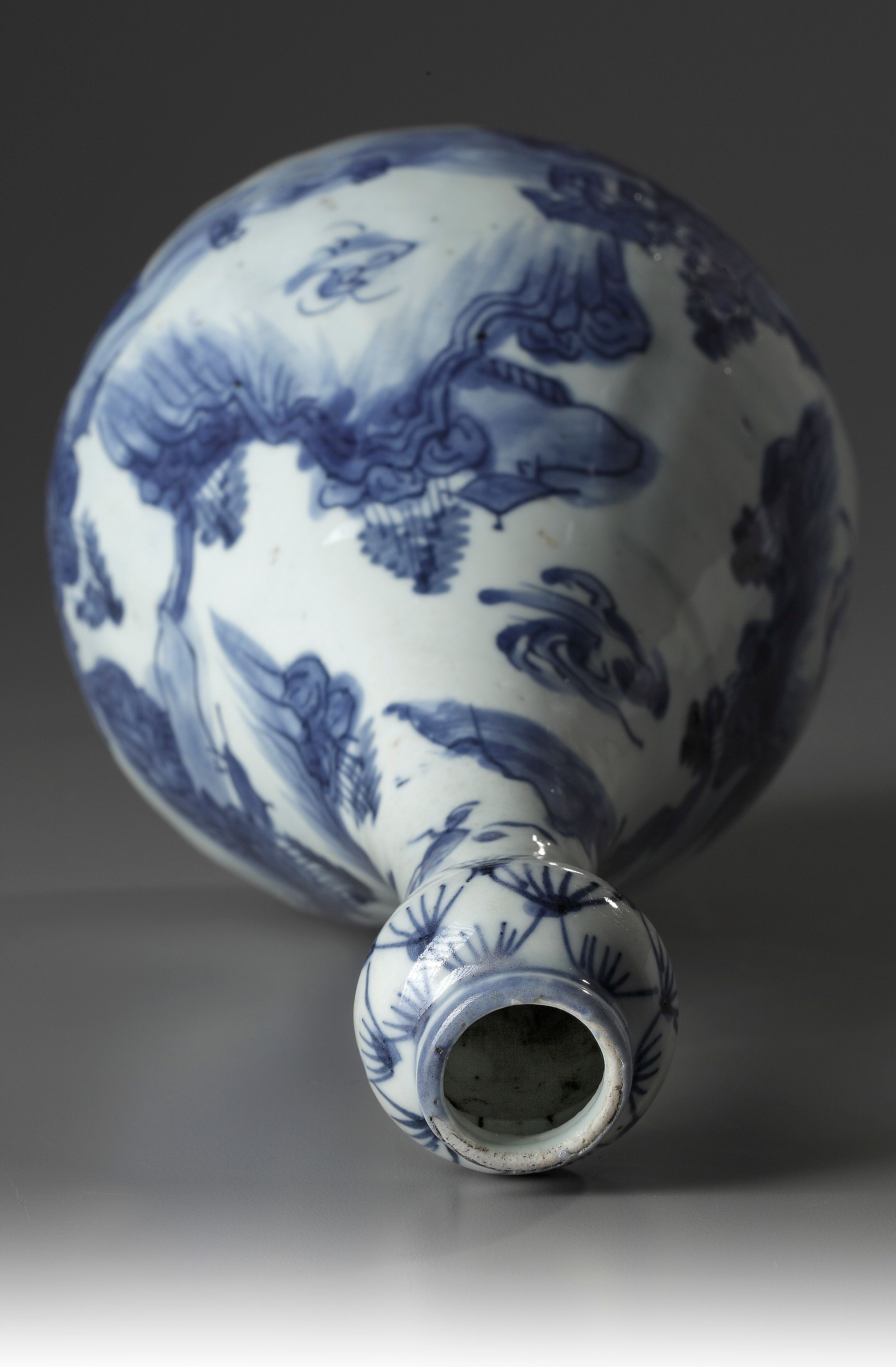 The pear-shaped vase with slender neck ending in a garlic-head mouth, decorated in underglaze blue with a continuous scene of figures amongst pavilions in a mountainous river landscape. The mouth is decorated as a lotus head.
