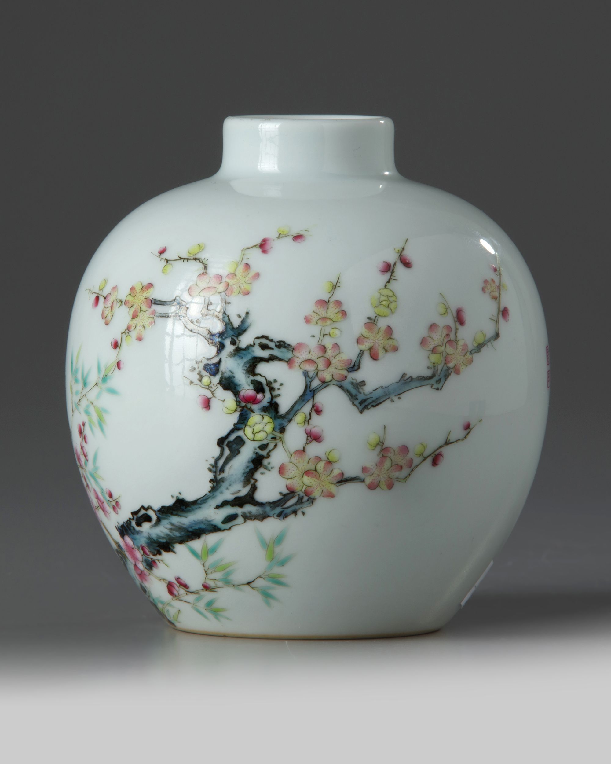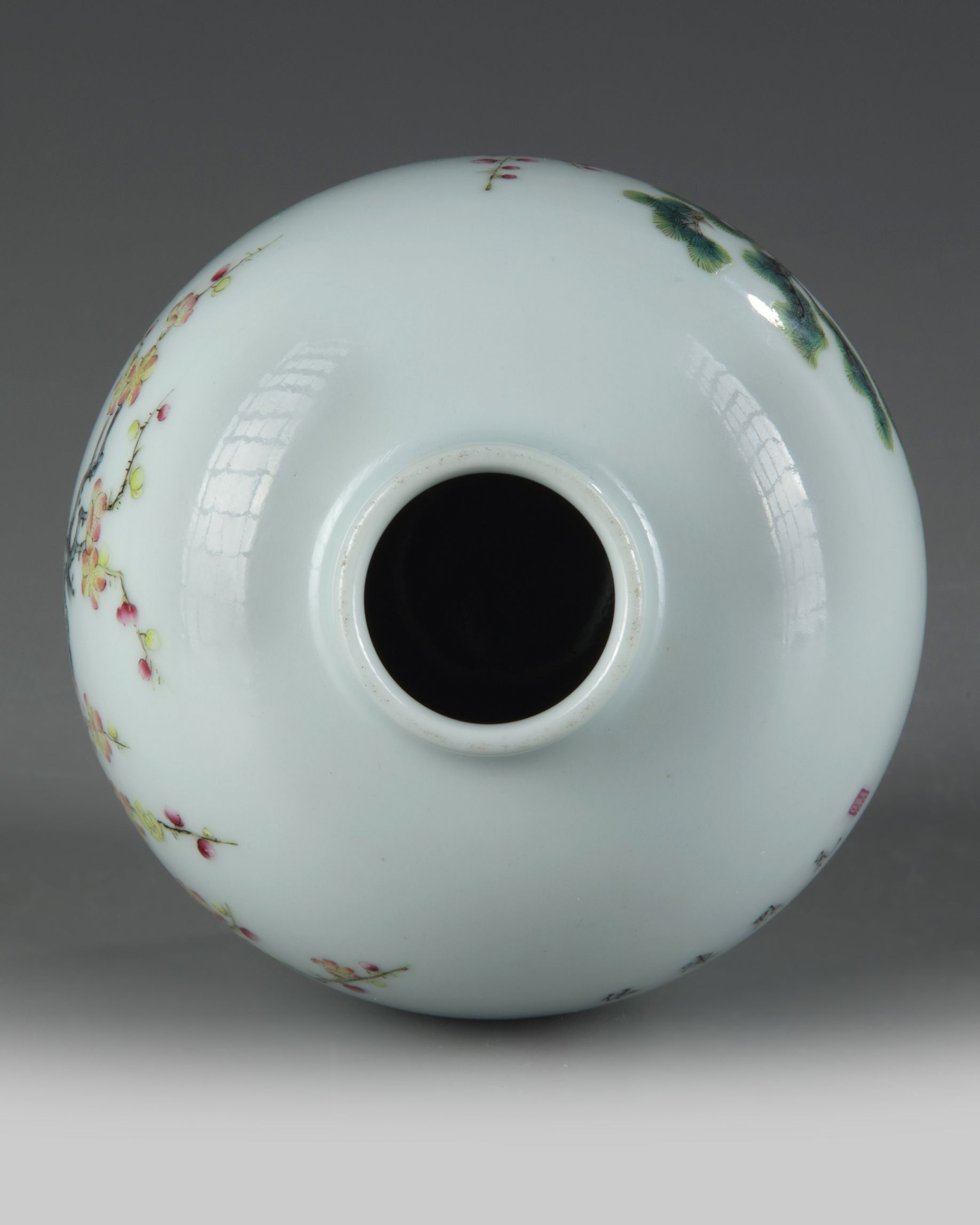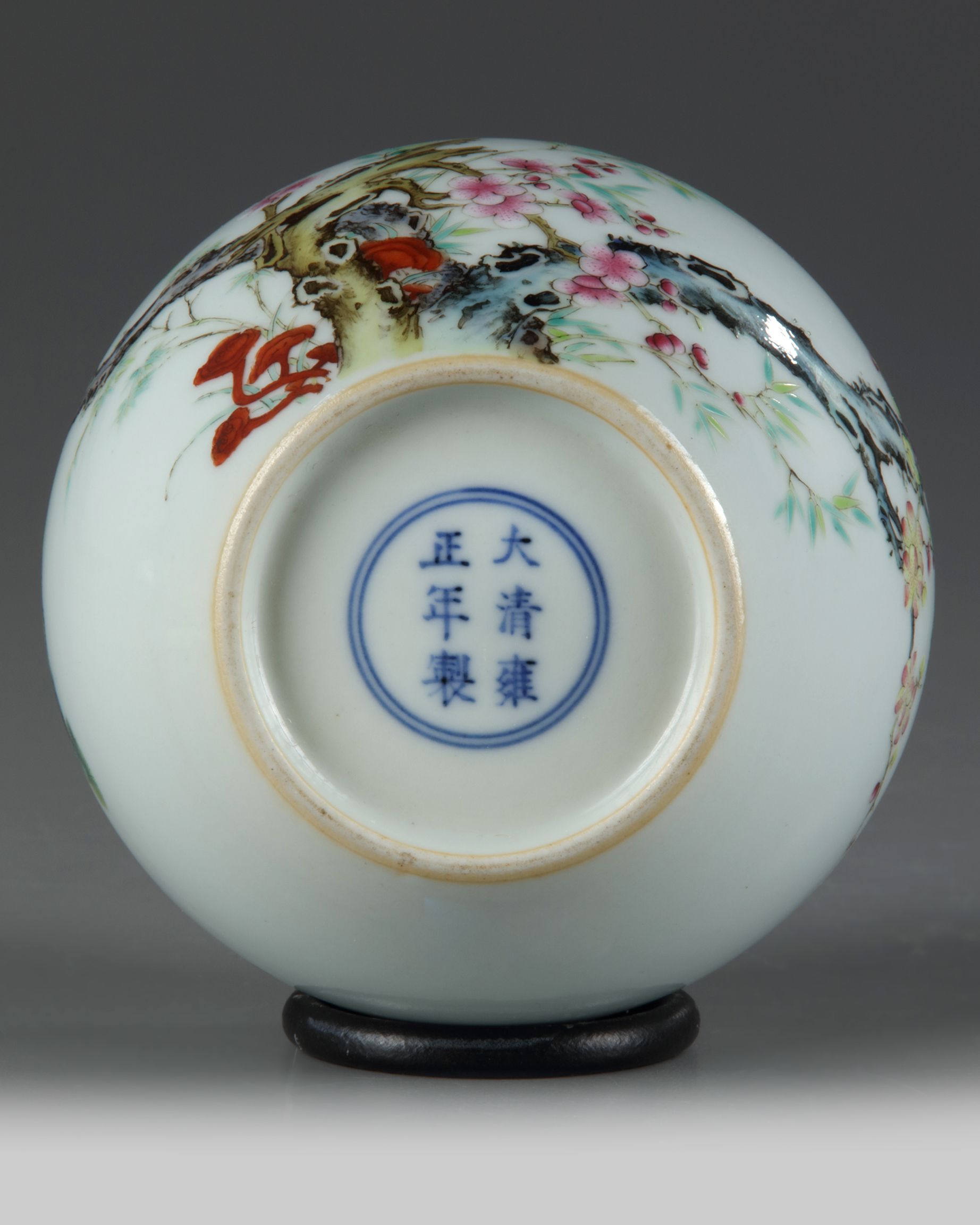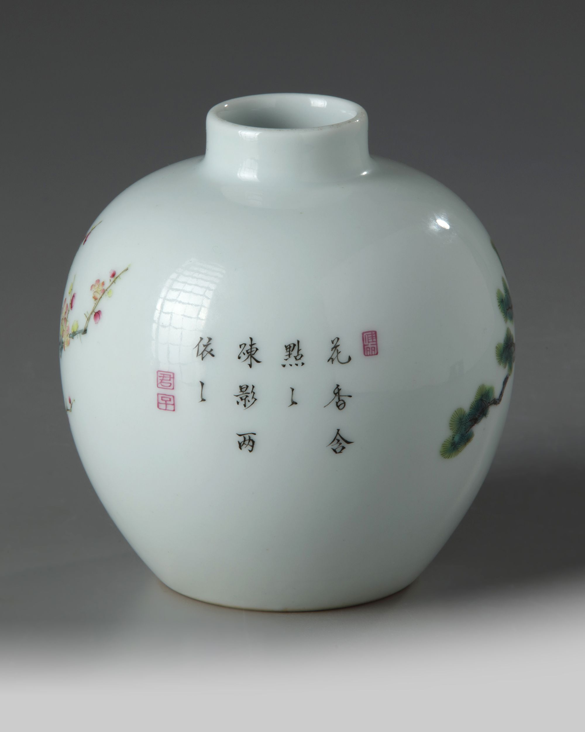 The exterior is decorated with the Three Friends of Winter, pine, prunus, and bamboo amongst lingzhi, the reverse is inscribed with a poem about flowers. The base with an apocryphal Yongzheng mark.