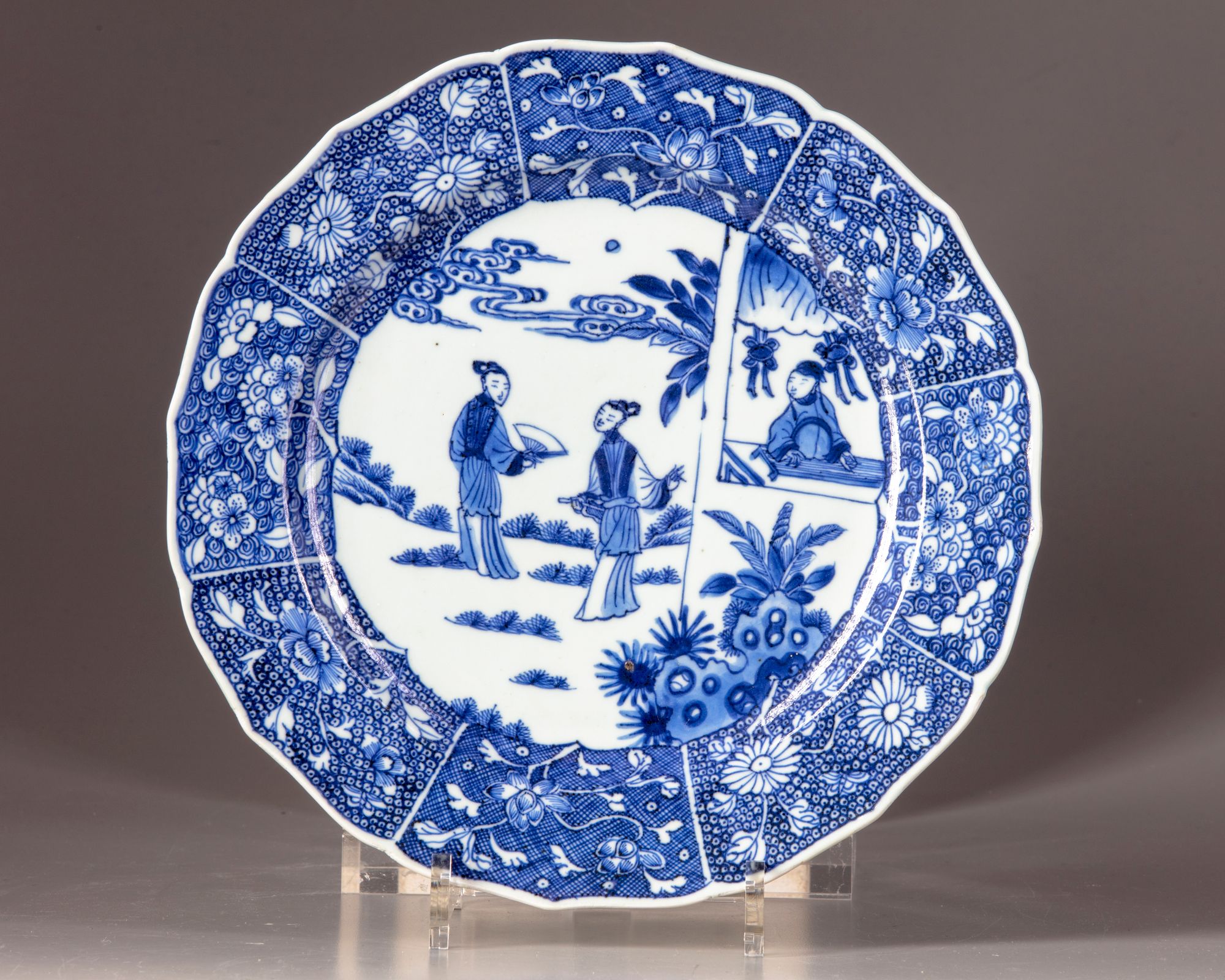 The dish is decorated to the interior with a scene from the story the 'Romance of the Western Chamber' with the scholar Zhang Shen playing the qin and Cui Yingying and her maid listening outside, further painted with panels enclosing flowers and foliage.