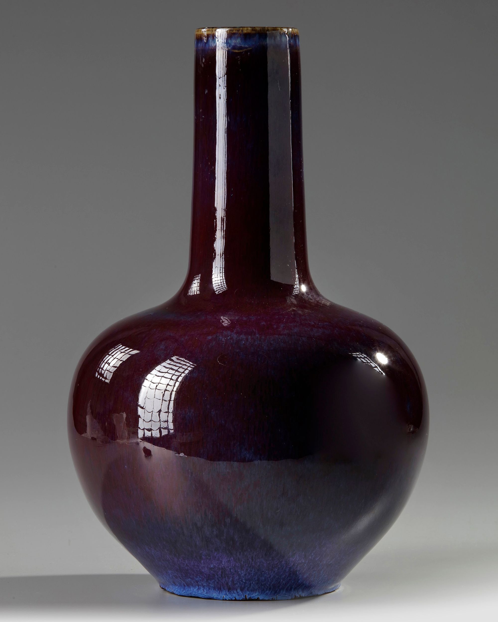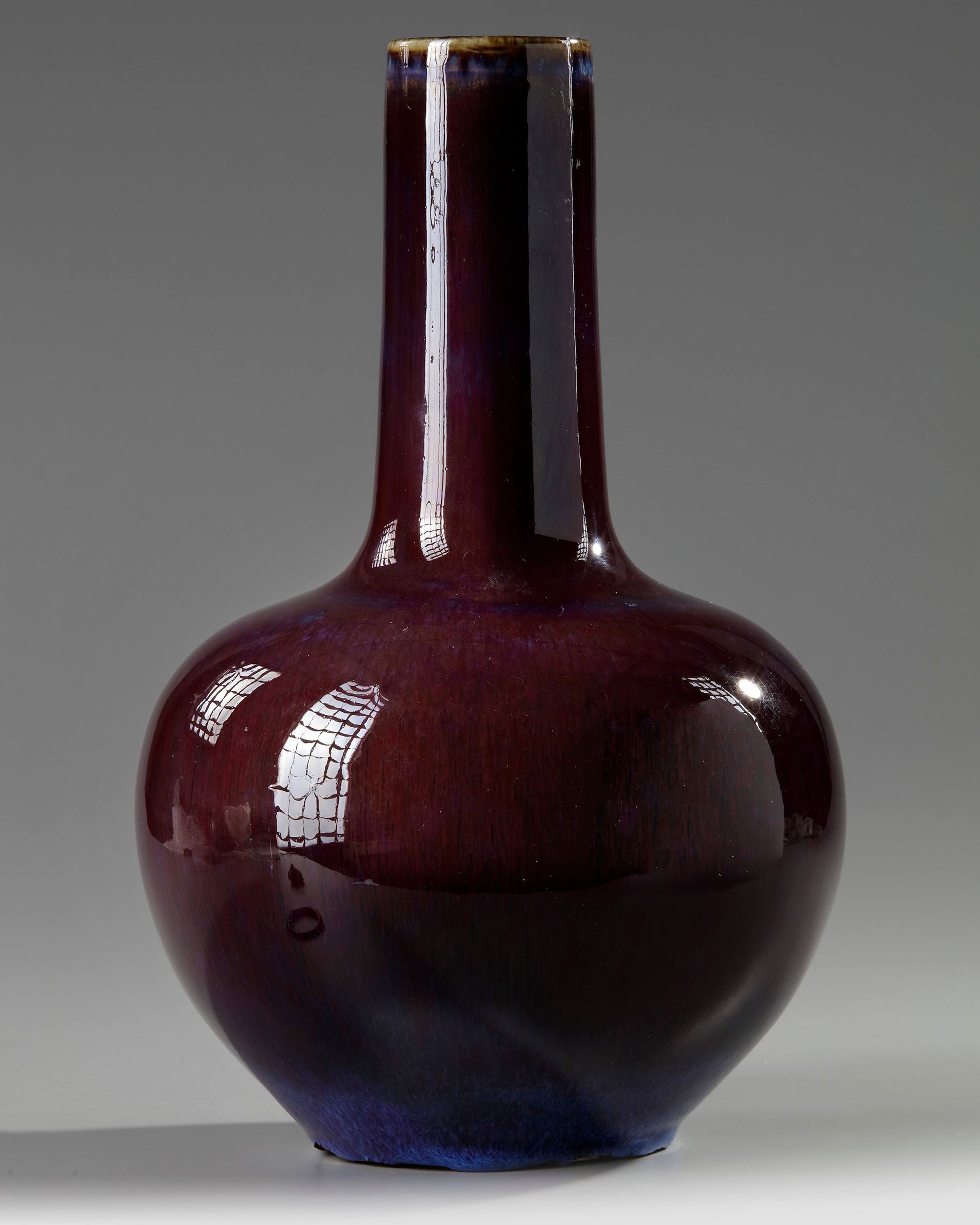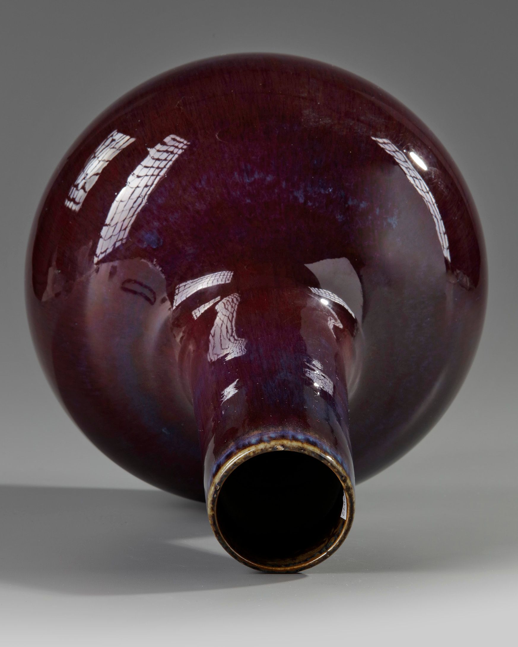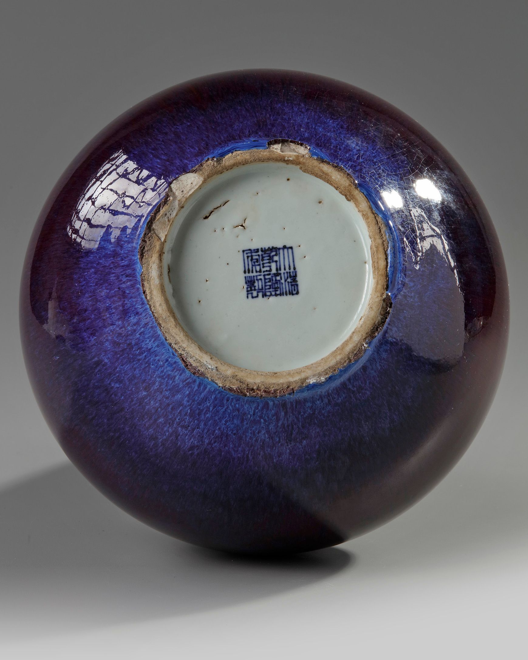 The vase is modelled with a globular body, straight neck, and slightly inverted mouth rim. It is covered allover with a thick, lightly crackled, deep red glaze suffused with purple, lavender, and pale blue streaks and thins at the rim to a mushroom tone. The base with an apocryphal Qianlong mark. 35.5 cm.