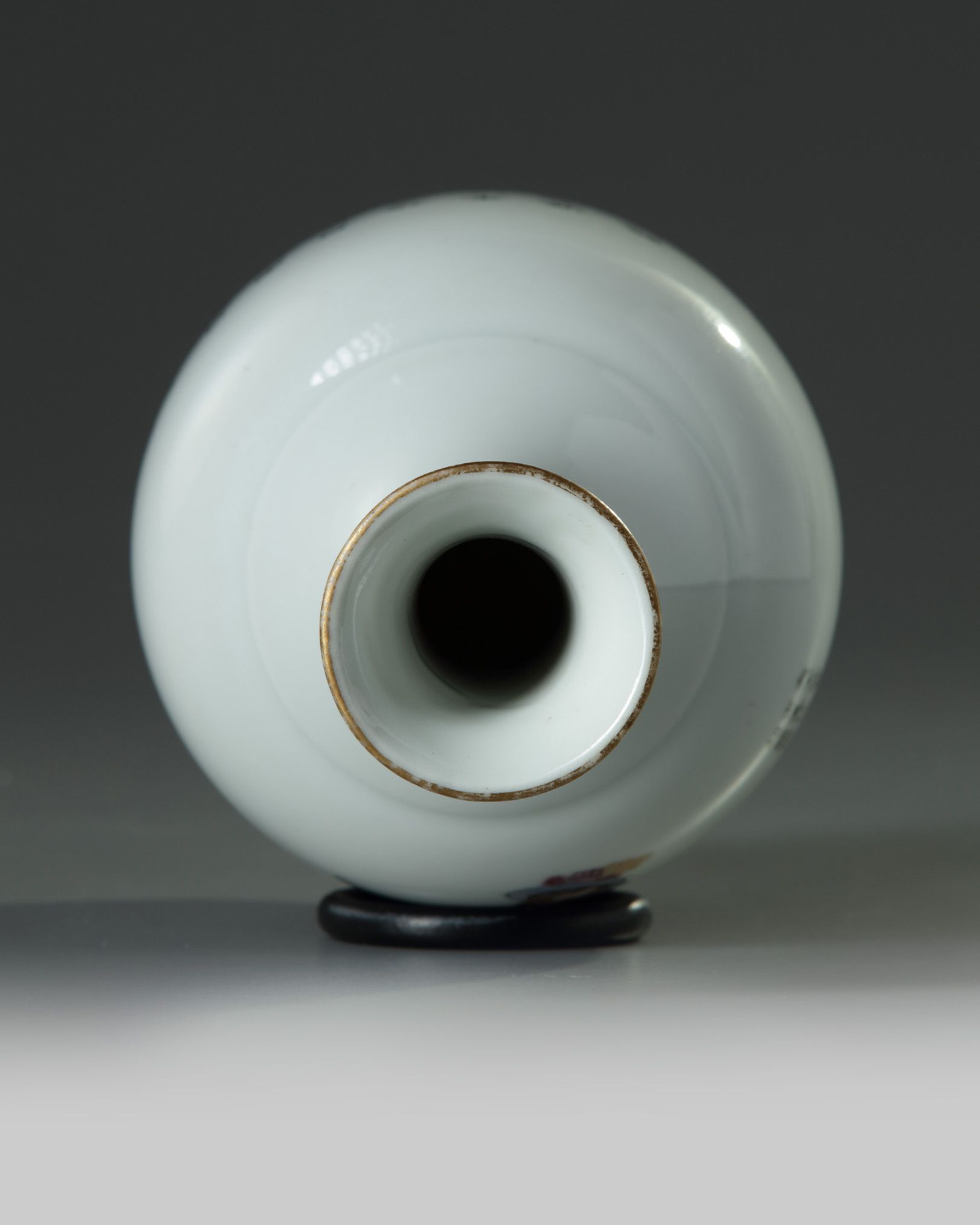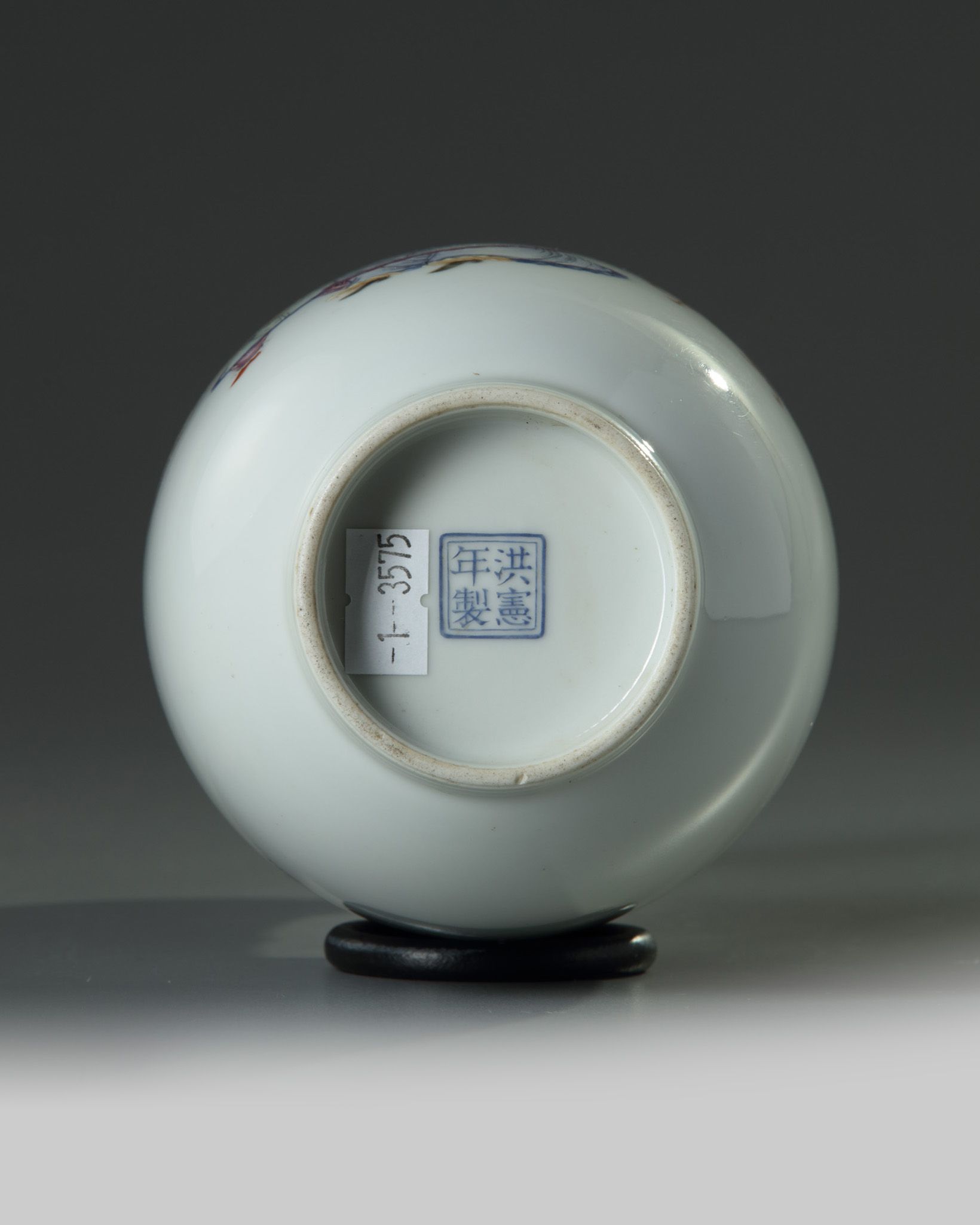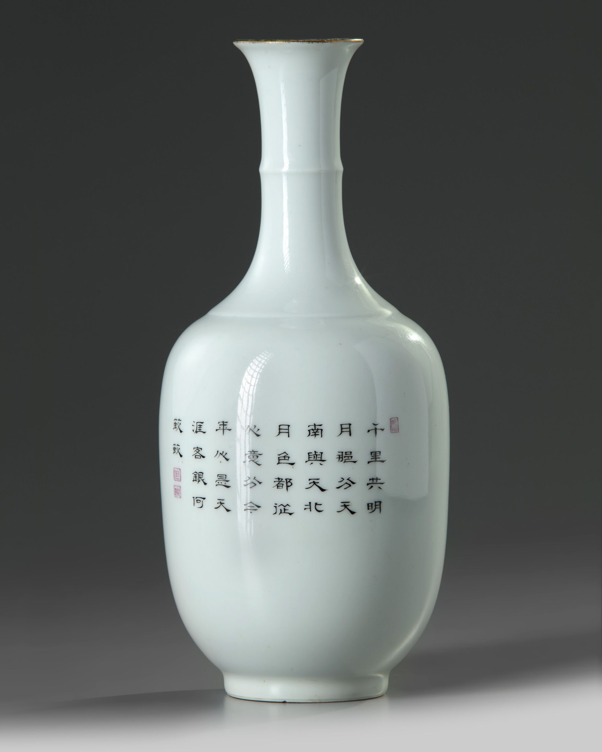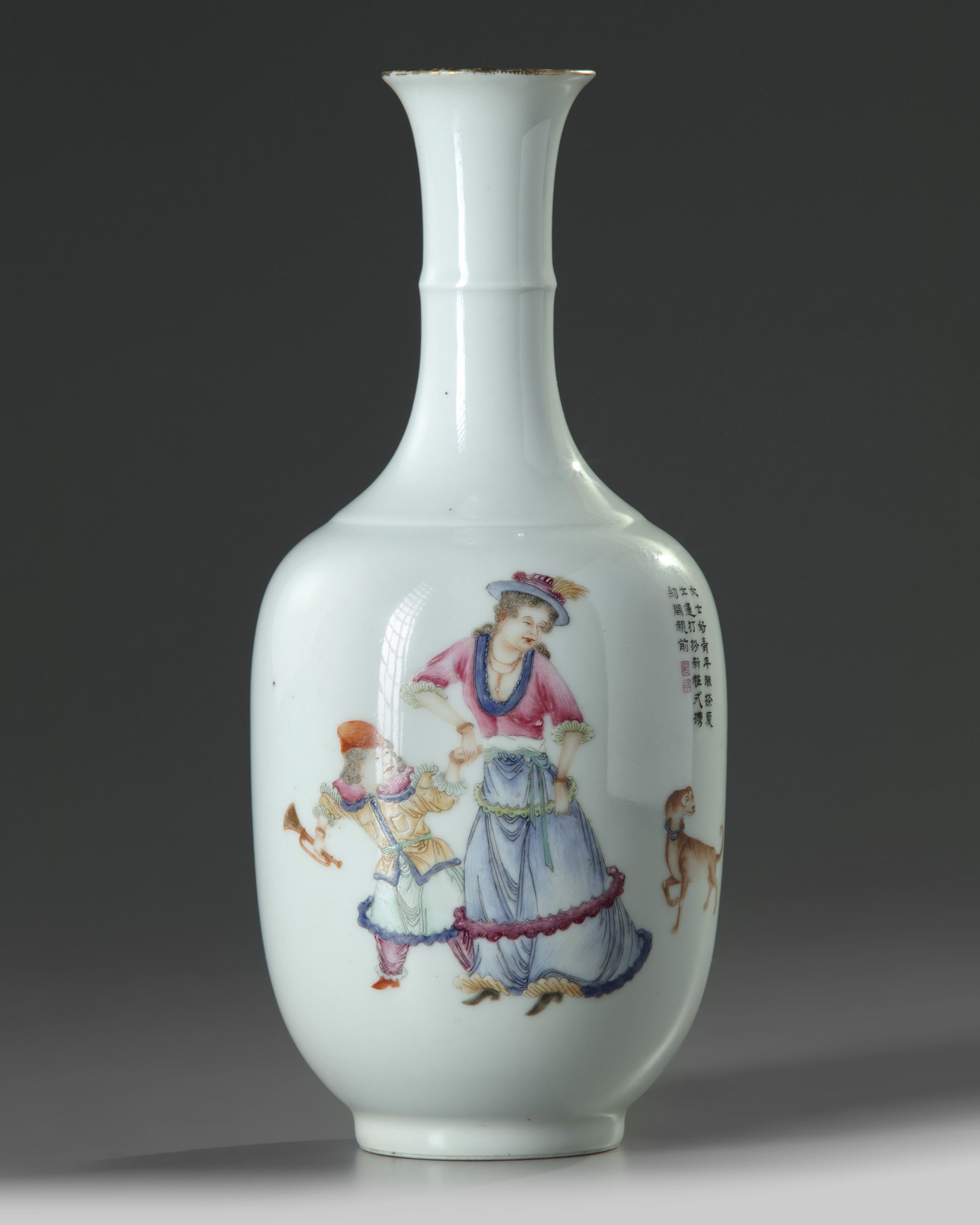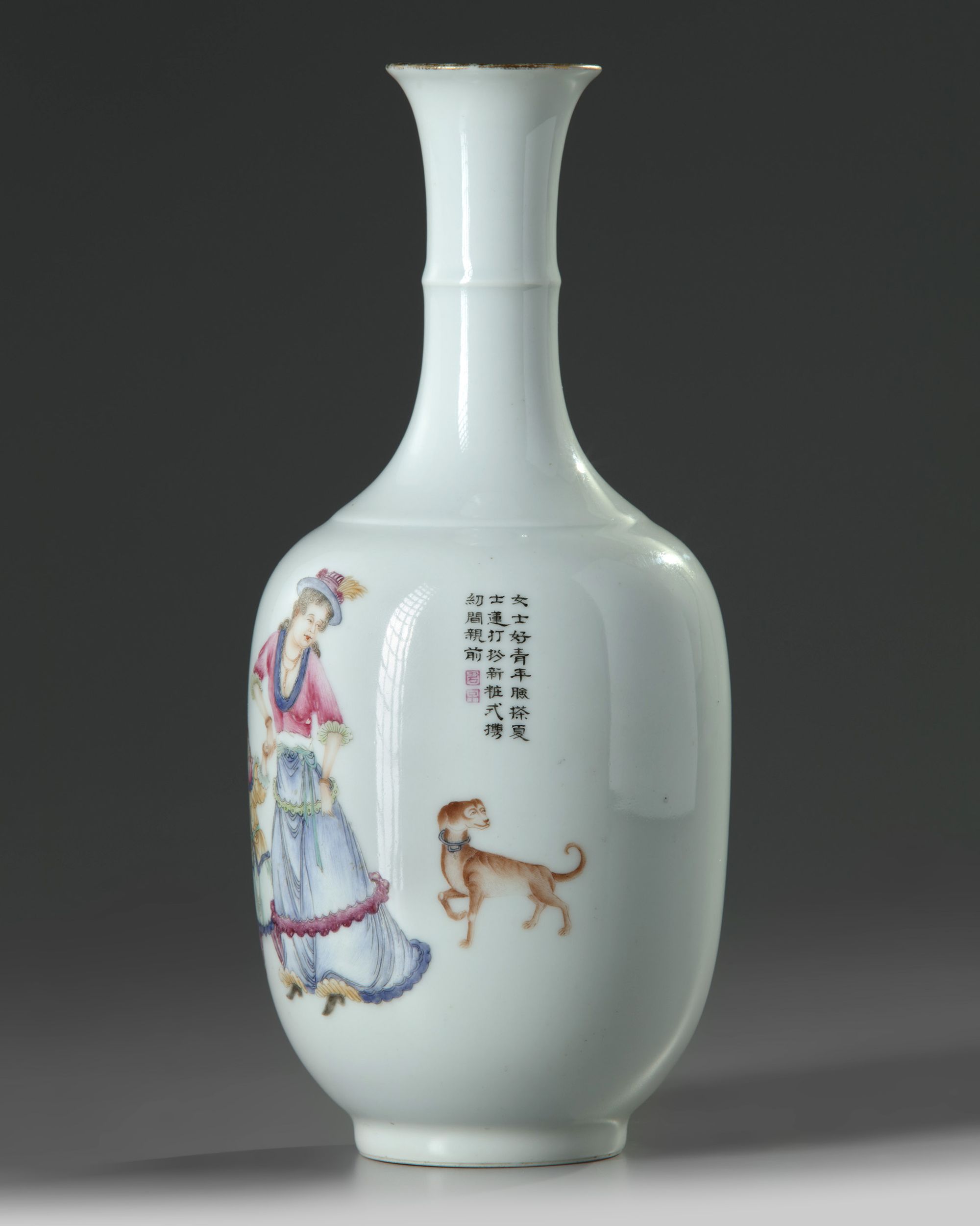 The vase is delicately enamelled with an elaborately-dressed European lady, a boy, and their dog, and the scene is accompanied by a poetic inscription about the figures. The reverse is inscribed with a further poem. The base with a Hongxian mark in blue enamel.