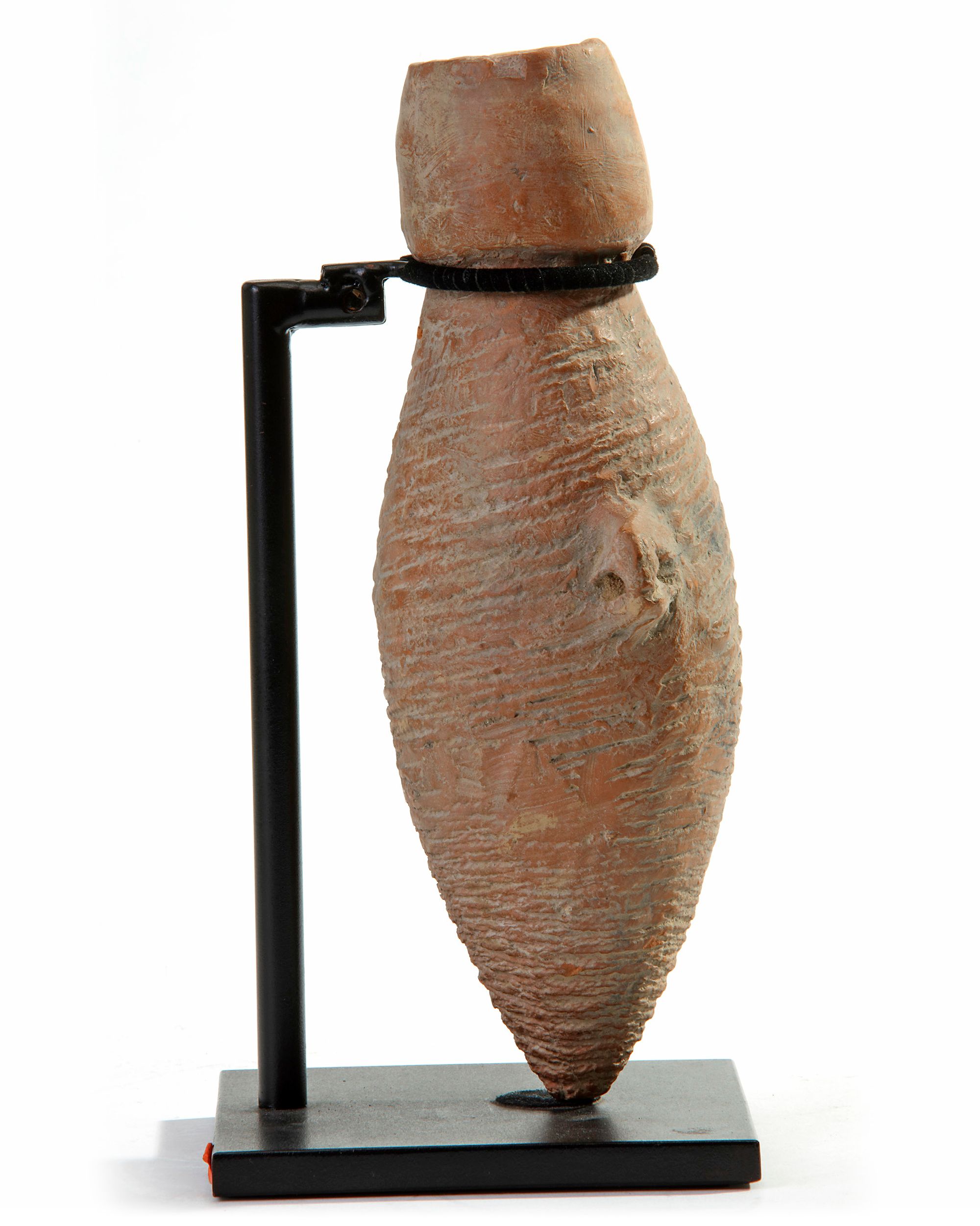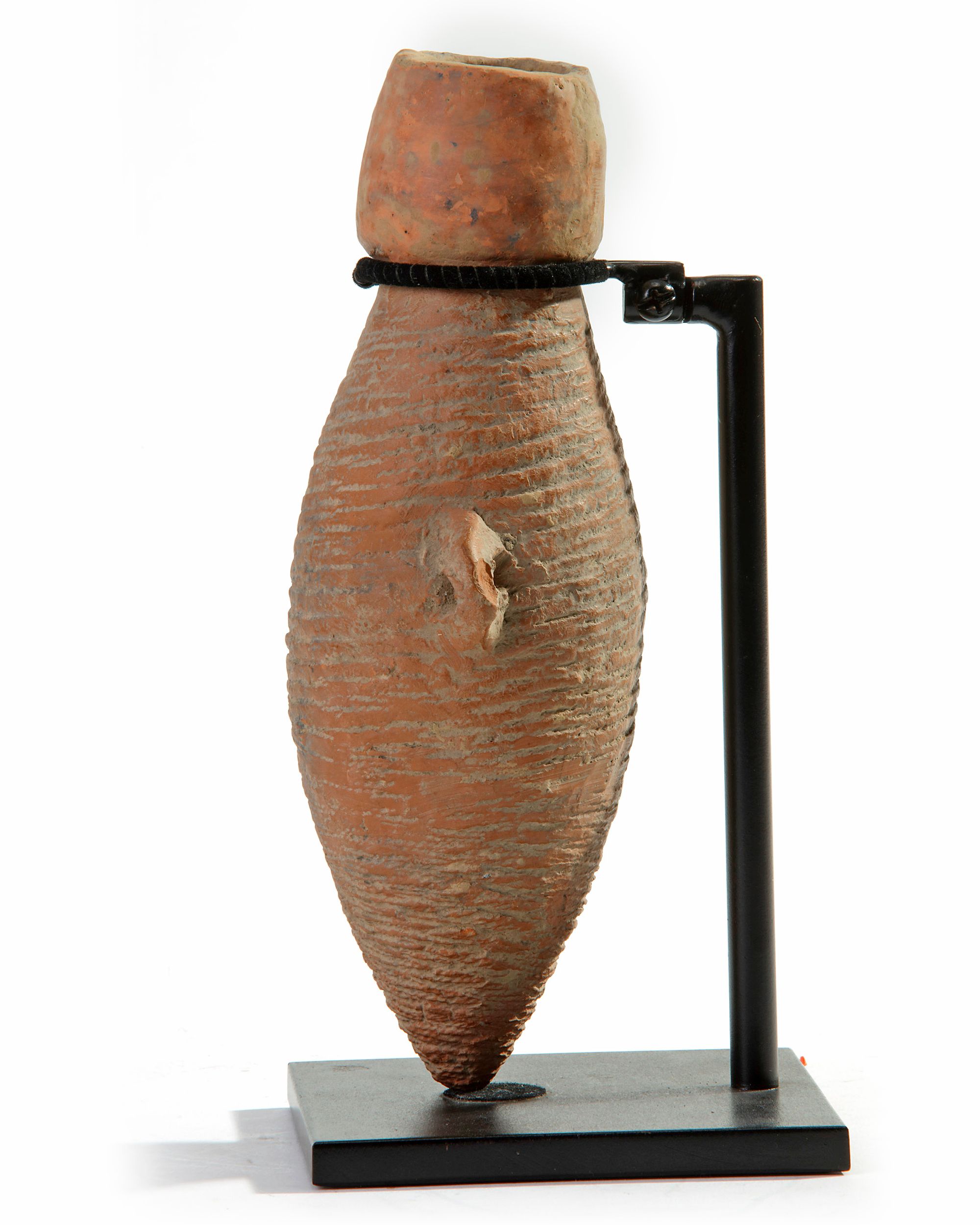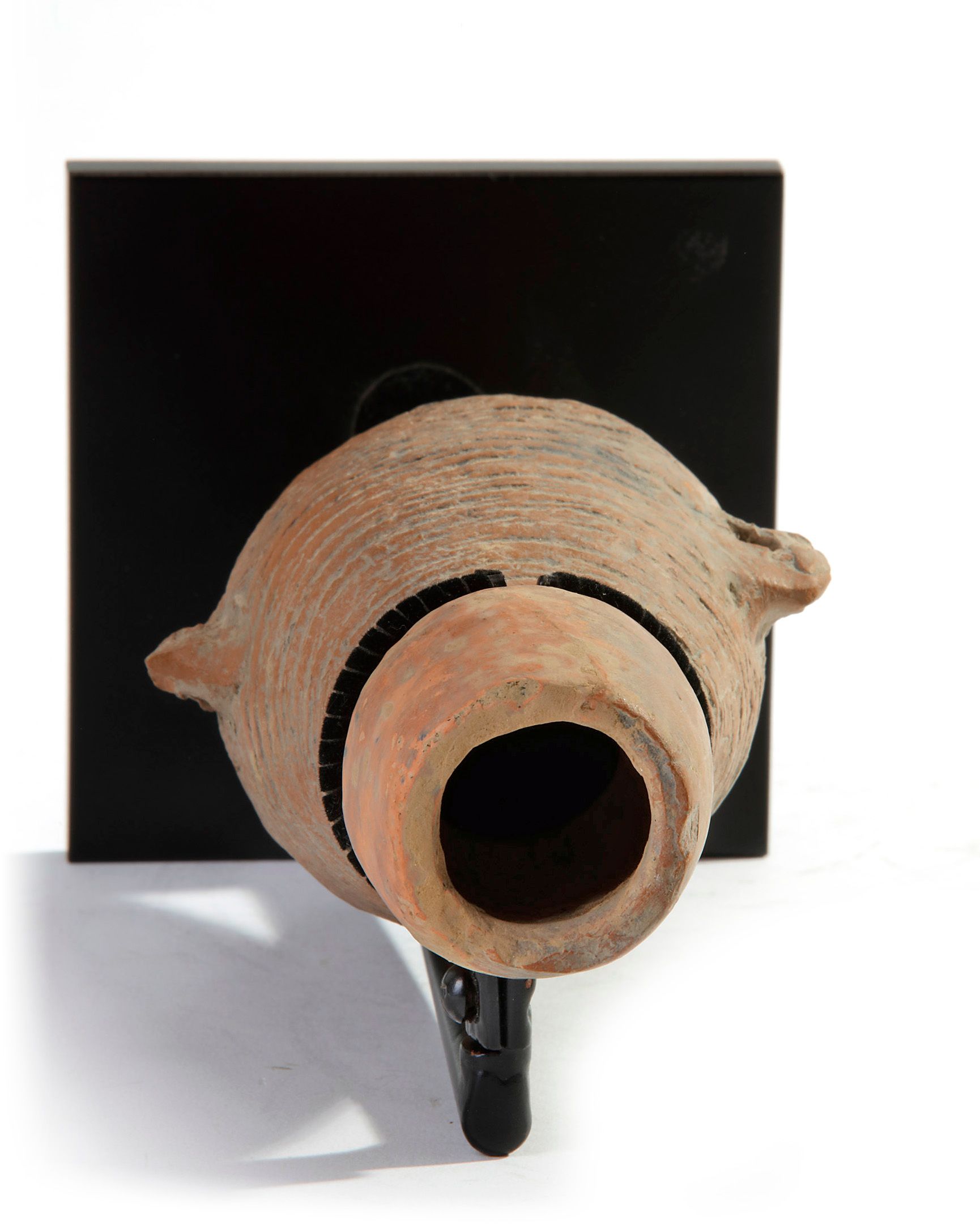 The Banpo-type ovoid body is potted tapering to a small flat base. It is decorated around the upper body with a wide band of scored diagonal lines, applied at mid-body with a pair of loop handles. The neck surmounted by a tall, curved mouth. With a stand. 22 cm.
