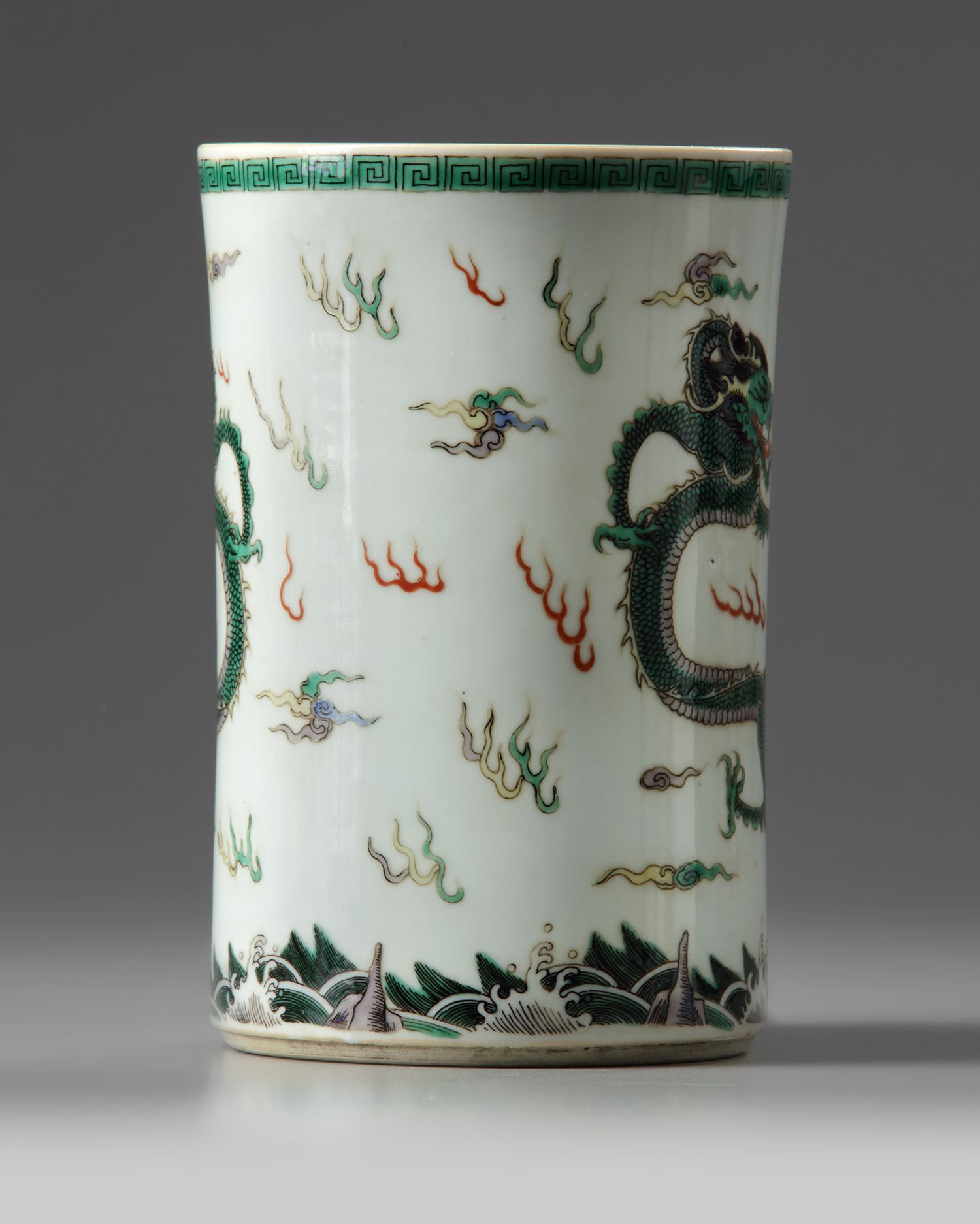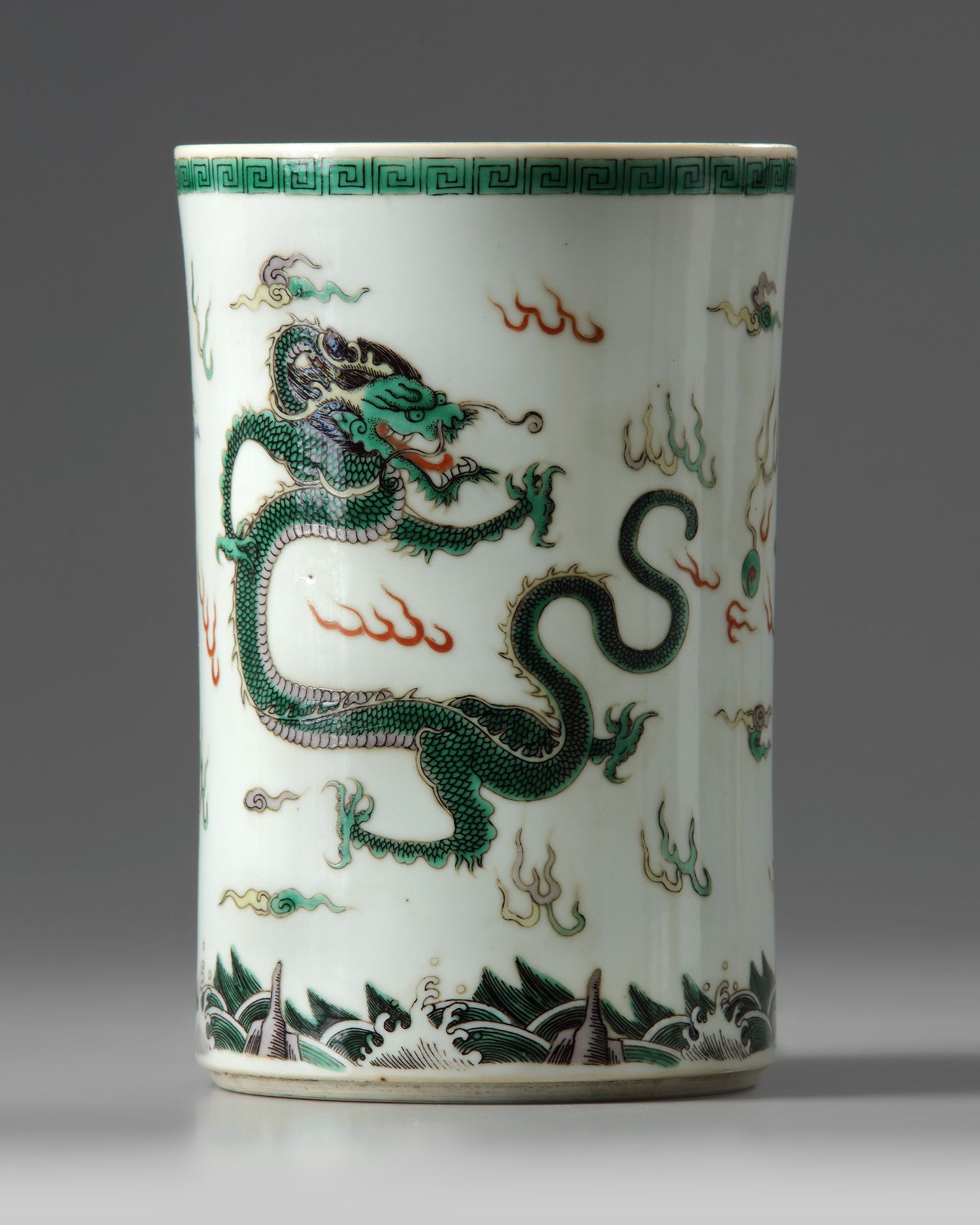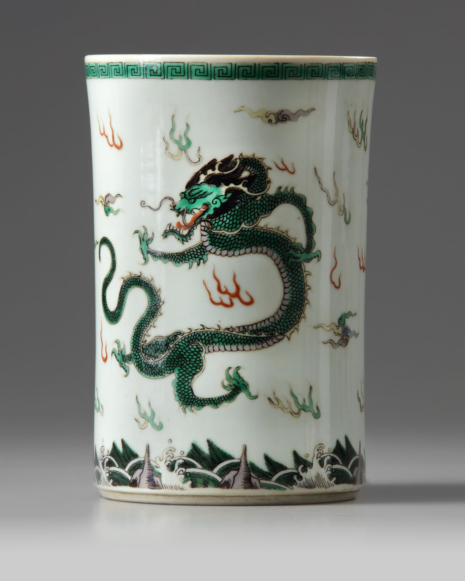 The exterior is decorated with two sinuous four-clawed dragons chasing the flaming pearl amongst flame scrolls above waves crashing on rocks at the foot.