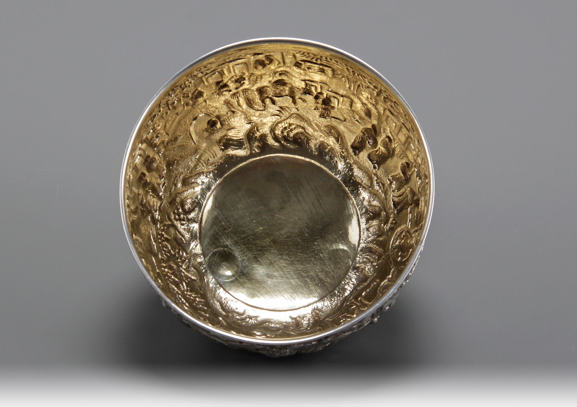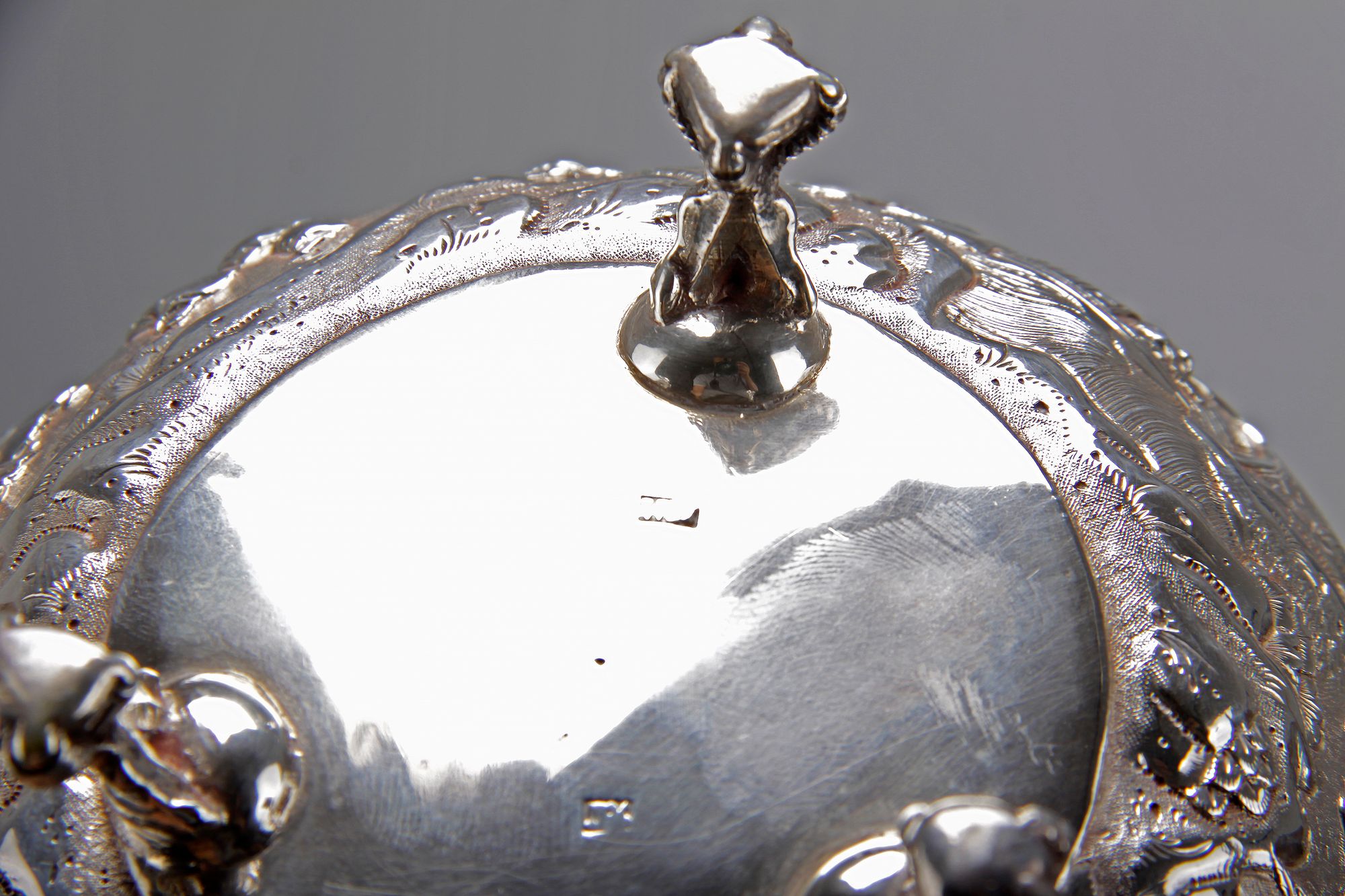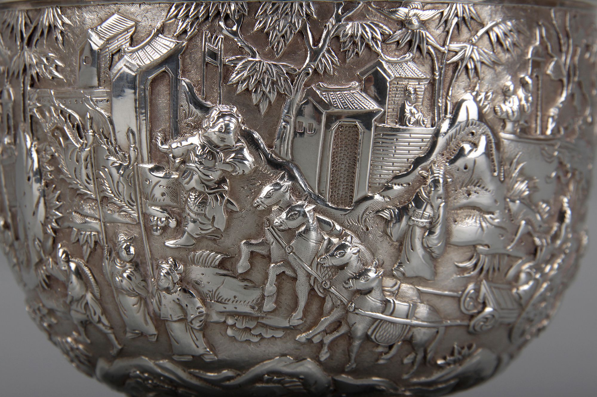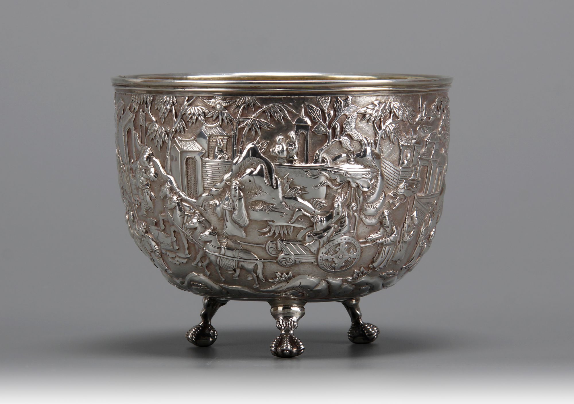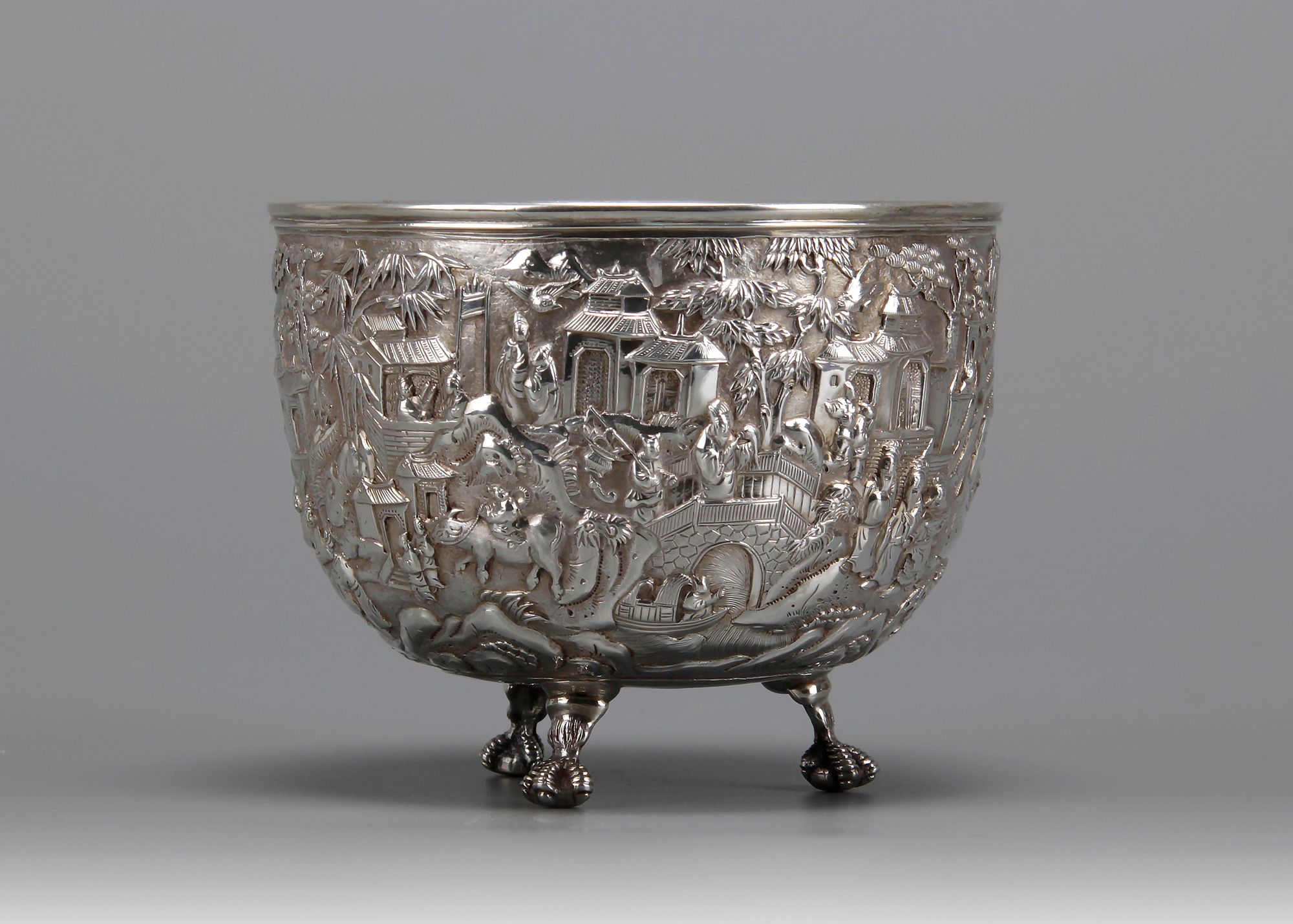 Decorated with a townscape, on three ball and claw feet Marked WH for Wang Hing