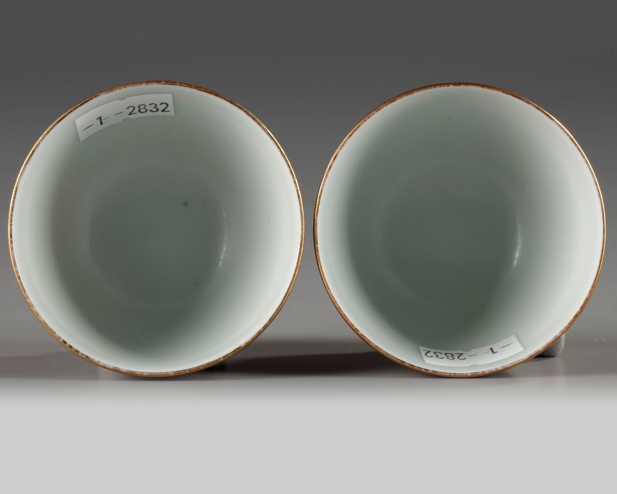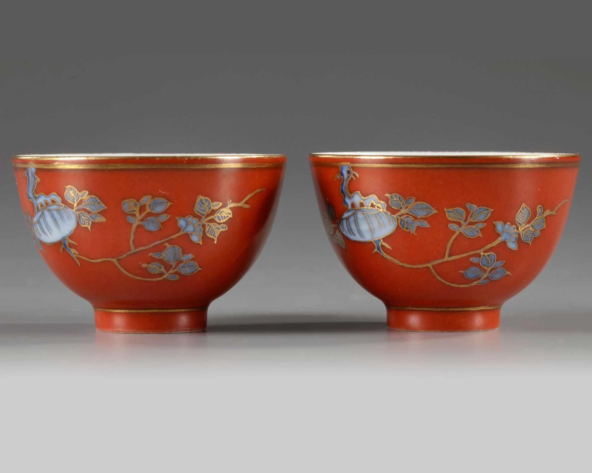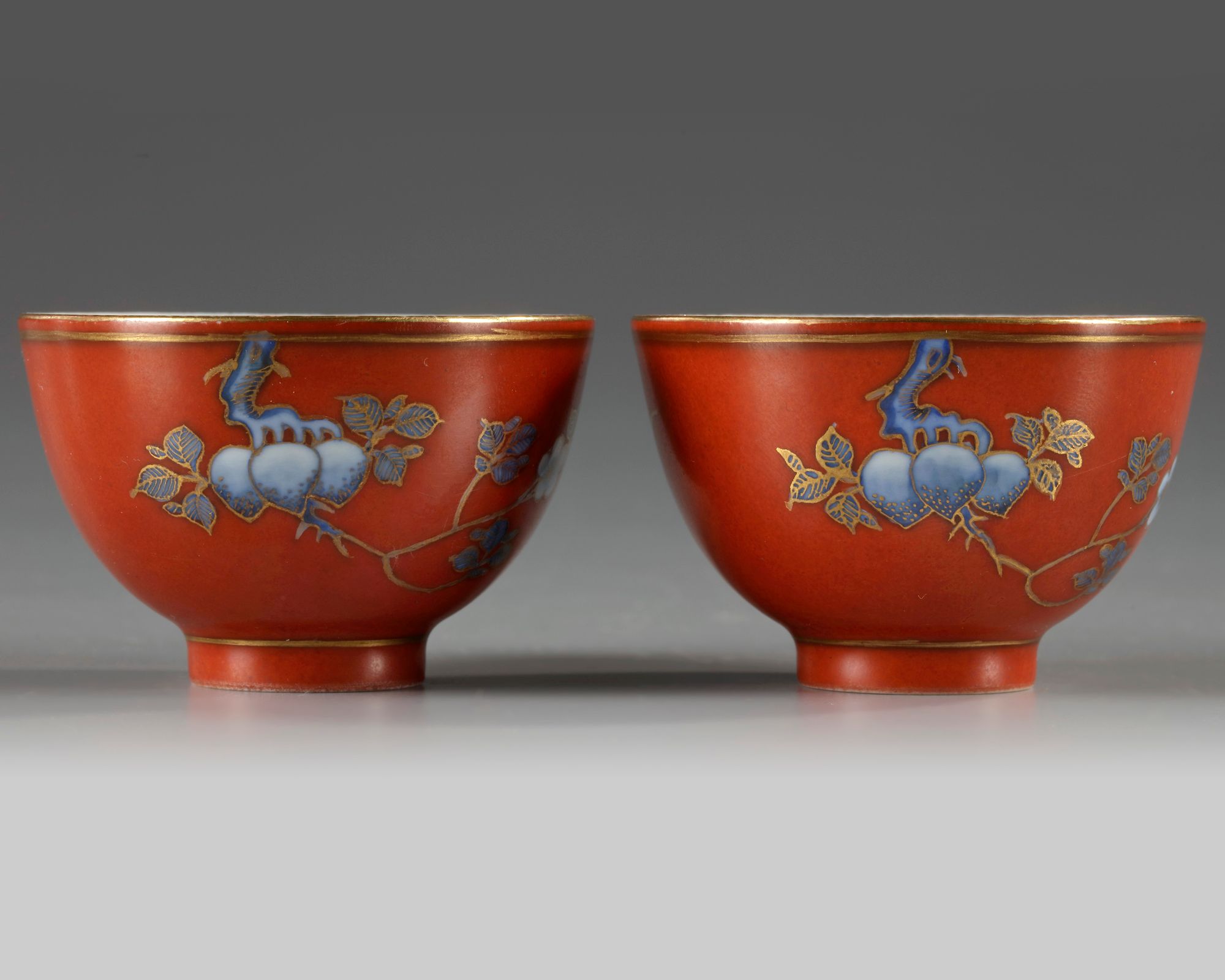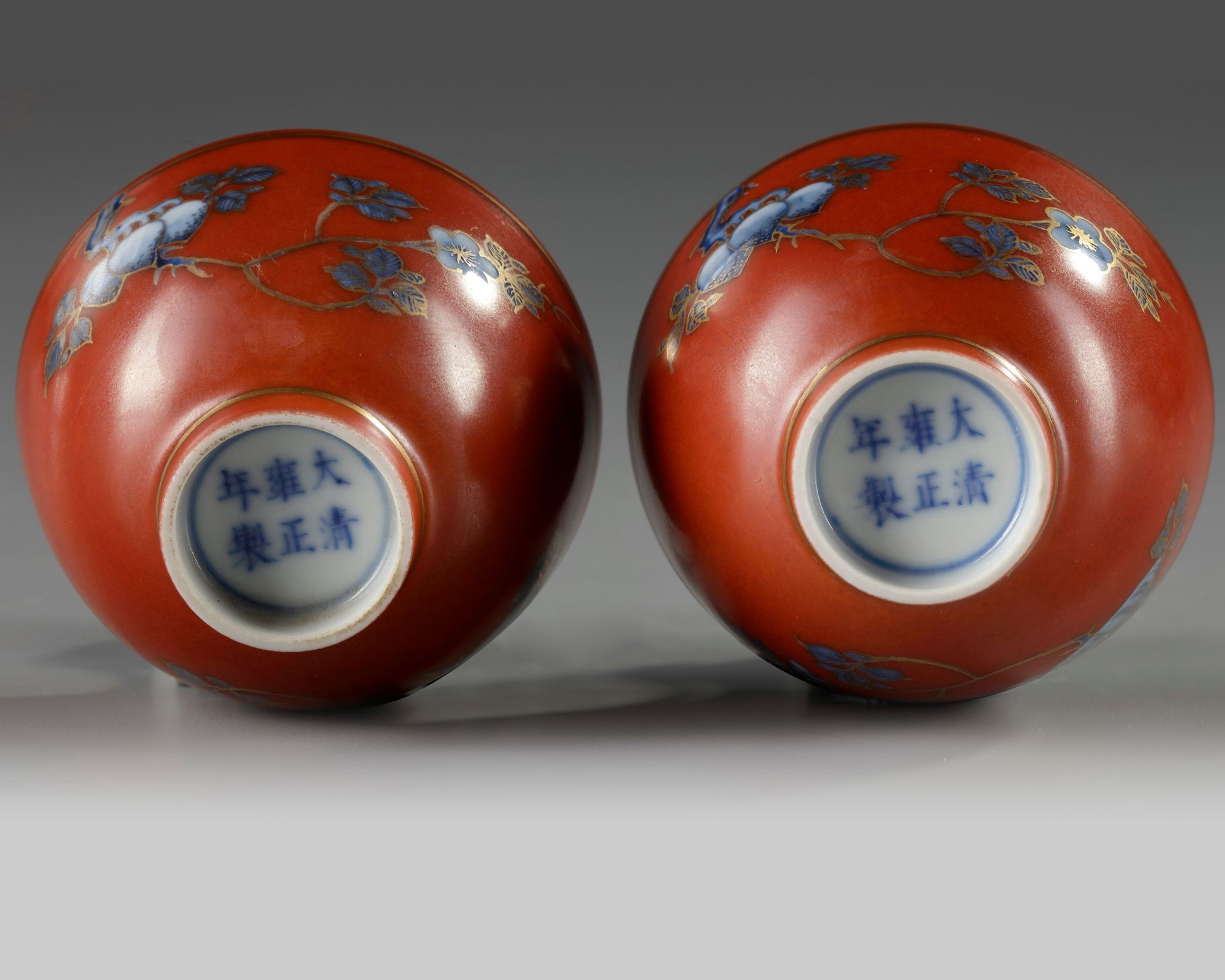 Each cup is decorated in underglaze blue with a branch stemming from the rim bearing three peaches and a single blossom, and a branch bearing a pumpkin with a single blossom, all reserved on a coral-red ground. Each base is marked with an apocryphal Yongzheng mark.