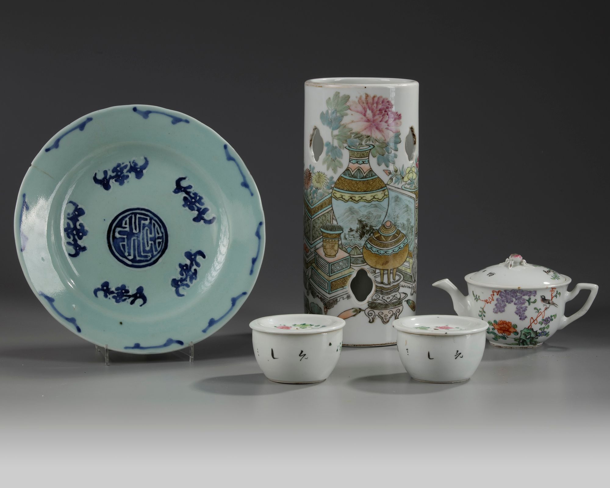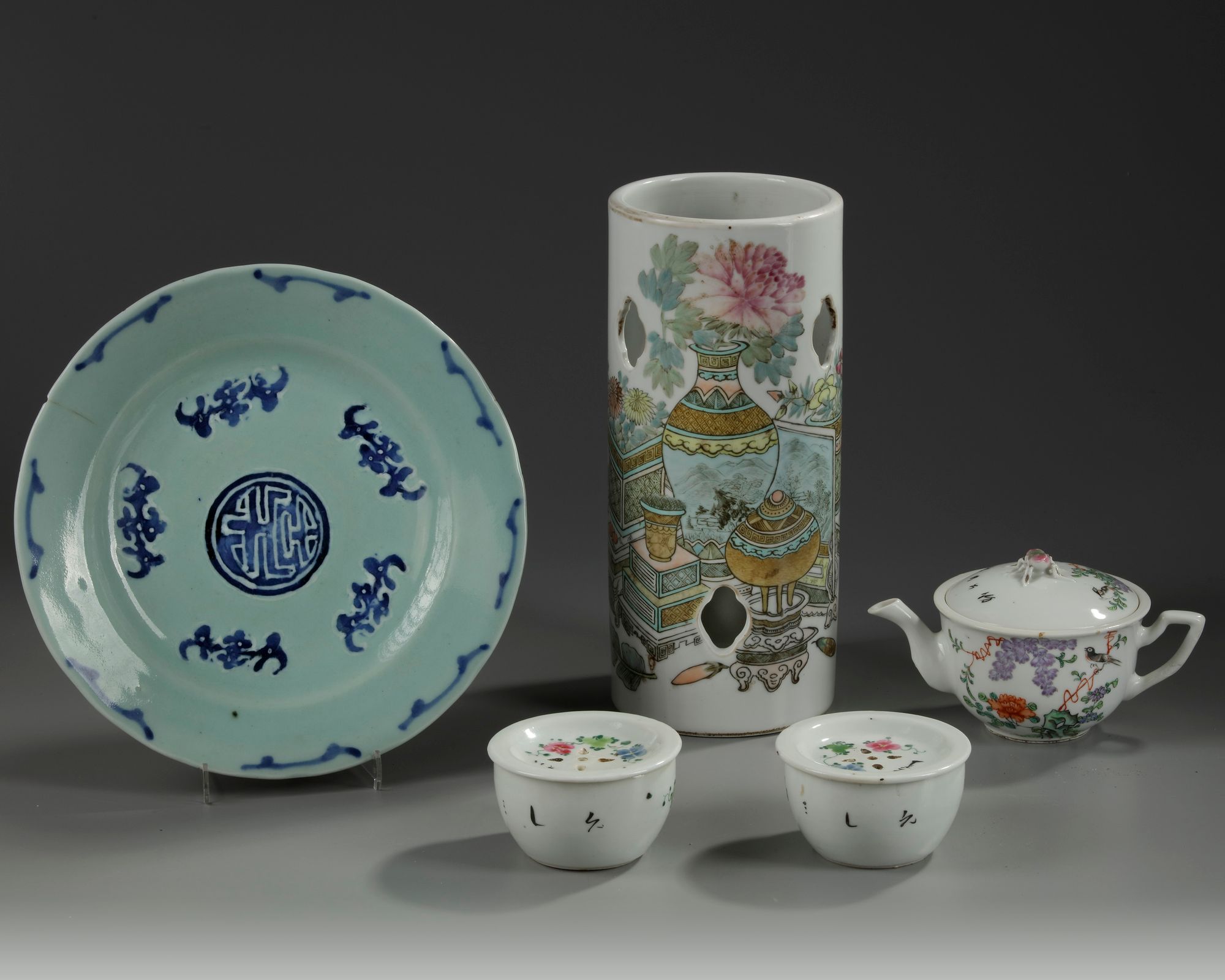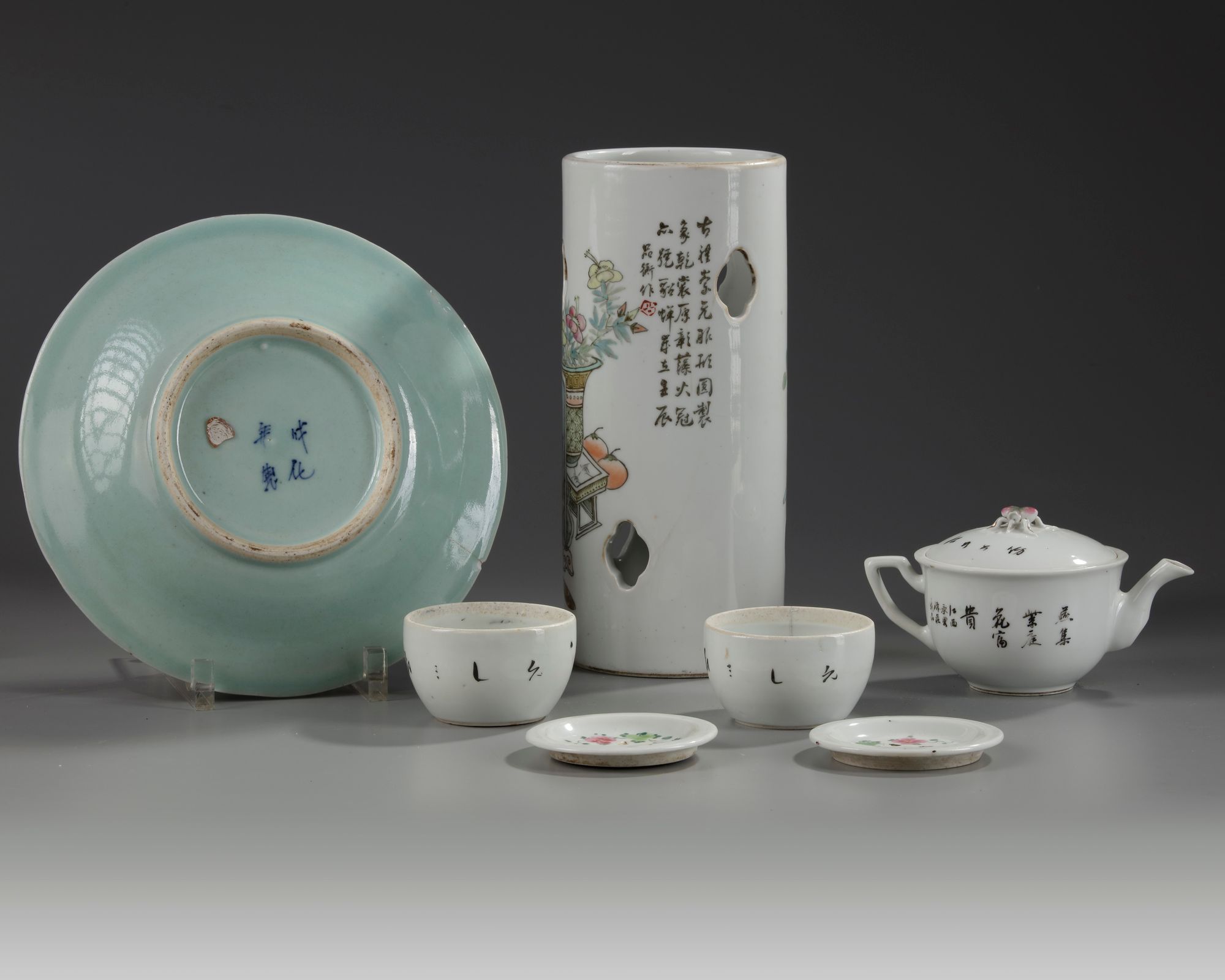 The cylindrical hatstand is decorated with pierced floral designs, and is enamelled with flowers in a vase and inscribed and signed ‘Pin Heng zuo’, the underside is marked with an apocryphal Guangxu mark. The teaset is comprised of a teapot and two cups, each decorated with birds and flowers and inscribed and signed, the bases of the cups with a seal mark. The dish is decorated with five bats surrounding a shou roundel. The underside with an apocryphal Chenghua mark.