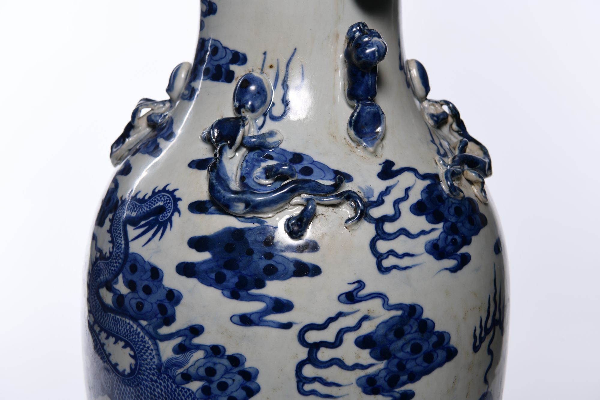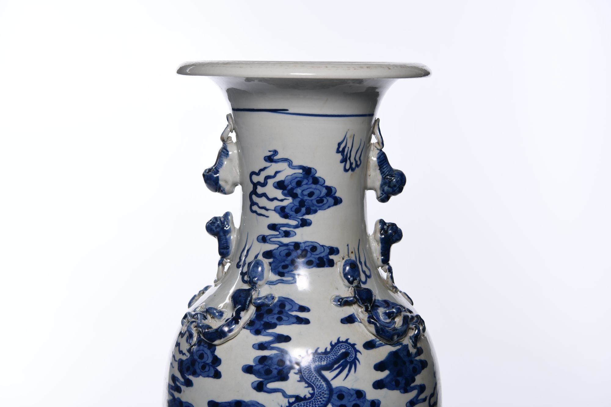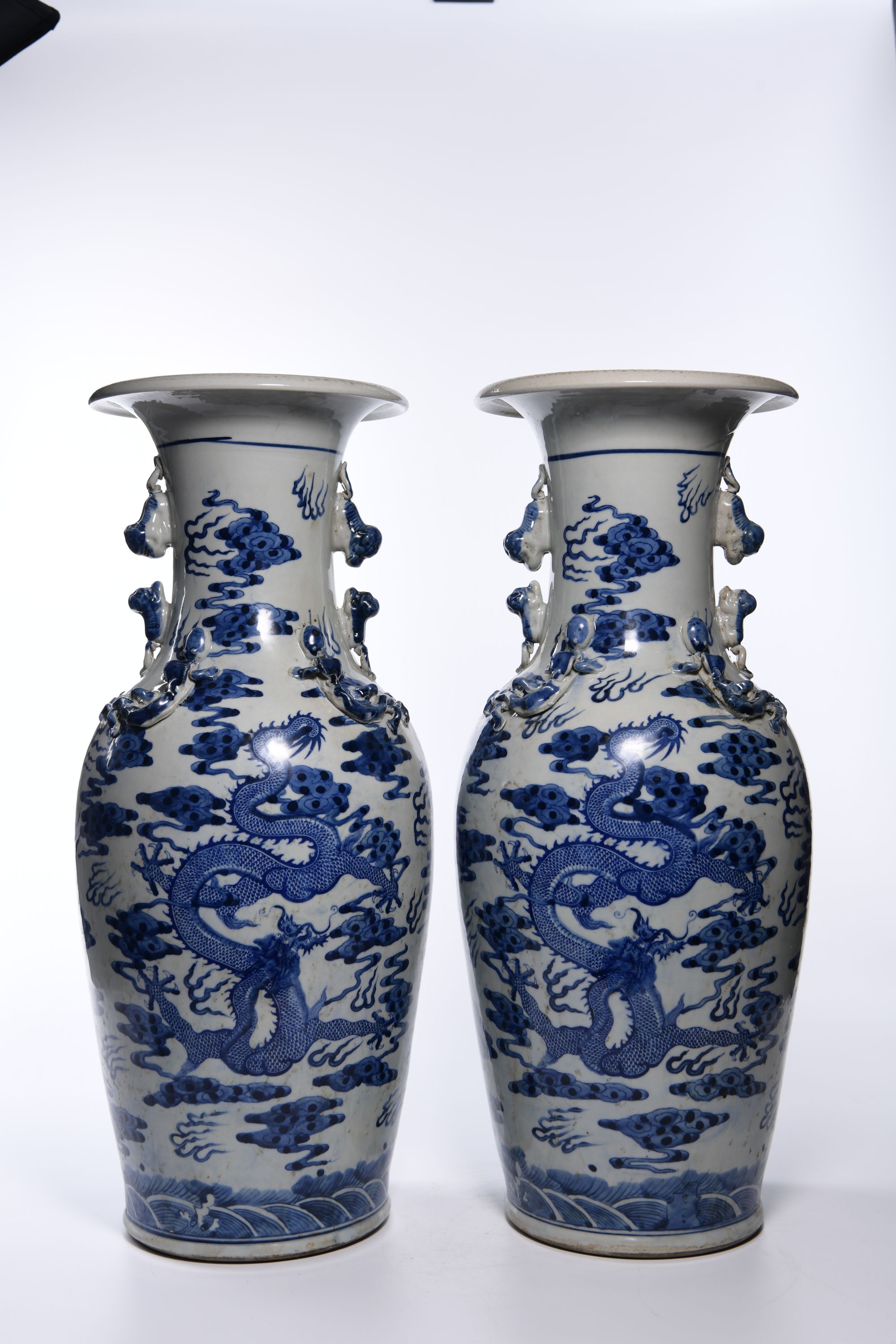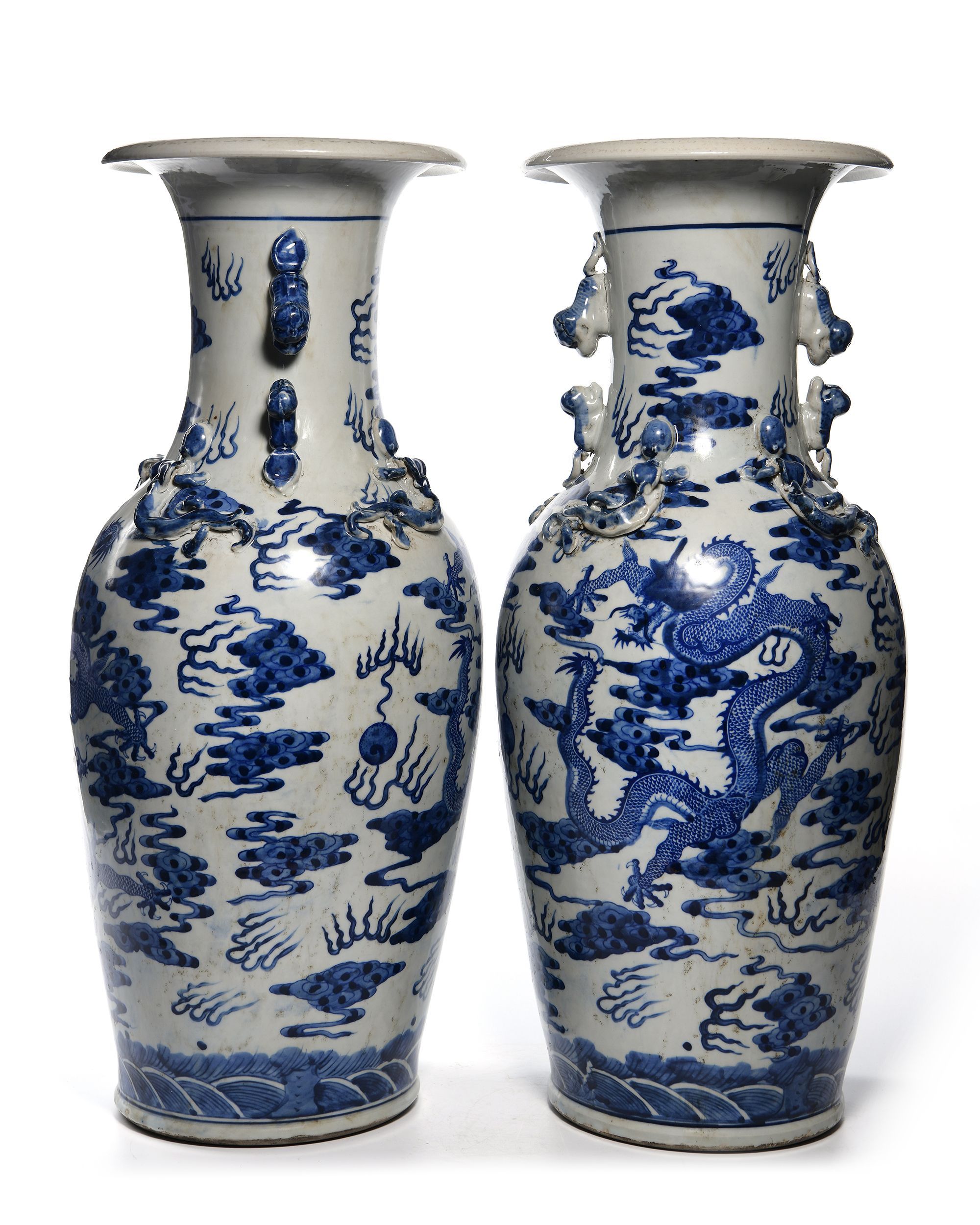 Each vase is stylized to the neck with two pairs of confronting fu-dogs, decorated in blue and white with two large five-clawed dragons chasing a flaming pearl amongst clouds above sea waves.The shoulder stylised in low relief with two pairs of chilong dragons. 46 cm.