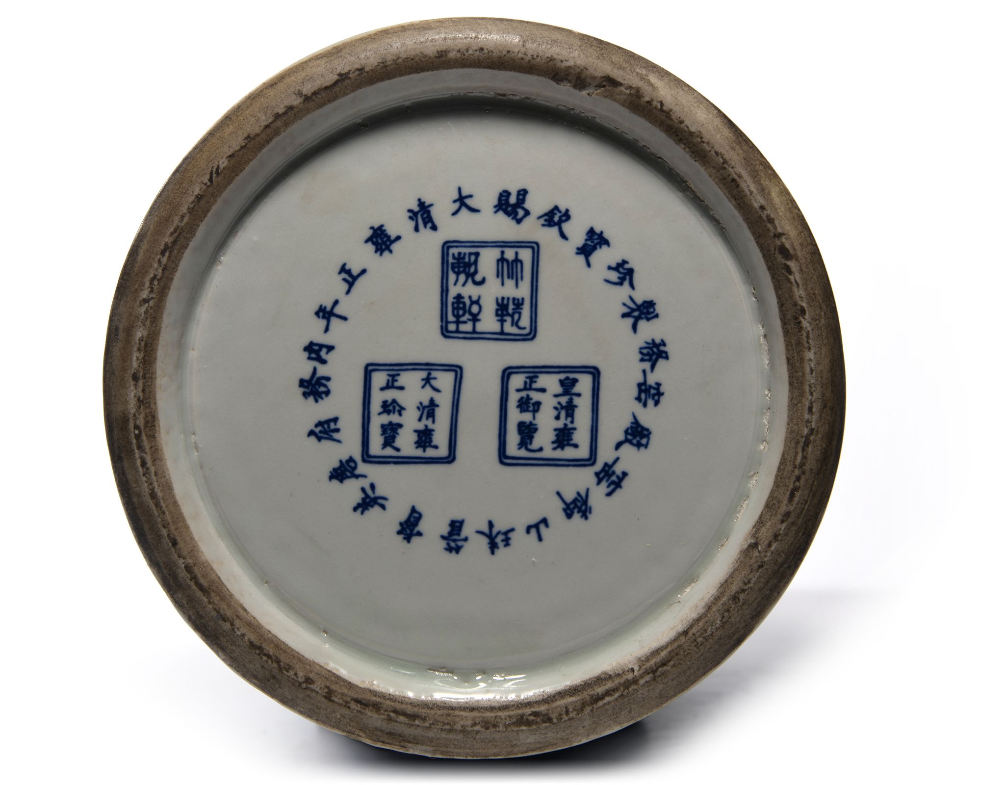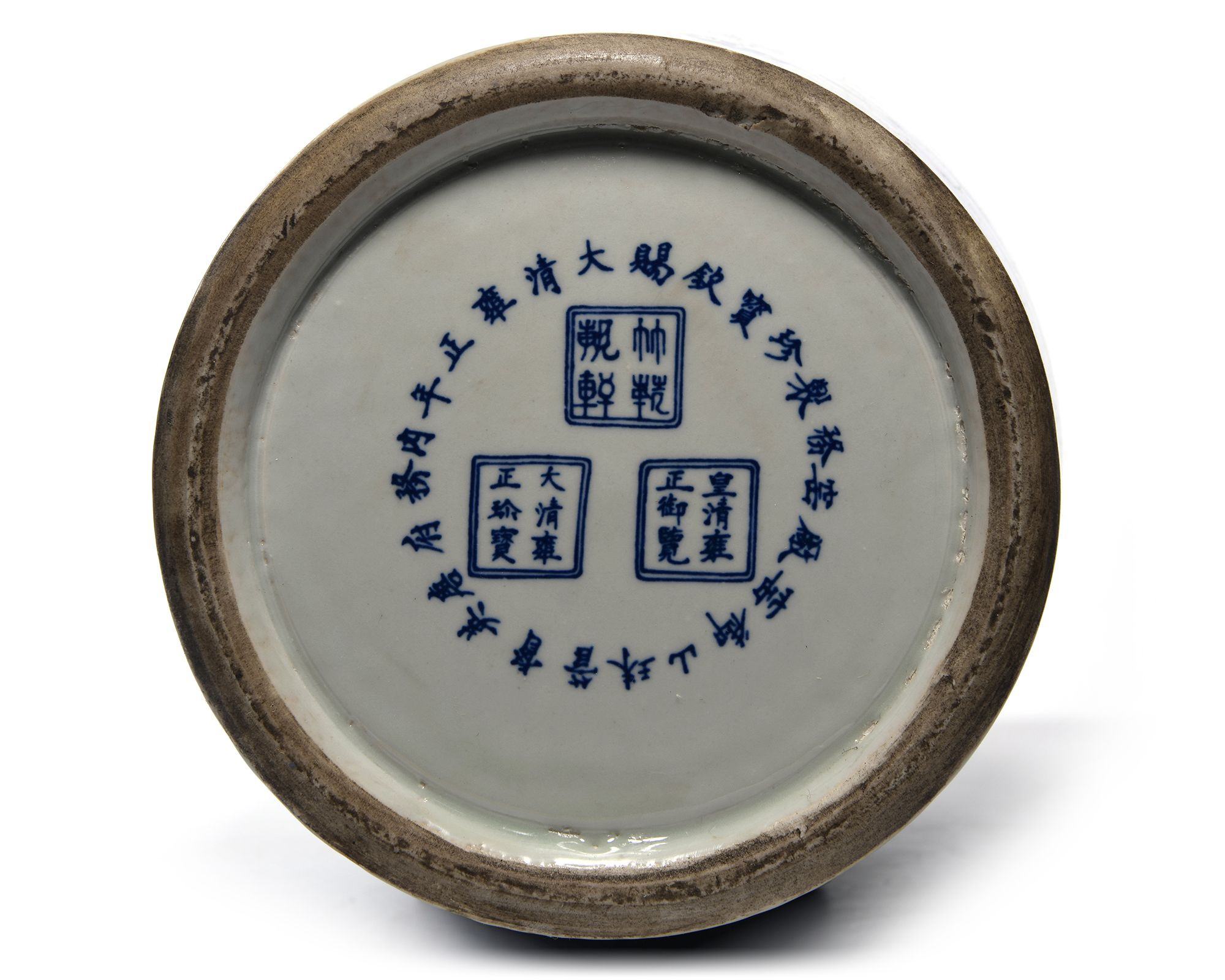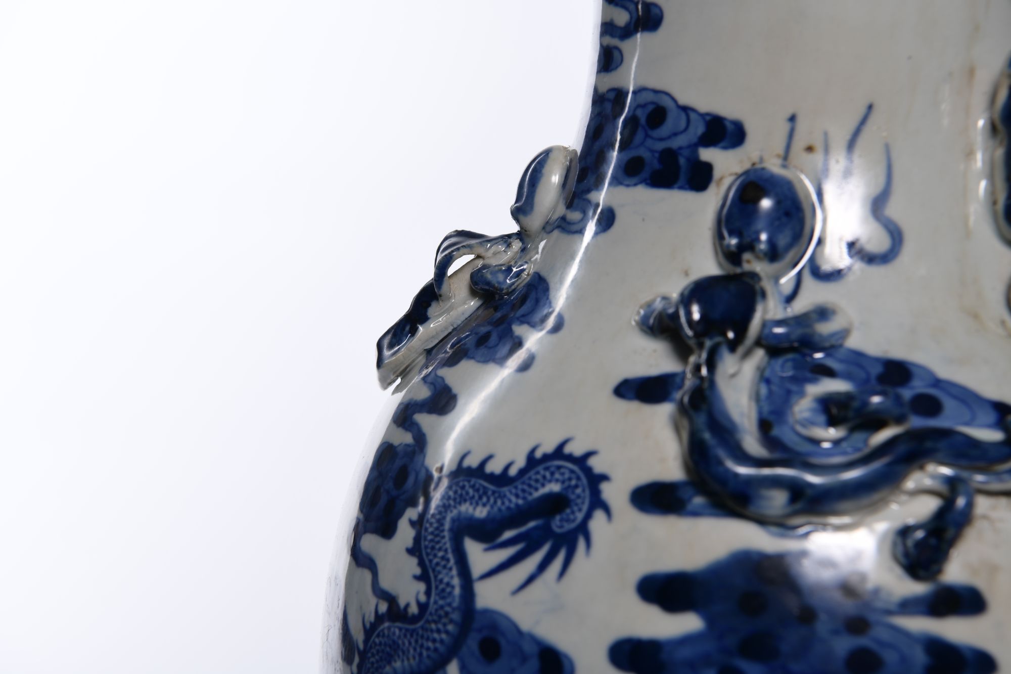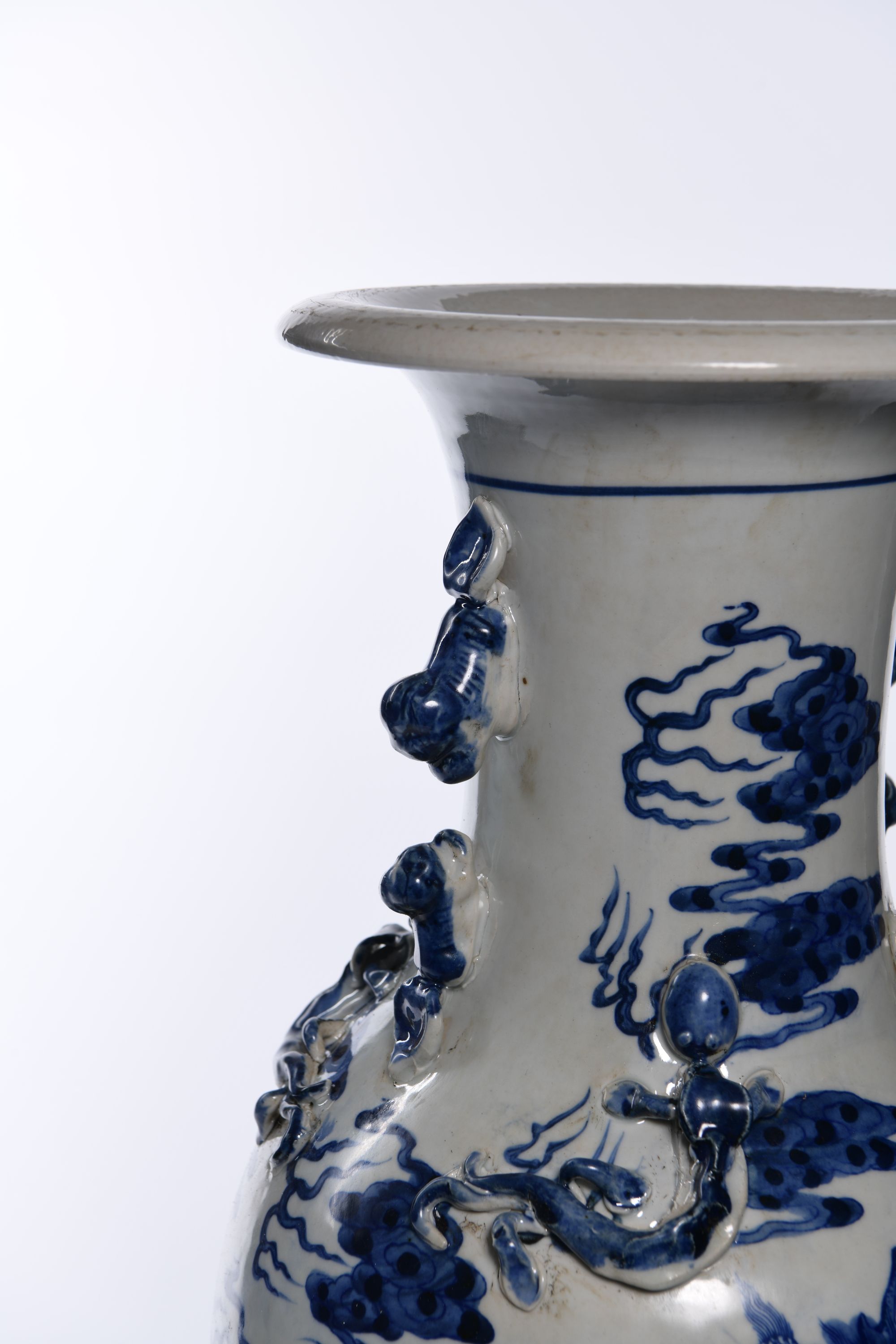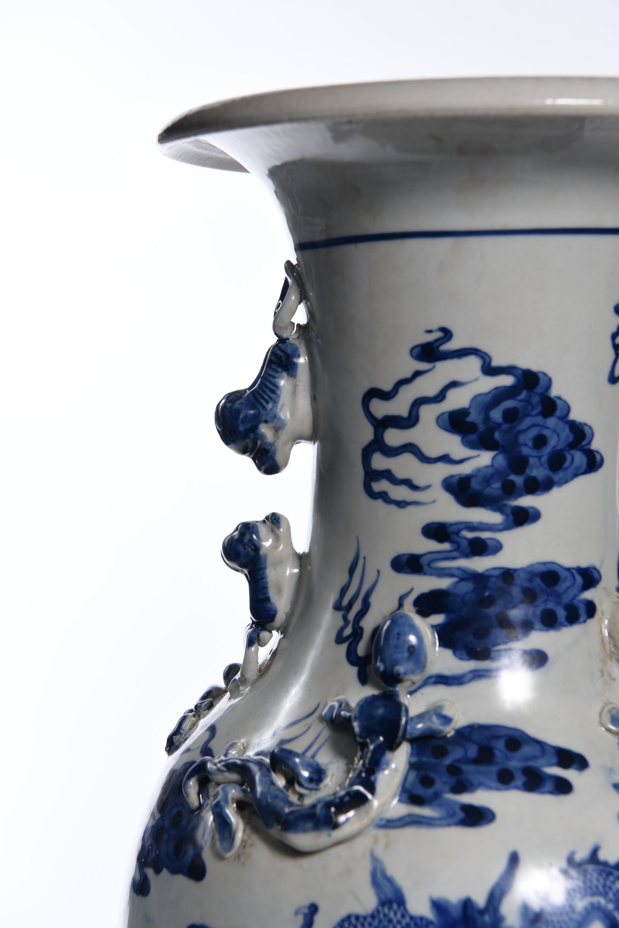 Each vase is stylized to the neck with two pairs of confronting fu-dogs, decorated in blue and white with two large five-clawed dragons chasing a flaming pearl amongst clouds above sea waves.The shoulder stylised in low relief with two pairs of chilong dragons. 46 cm.