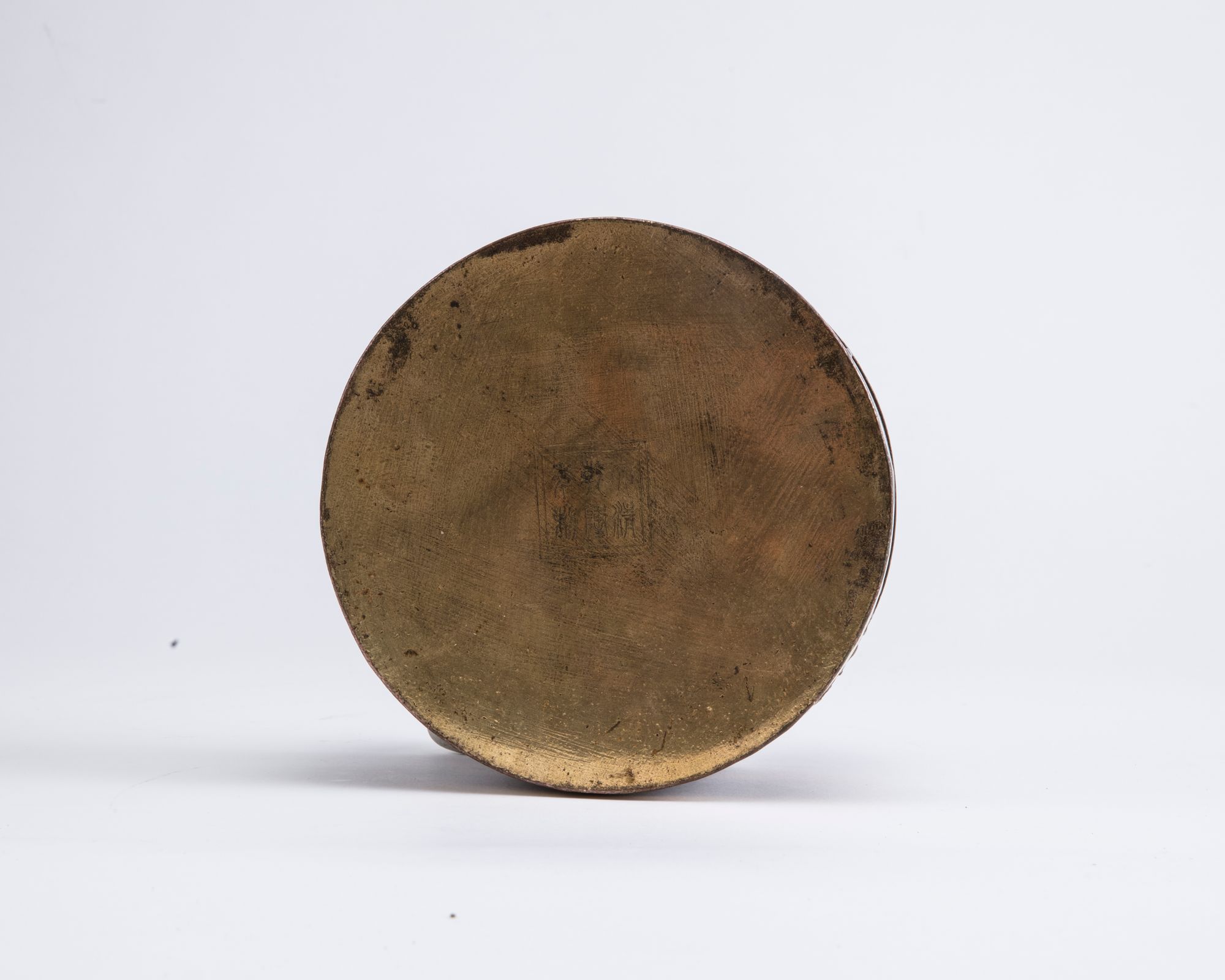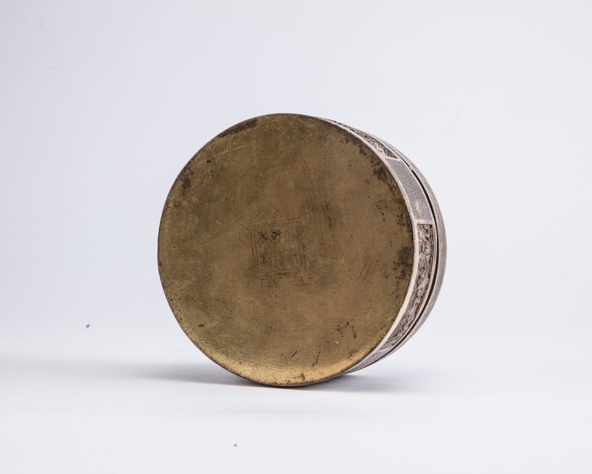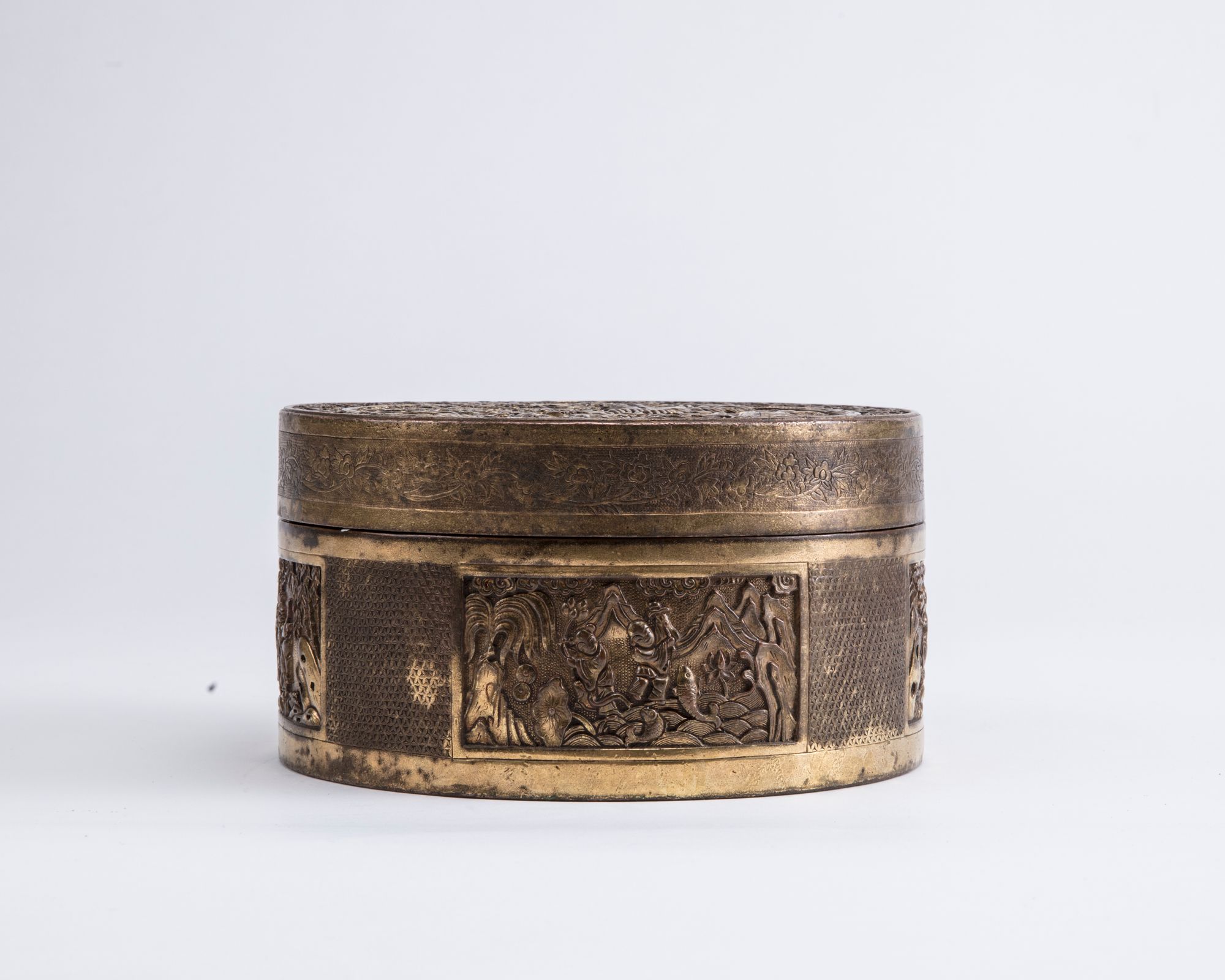 The box is decorated with various panels enclosing Immortals in a tree-filled landscape, surrounded by a floral band, and a patterned trellis band. The base with an apocryphal Qianlong mark.
