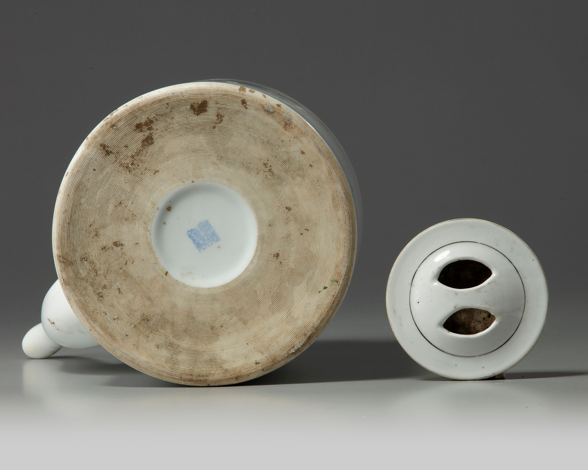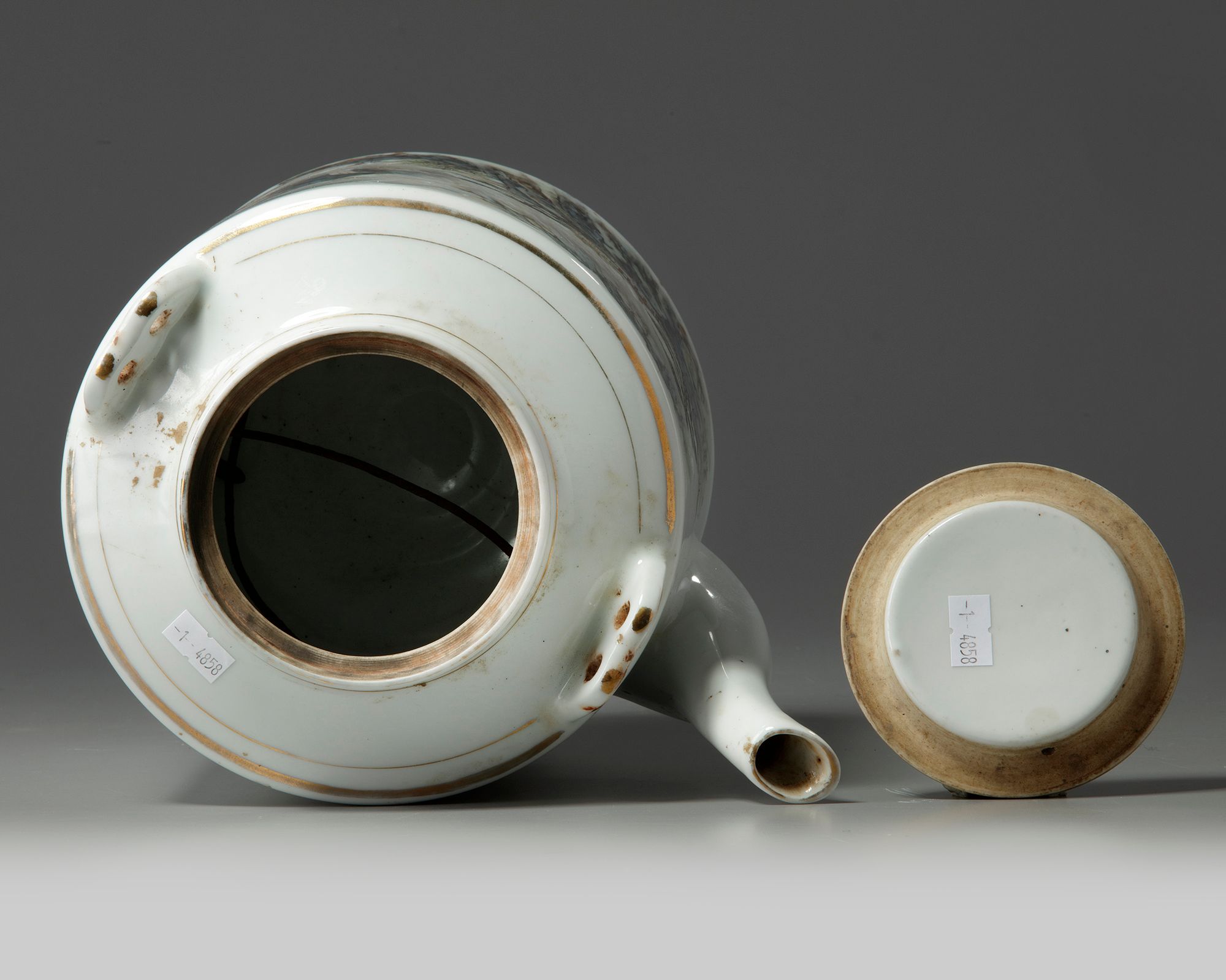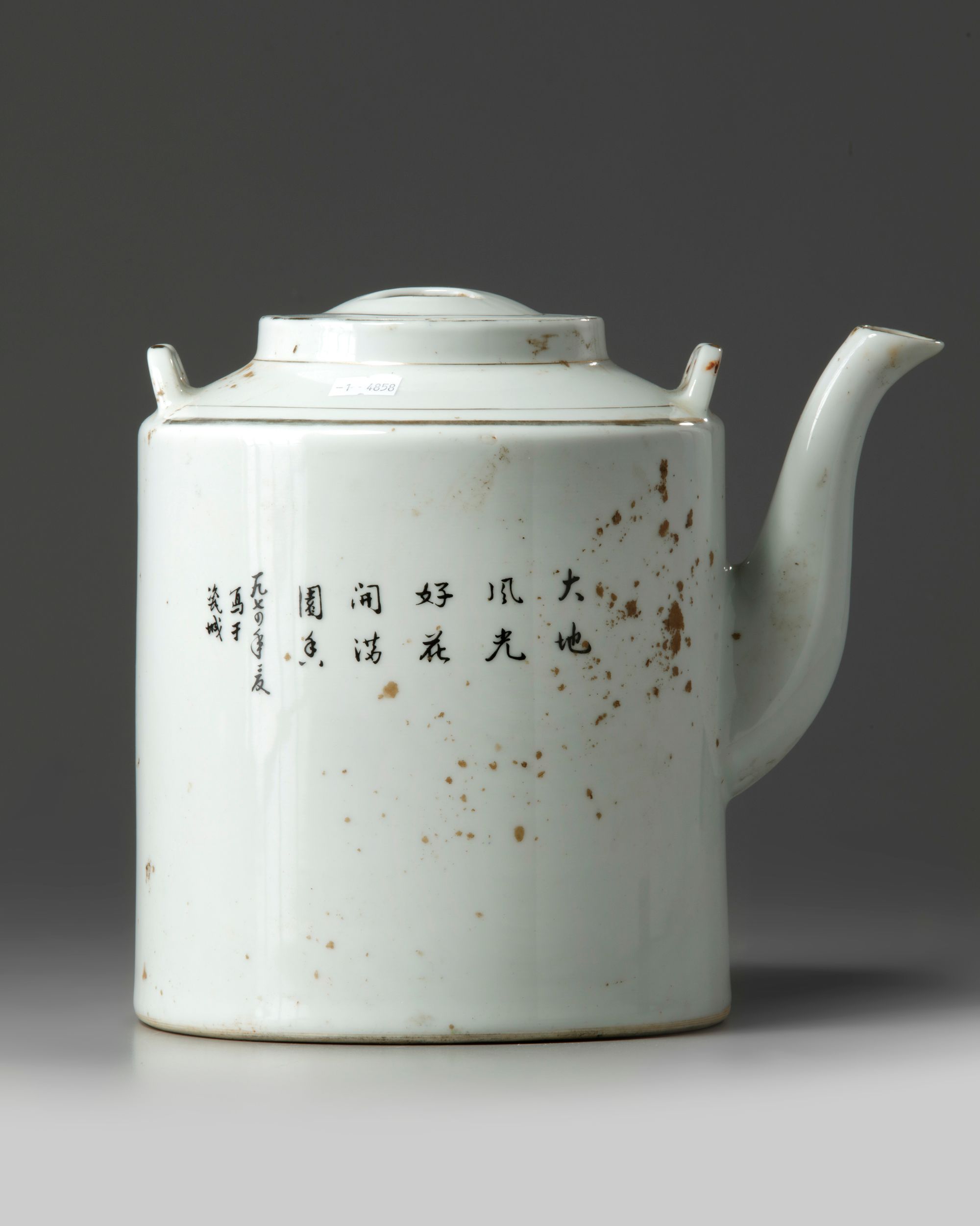 The teapot is decorated to one side with a landscape scene of a pavilion amongst mountains, one side is inscribed 'Huang shan, Zou Guojun', and the other side is inscribed 'Da di feng guang hao, hua kai man yuan xiang', which refers to the scenery and the smell of flowers, and is dated 1970. The base is marked 'Jingdezhen zhi' in blue enamel.