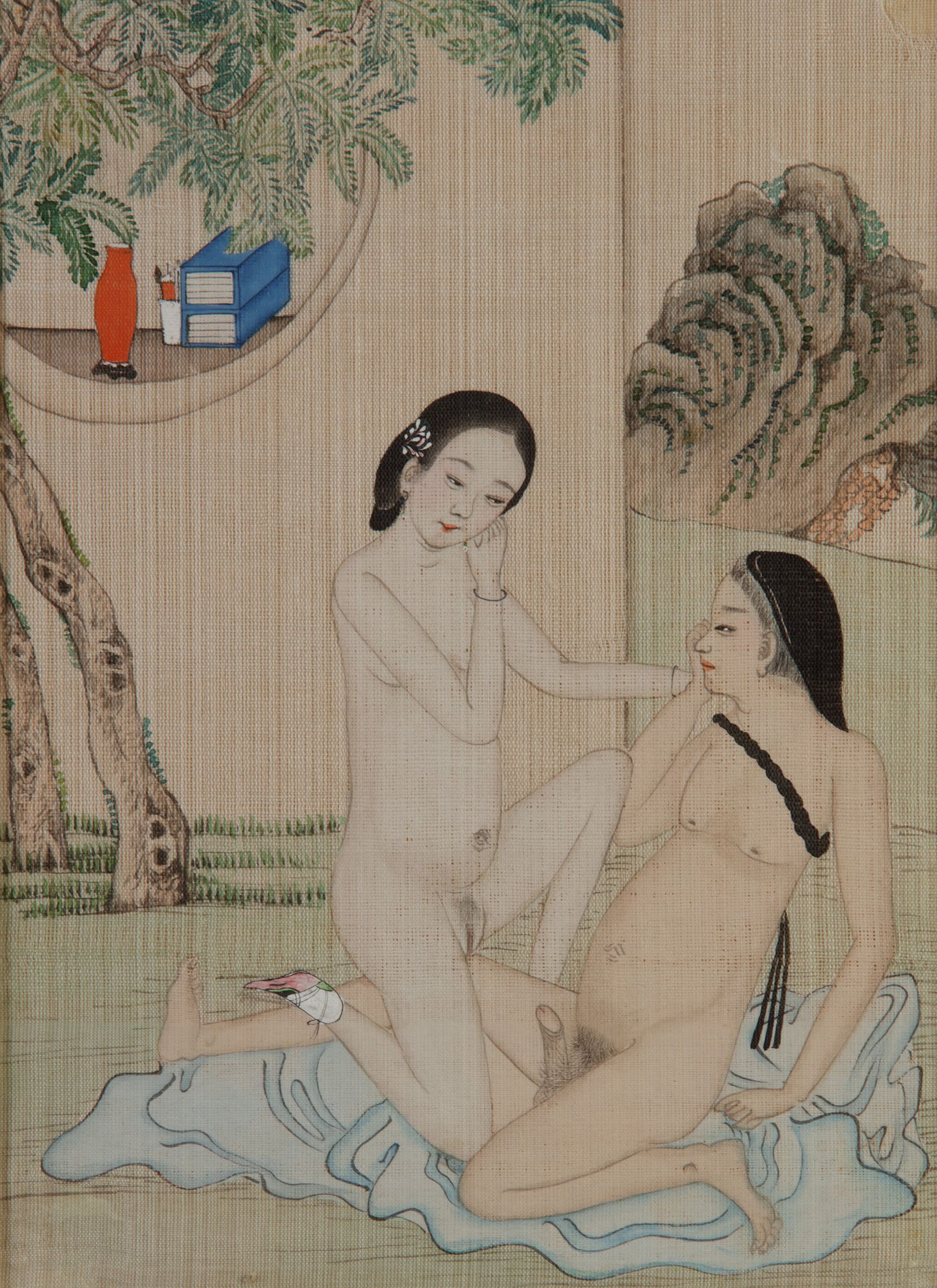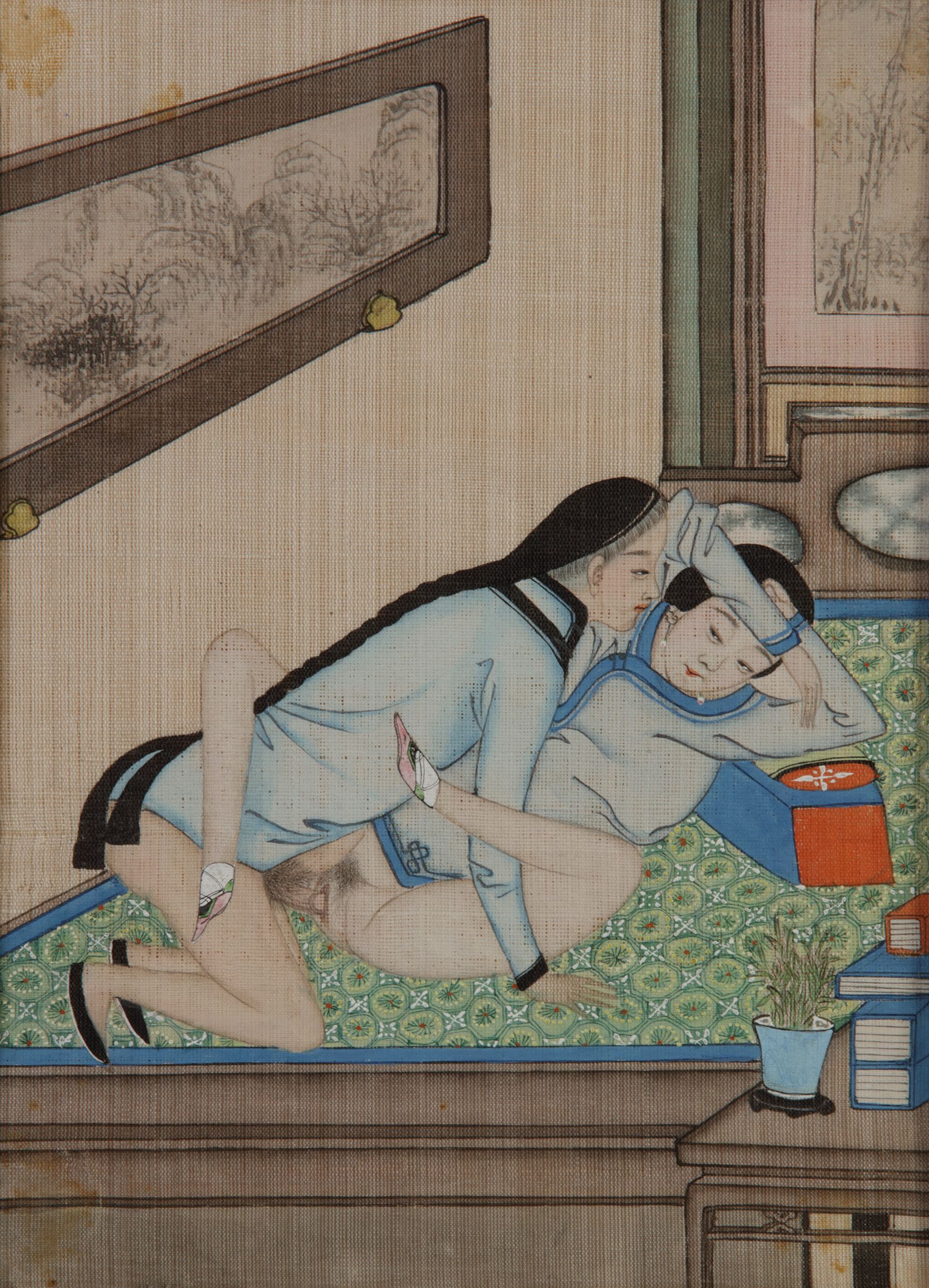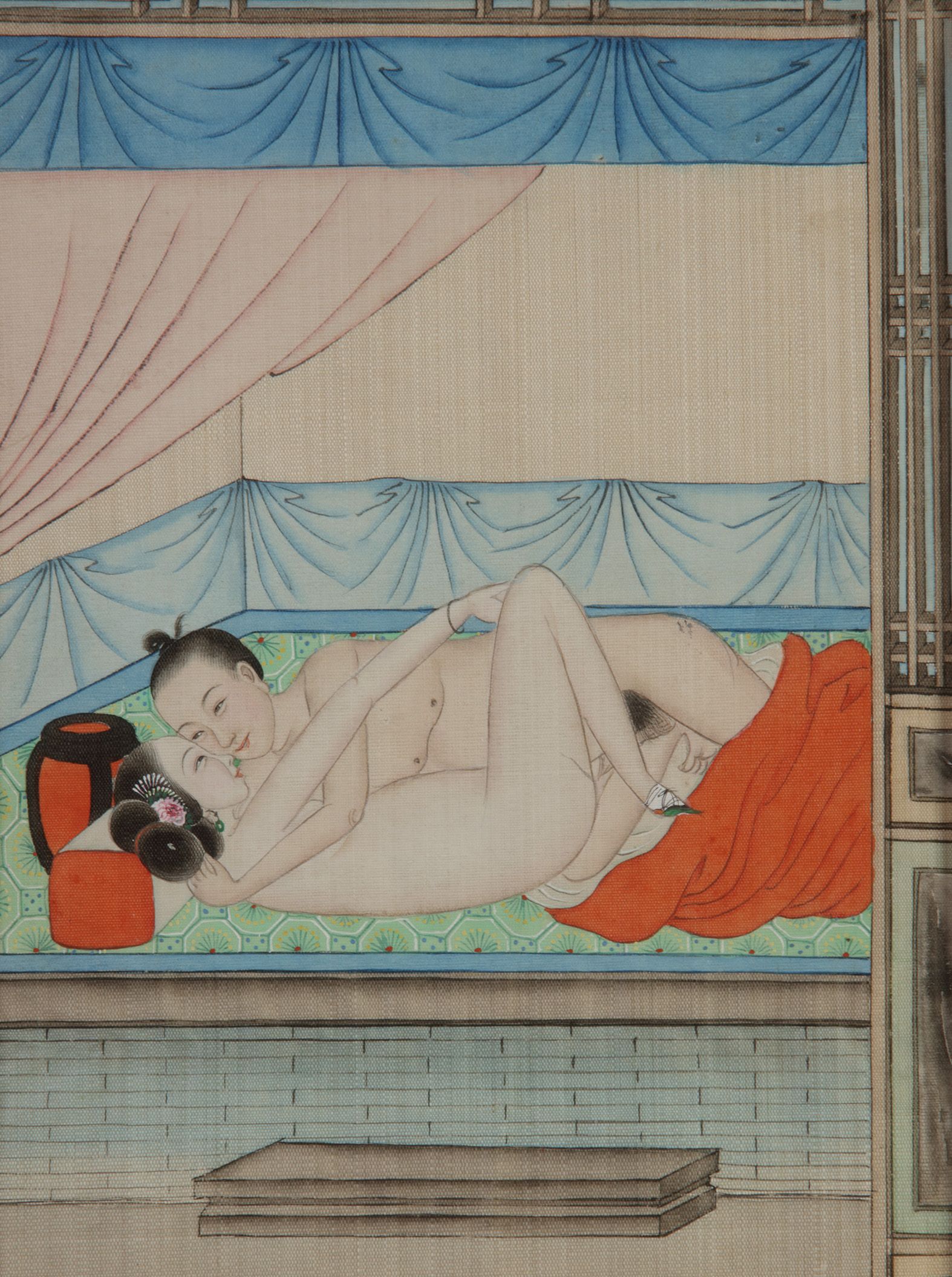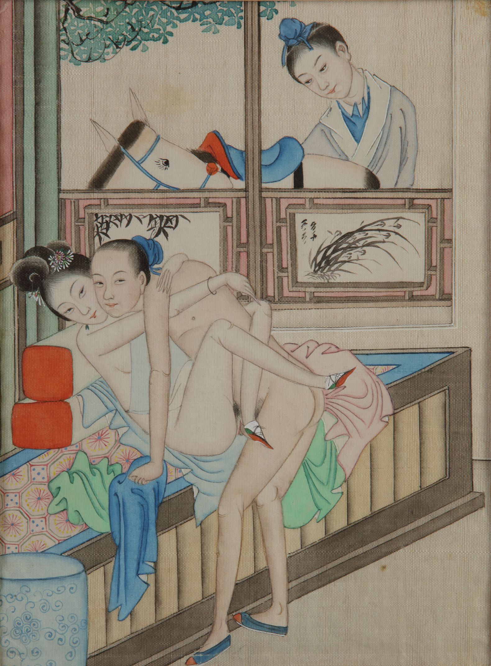 Ink and colour on silk. Each depicting couples in amorous pursuits. All framed and glazed.
