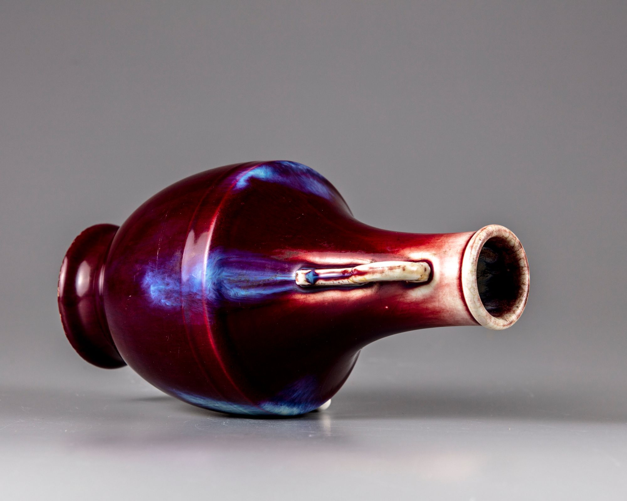 The deep bowl-shaped body raised on a spreading foot has a bow-string border below the shoulder and a pair of trailing scroll handles flanking the neck, and is covered with a glaze of crushed strawberry-red color streaked in purple and milky blue.The bottom with a Qianlong seal mark