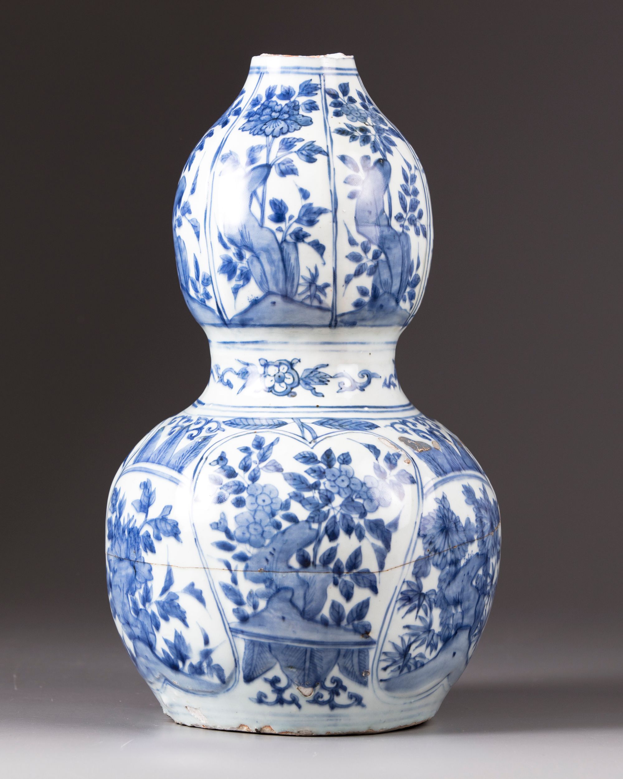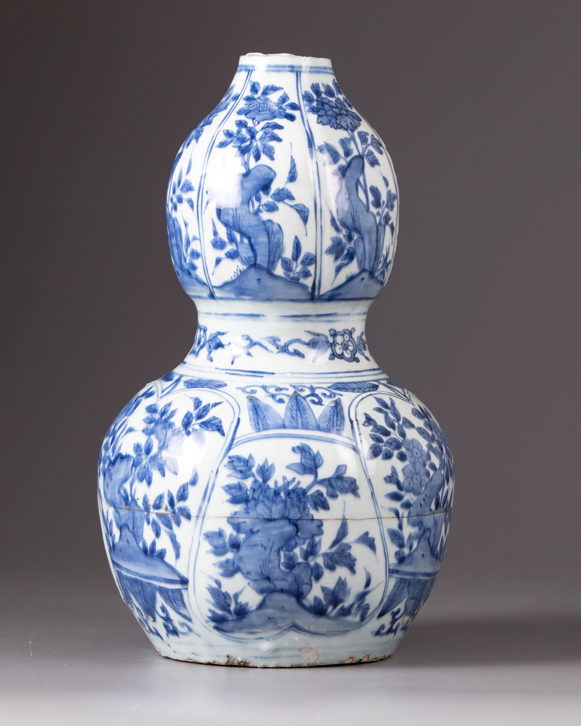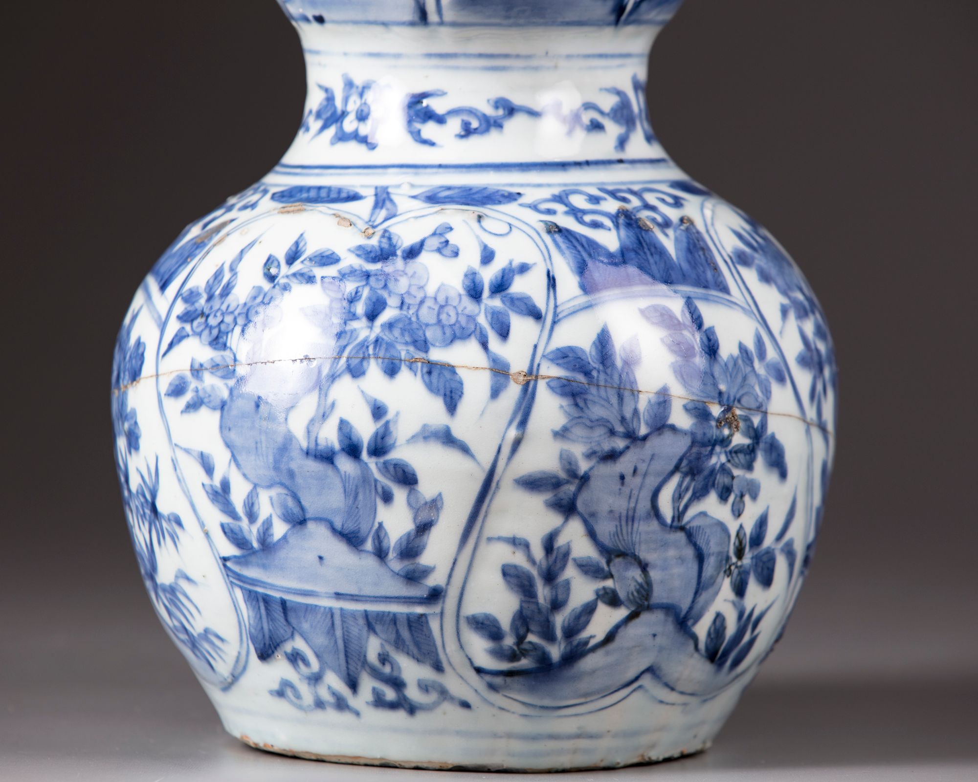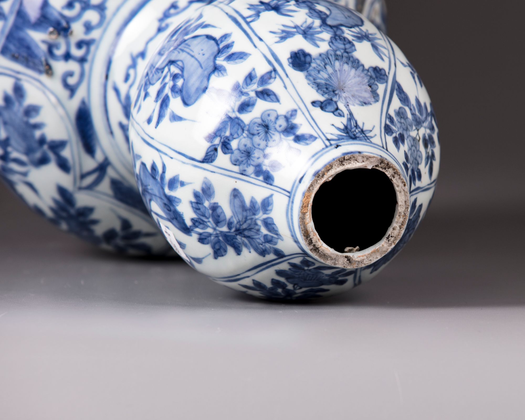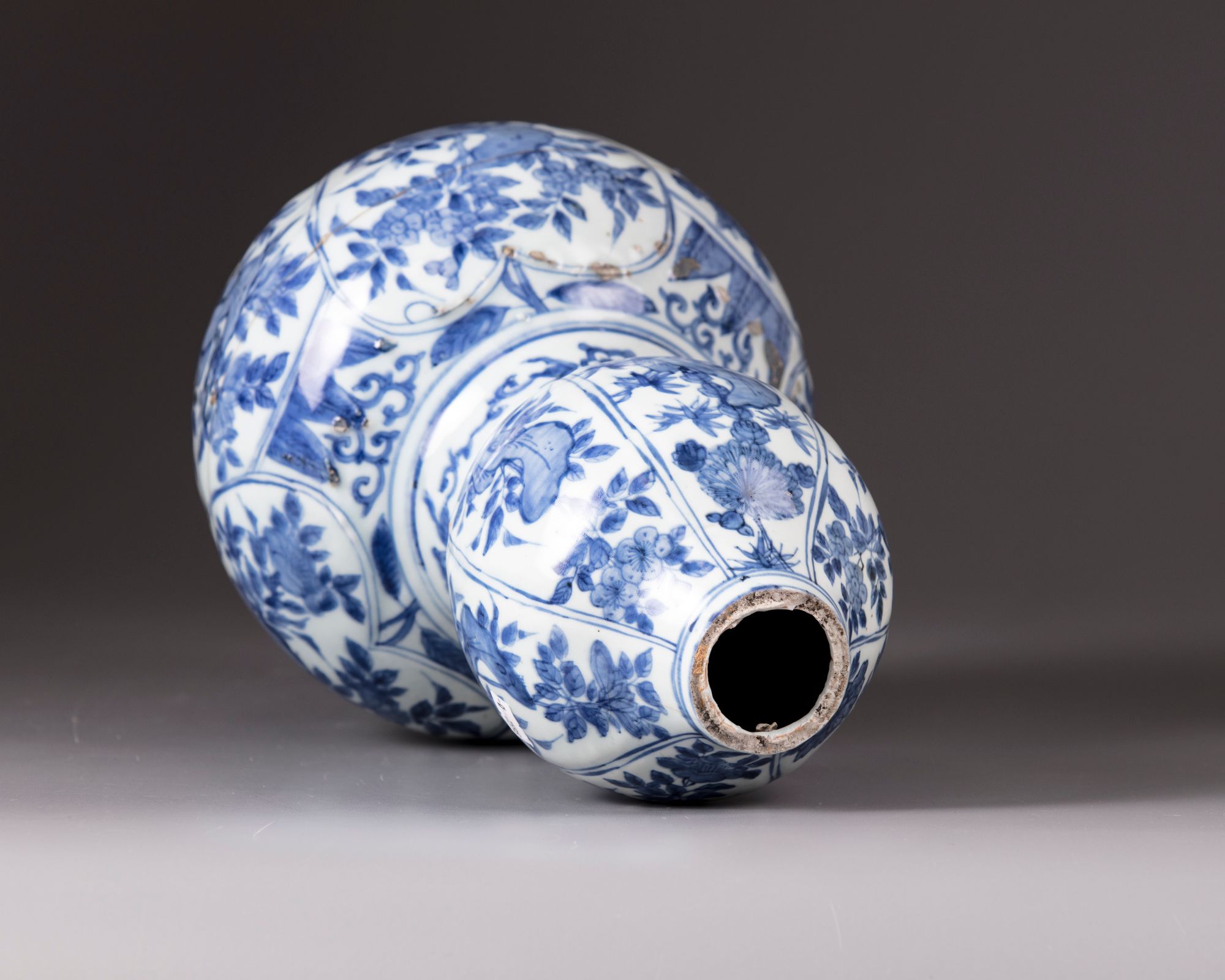 The lower globular section is decorated with heart-shaped panels containing flowering trees, separated by chrysanthemums and leaves.