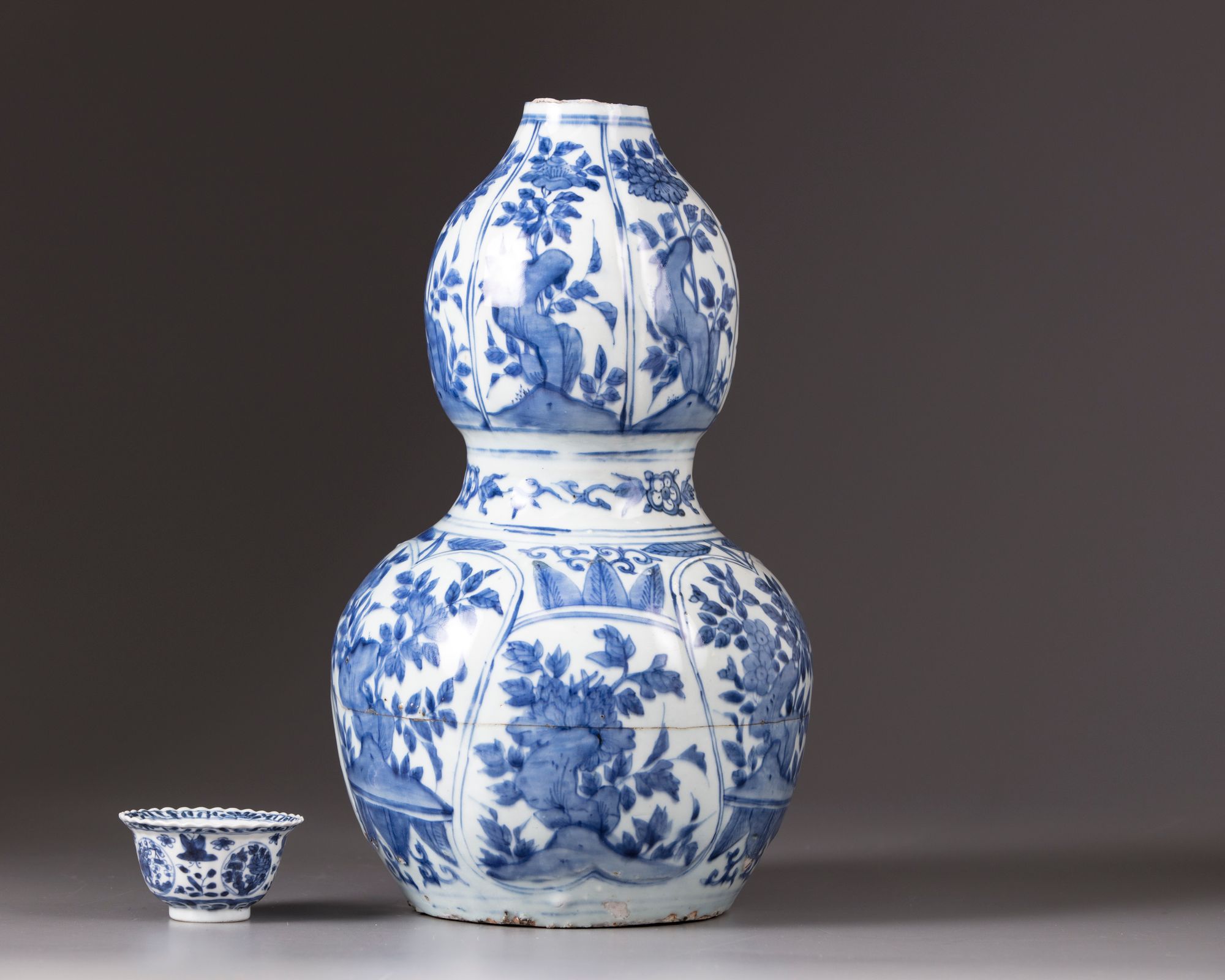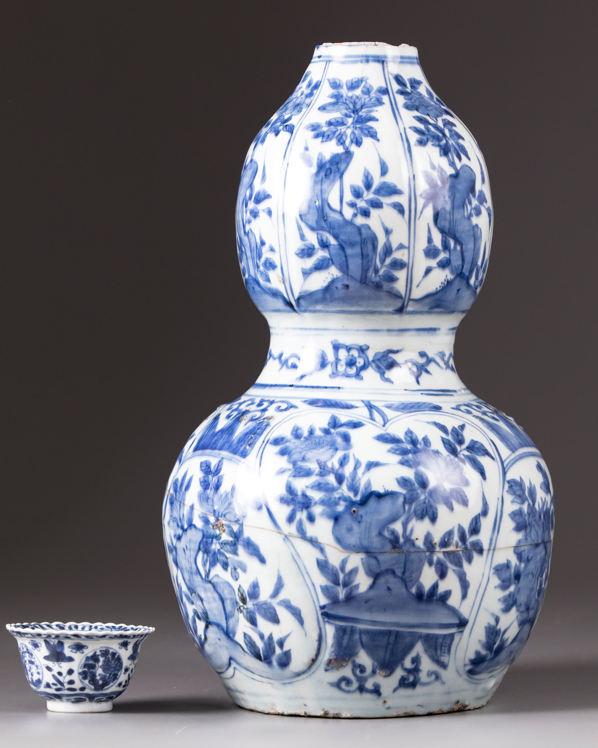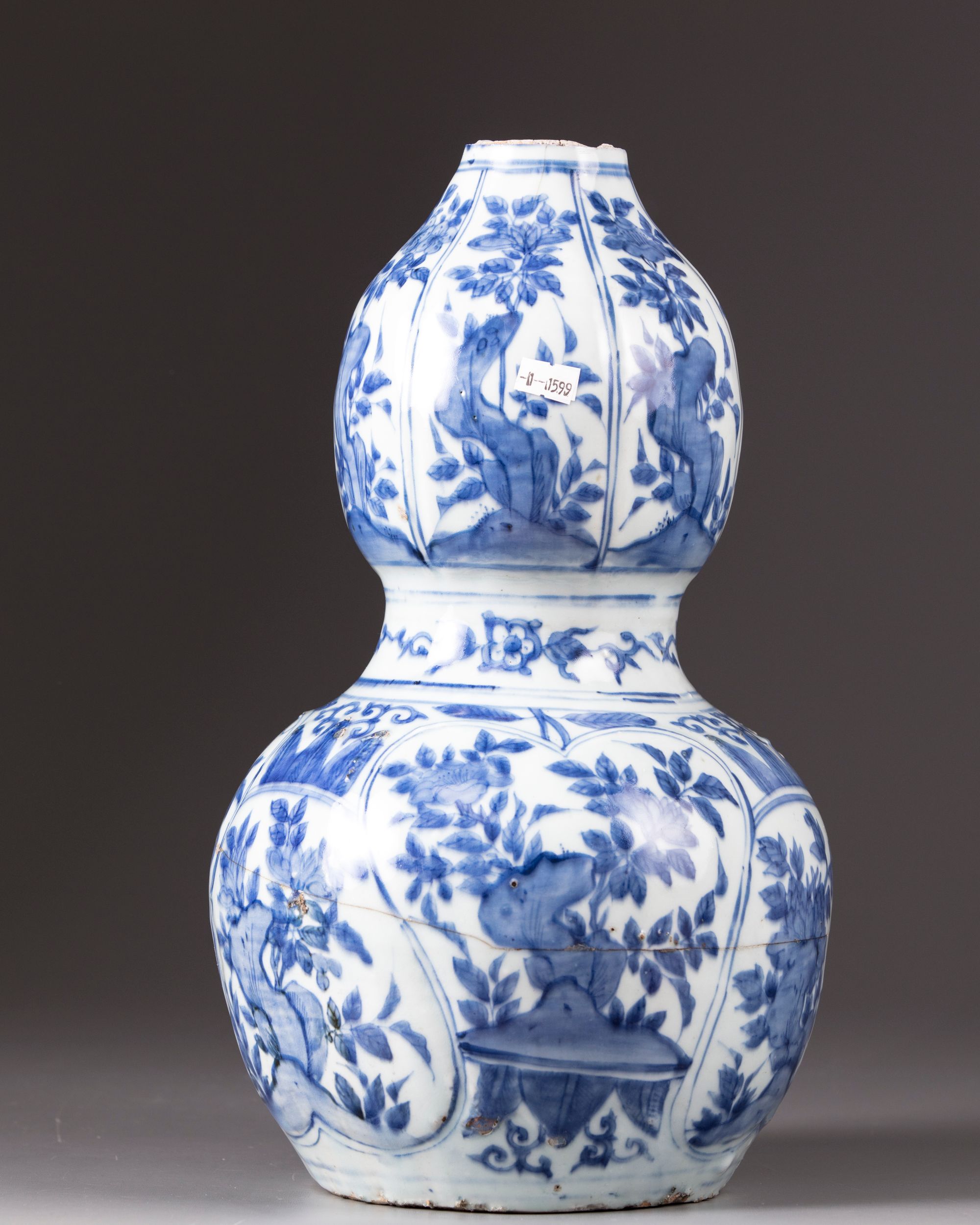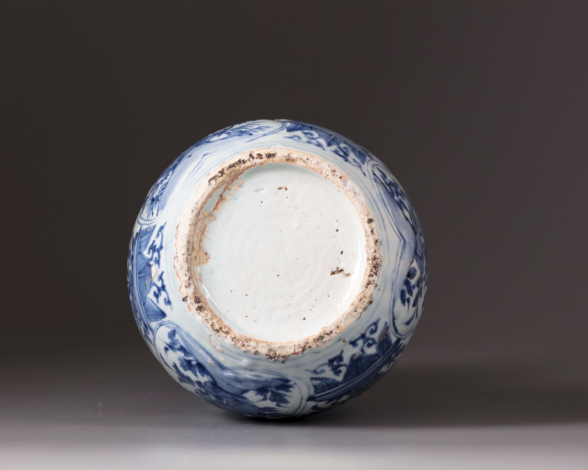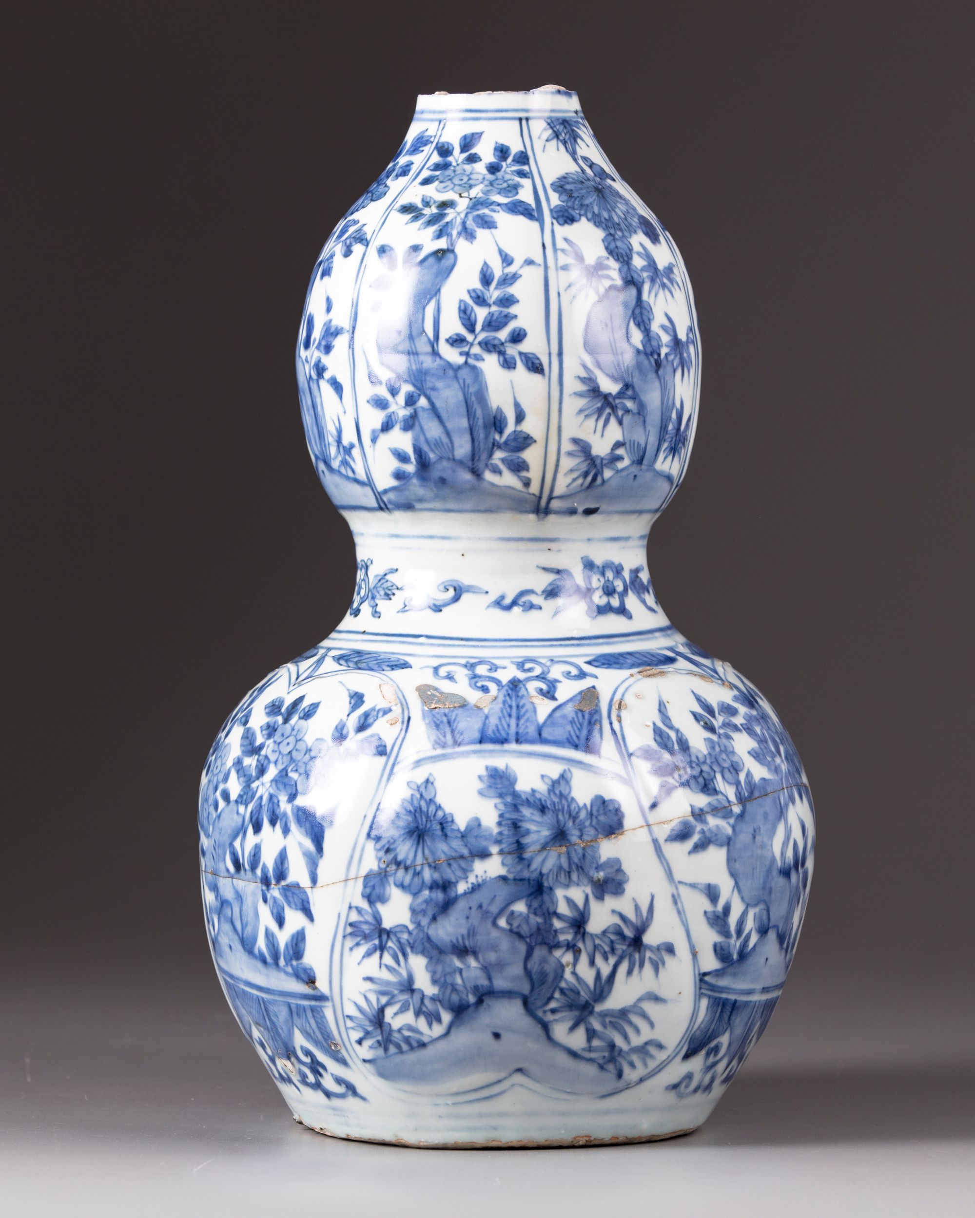 The lower globular section is decorated with heart-shaped panels containing flowering trees, separated by chrysanthemums and leaves.