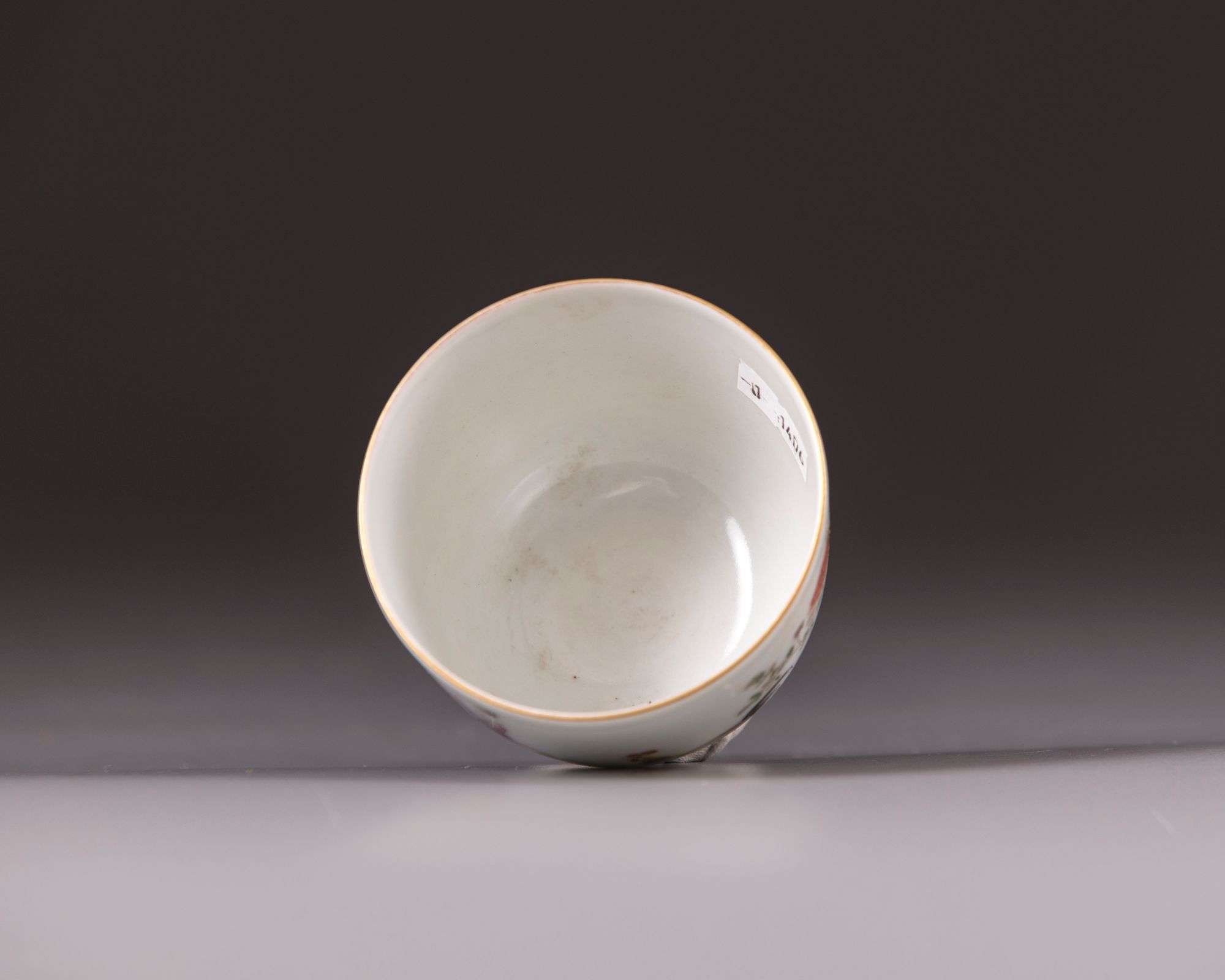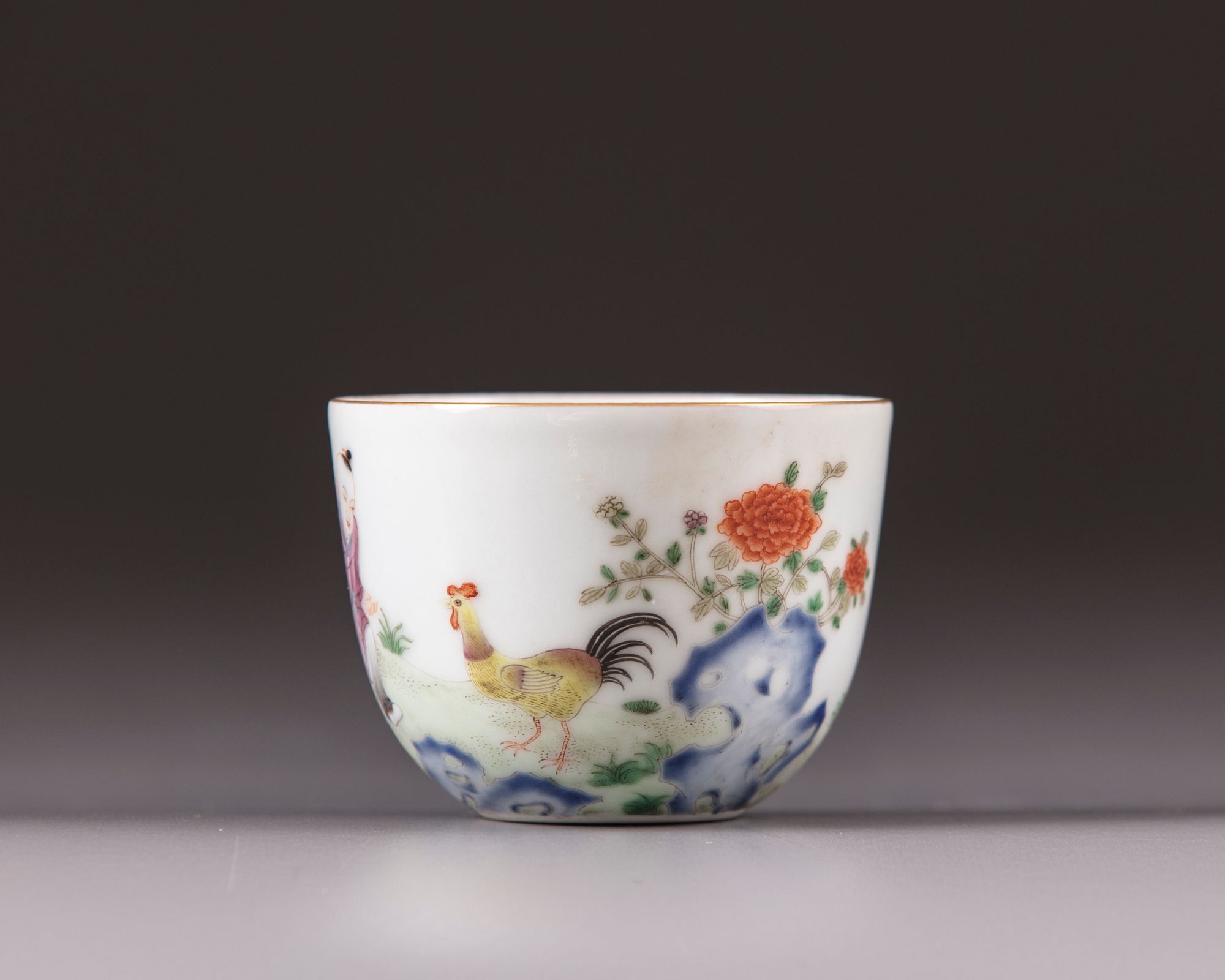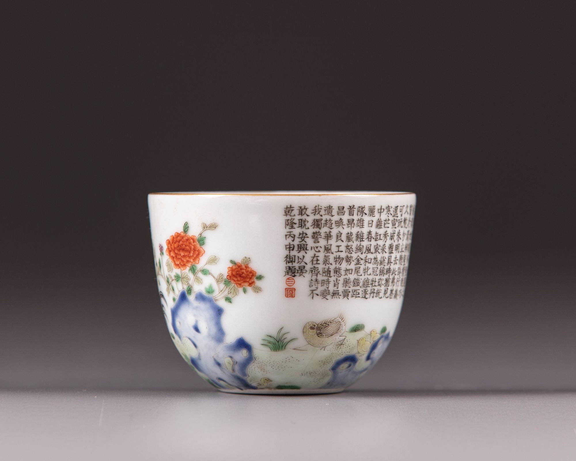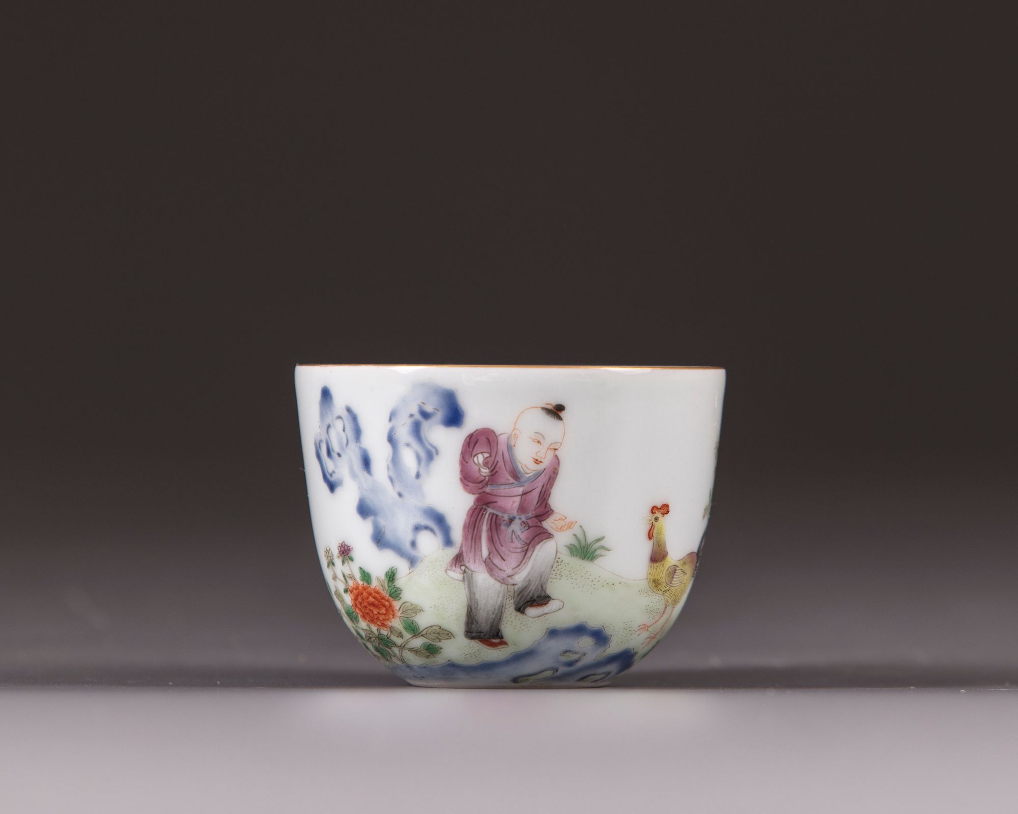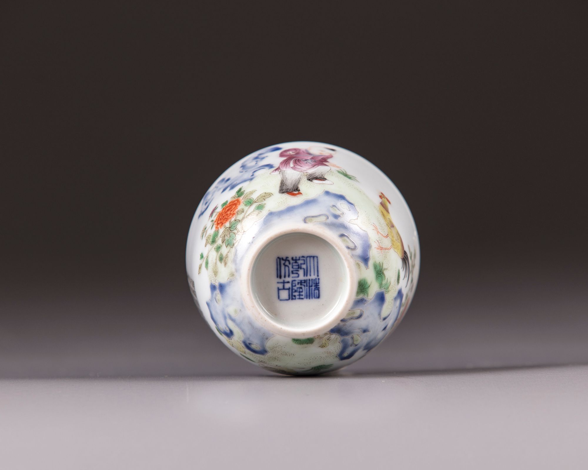 Decorated to the exterior with a boy playing with a rooster, the backside with a chinese calligraphic inscription. The base with a Qianlong seal mark.