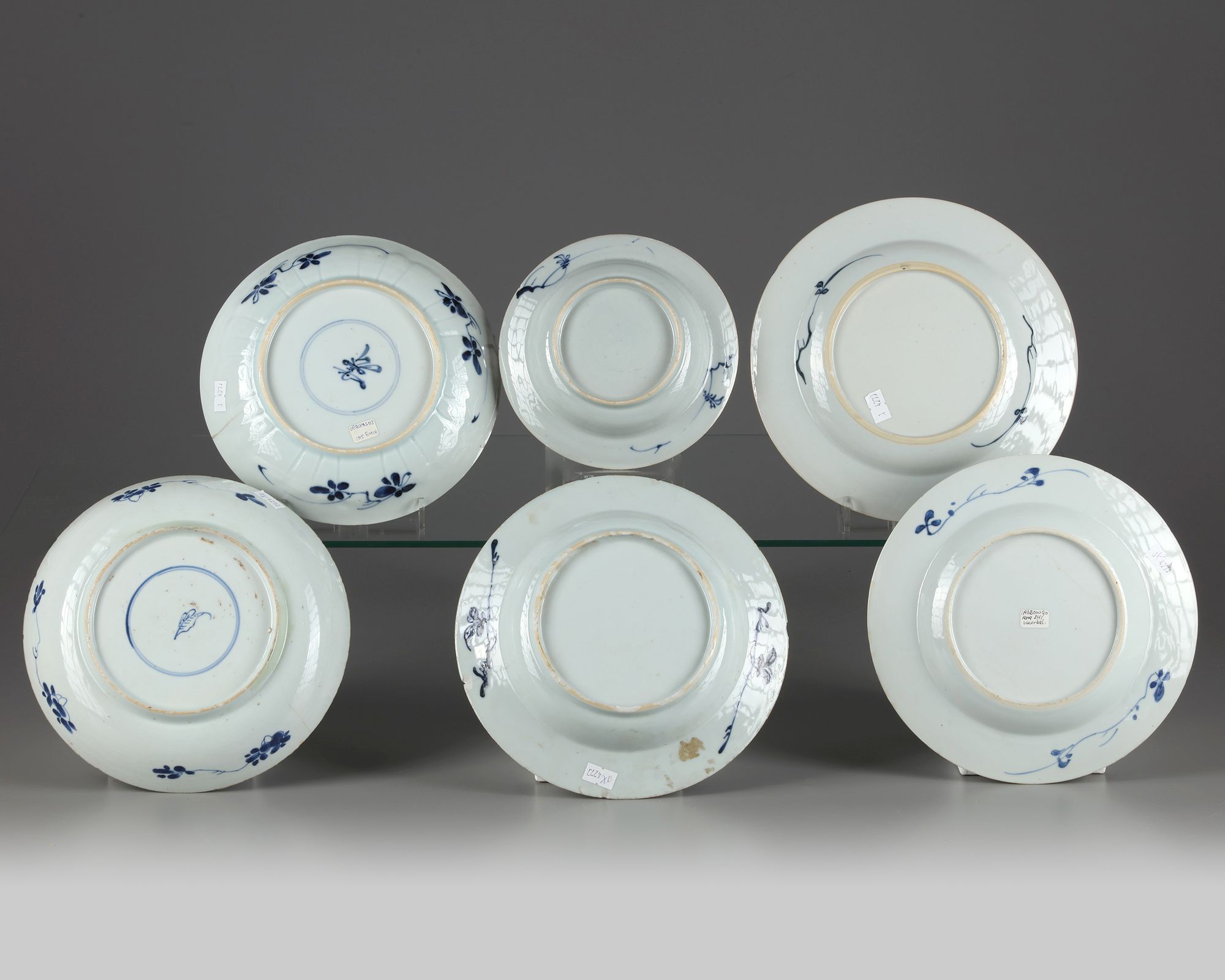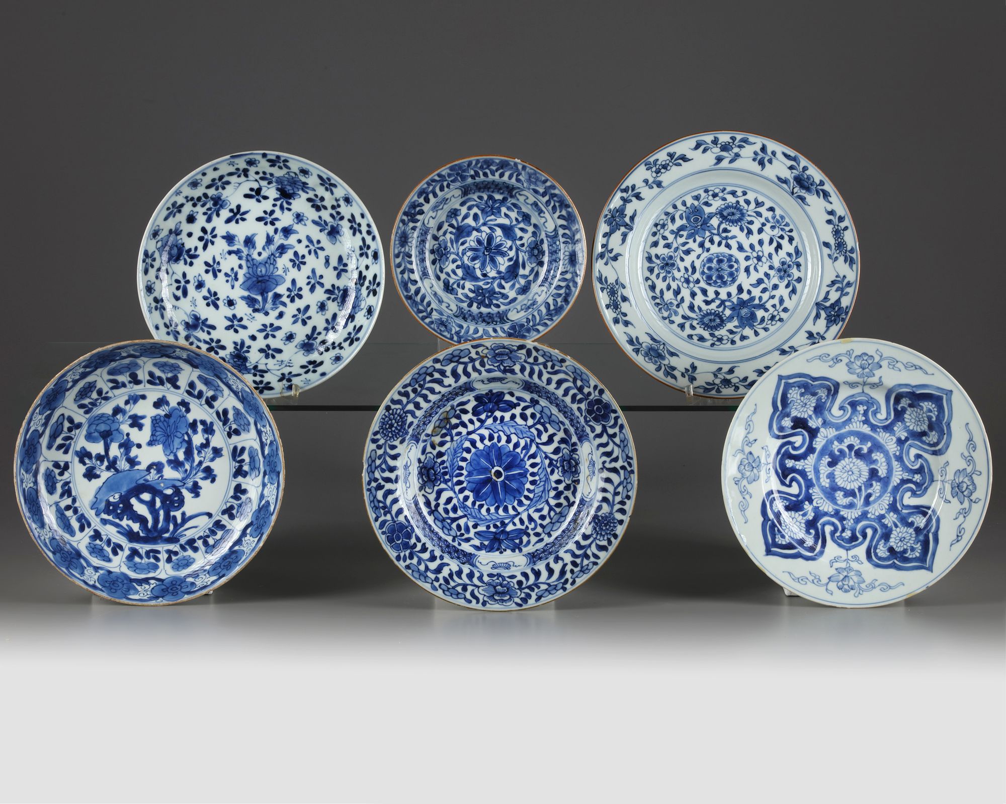 The small bowl: 3.5 cm. high x 16.5 cm. diam. The dish with the quatrefoil design: 2.7 cm. high x 22.5 cm. wide The bowl with a two registers of flower scrolls: 4.5 cm. x 22.5 cm. diam. The plate with two registers of flowers: 2.7 cm. high x 23 cm. diam. The scattered flowers: 3.5 cm. high x 21 cm. diam. The flower and rocks dish: 4.2 cm. high x 22 cm. diam.