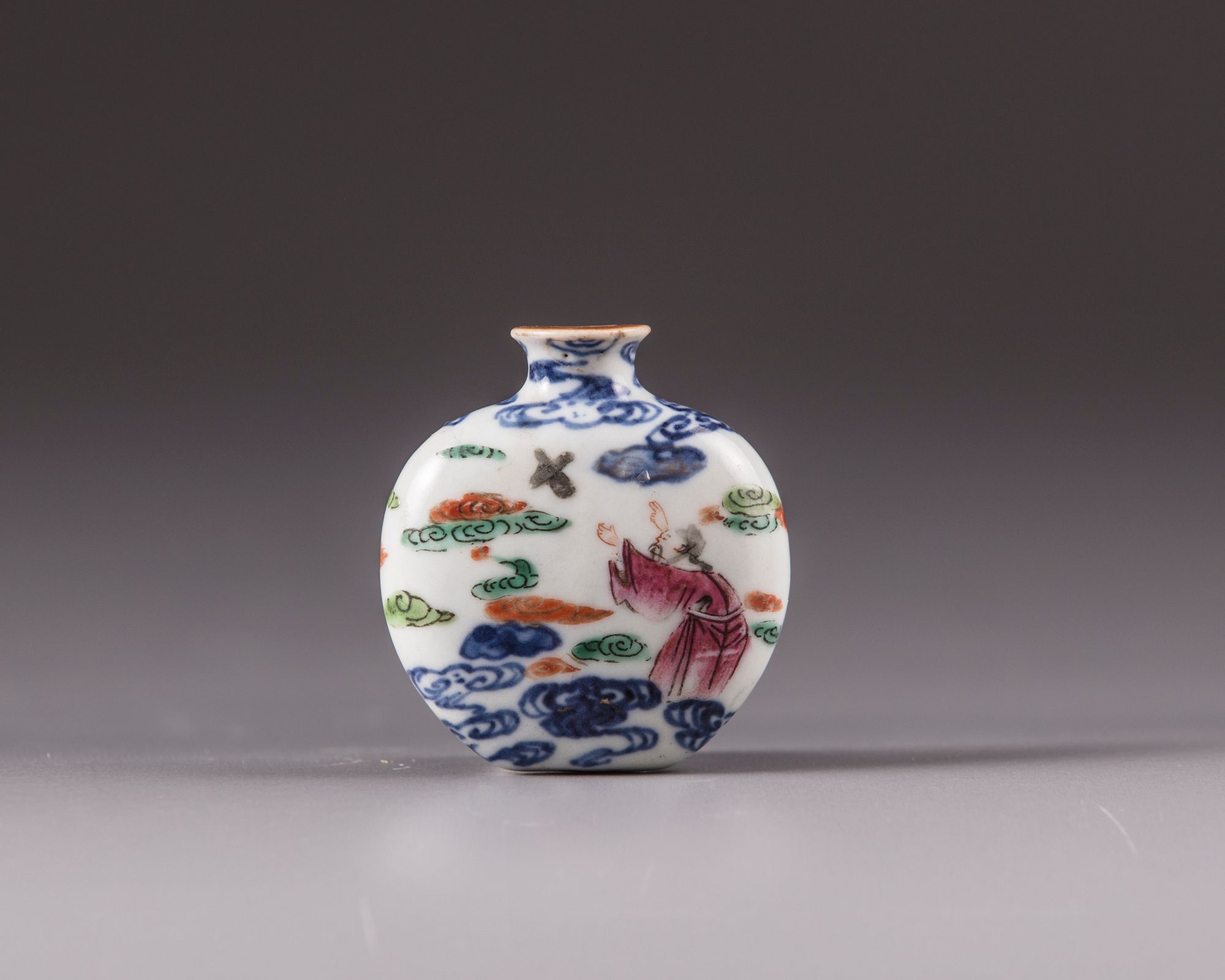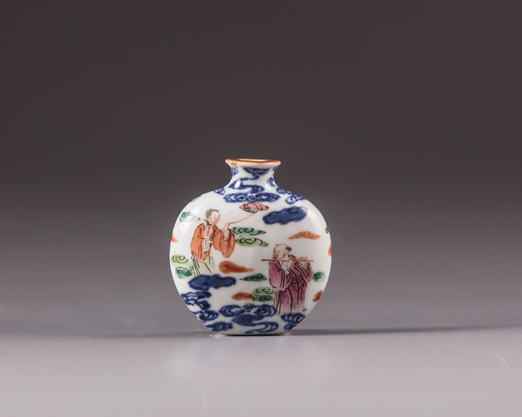 The porcelain snuff bottle, 6 cm long, is decorated with figures at play amongst clouds.