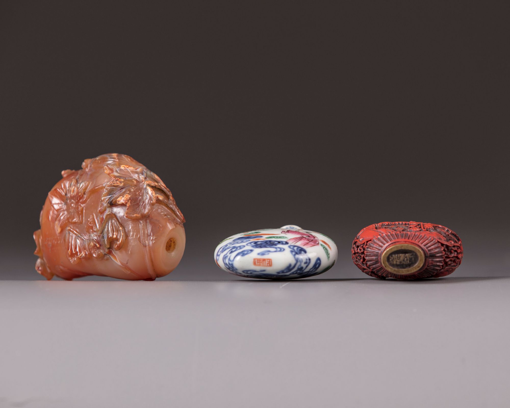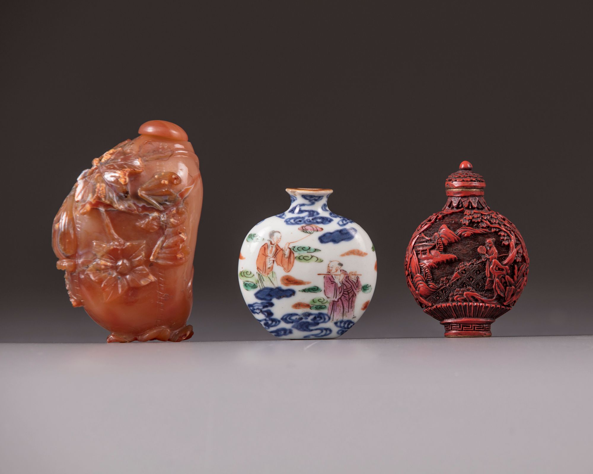 The agate bottle, 8 cm long, is carved with a fu bat beside a flowering branch with a flower shaped base. The lacquer bottle, 6 cm long, is carved through layers of red lacquer depicting a lady beside a tree in a landscape with houses.