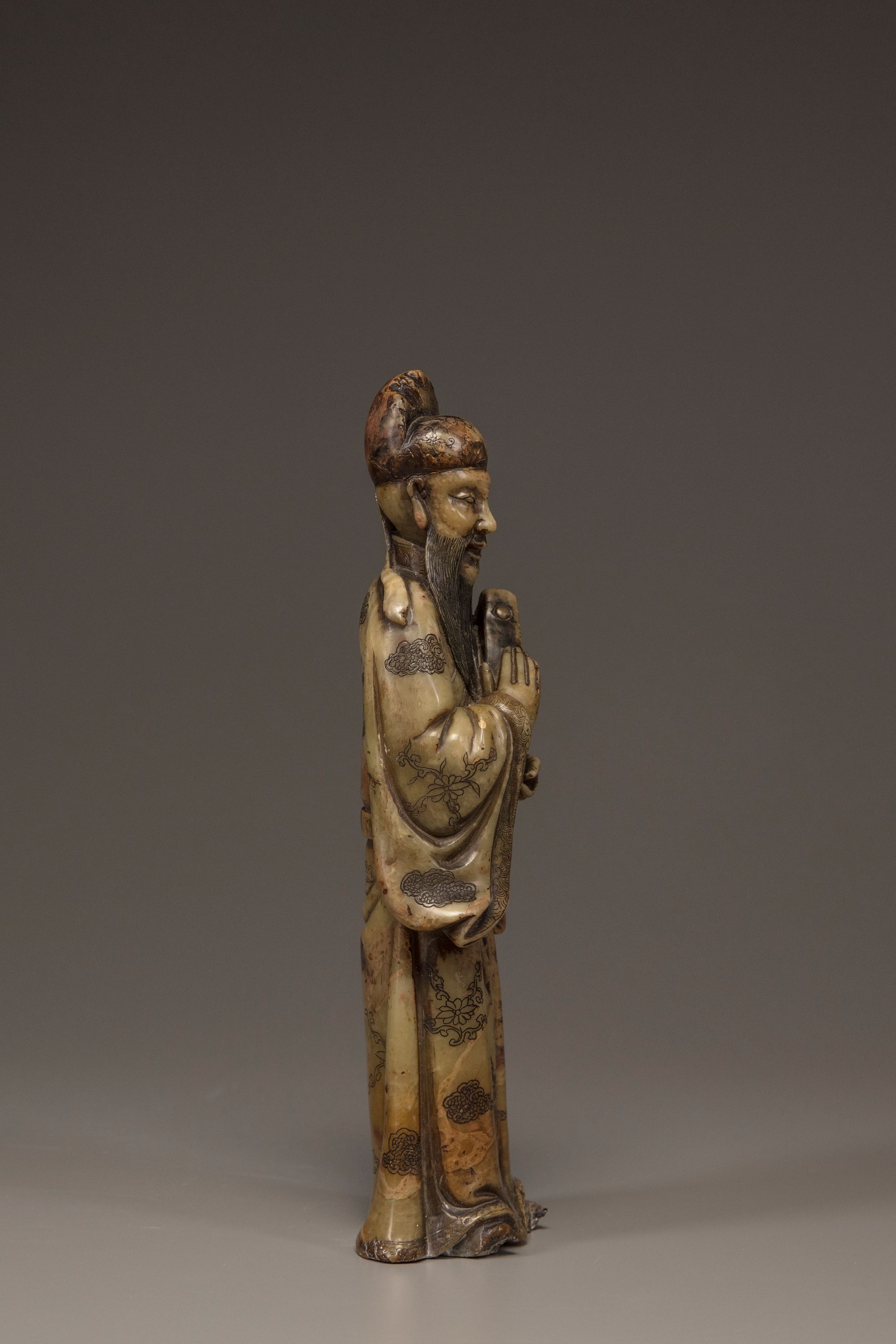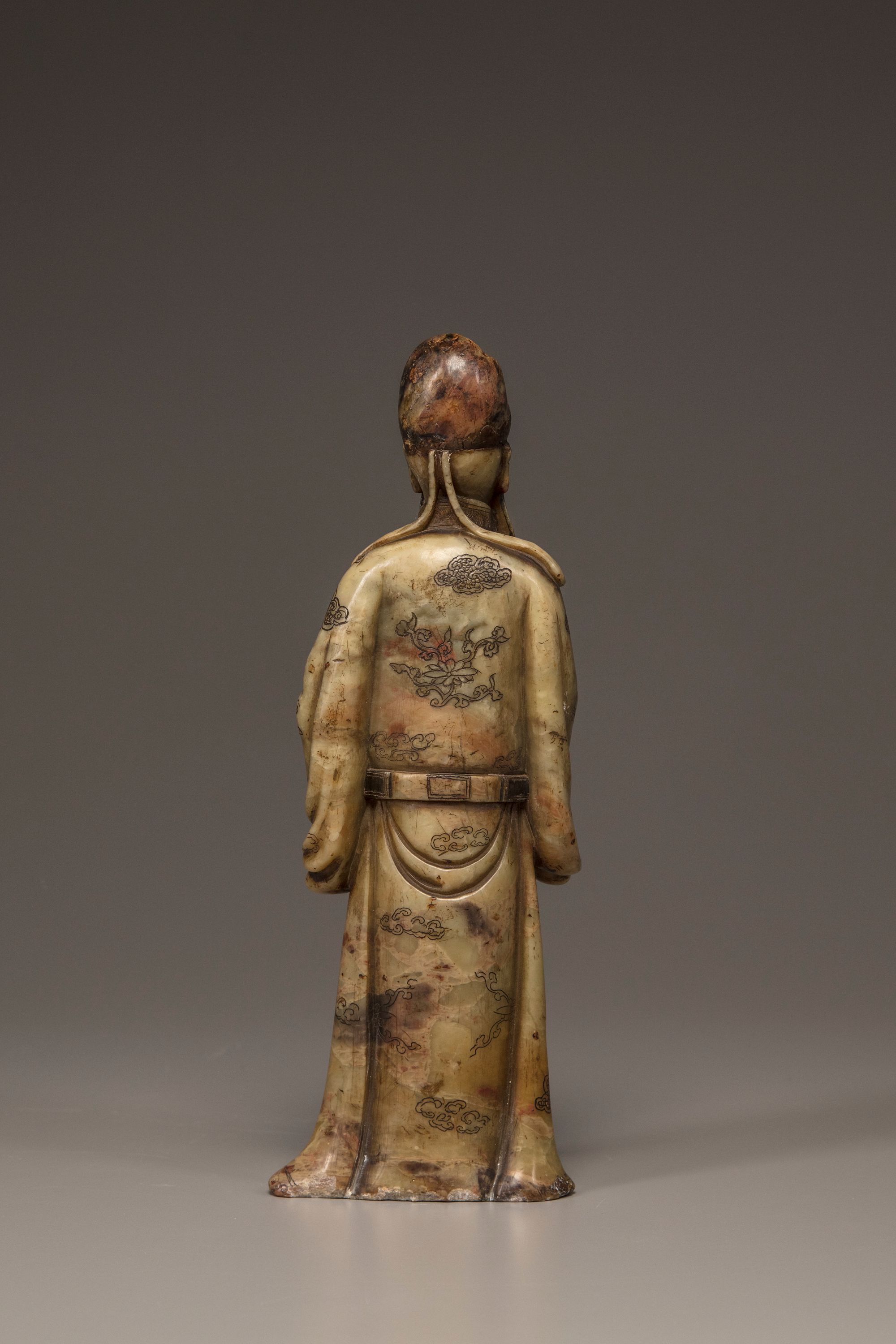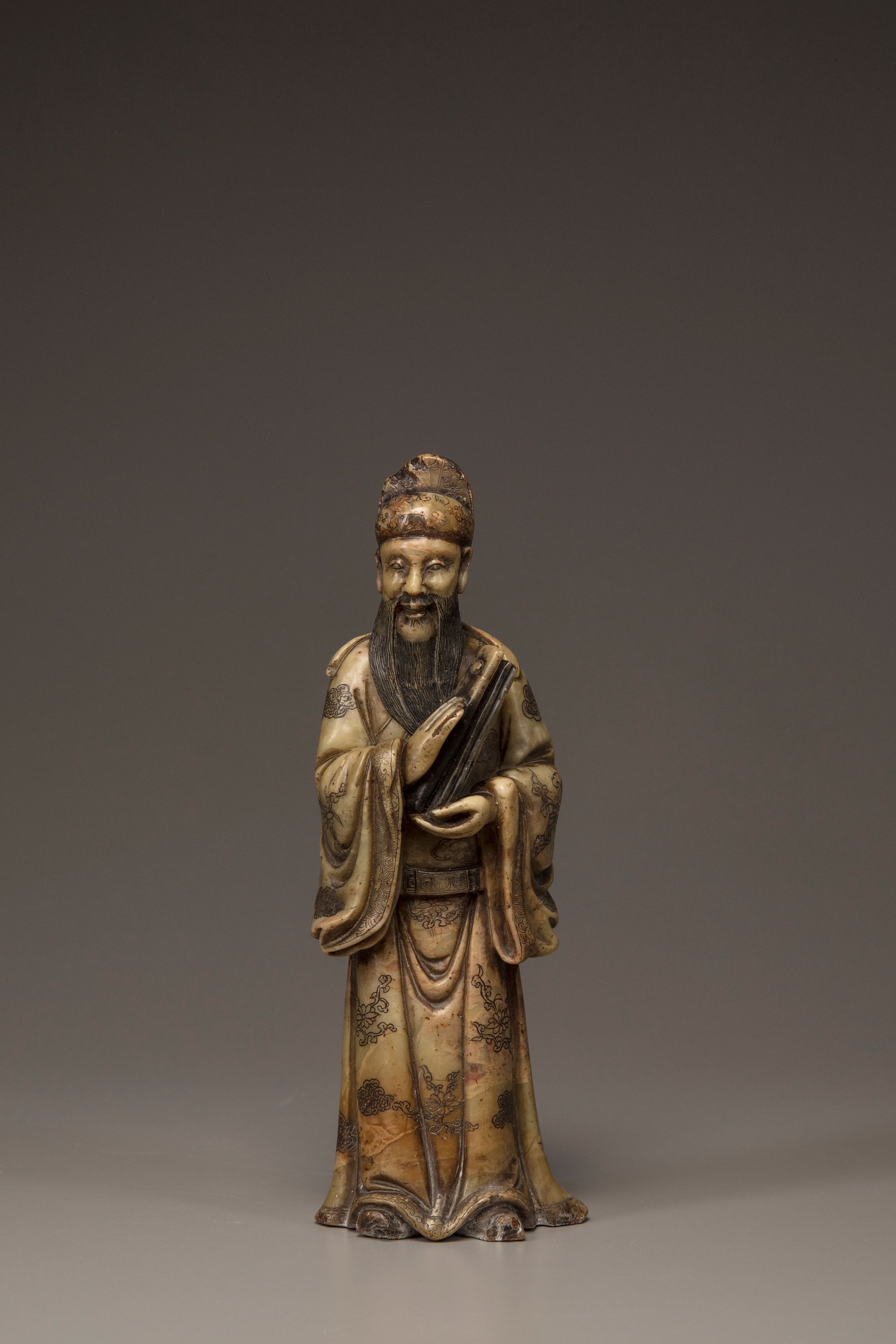The smiling Immortal is carved wearing a scholar's cap and official's robes which are decorated with incised floral designs and cloud scrolls. Cradled in his left arm is his attribute, official castanets. The details of the figure are highlighted in black pigment.