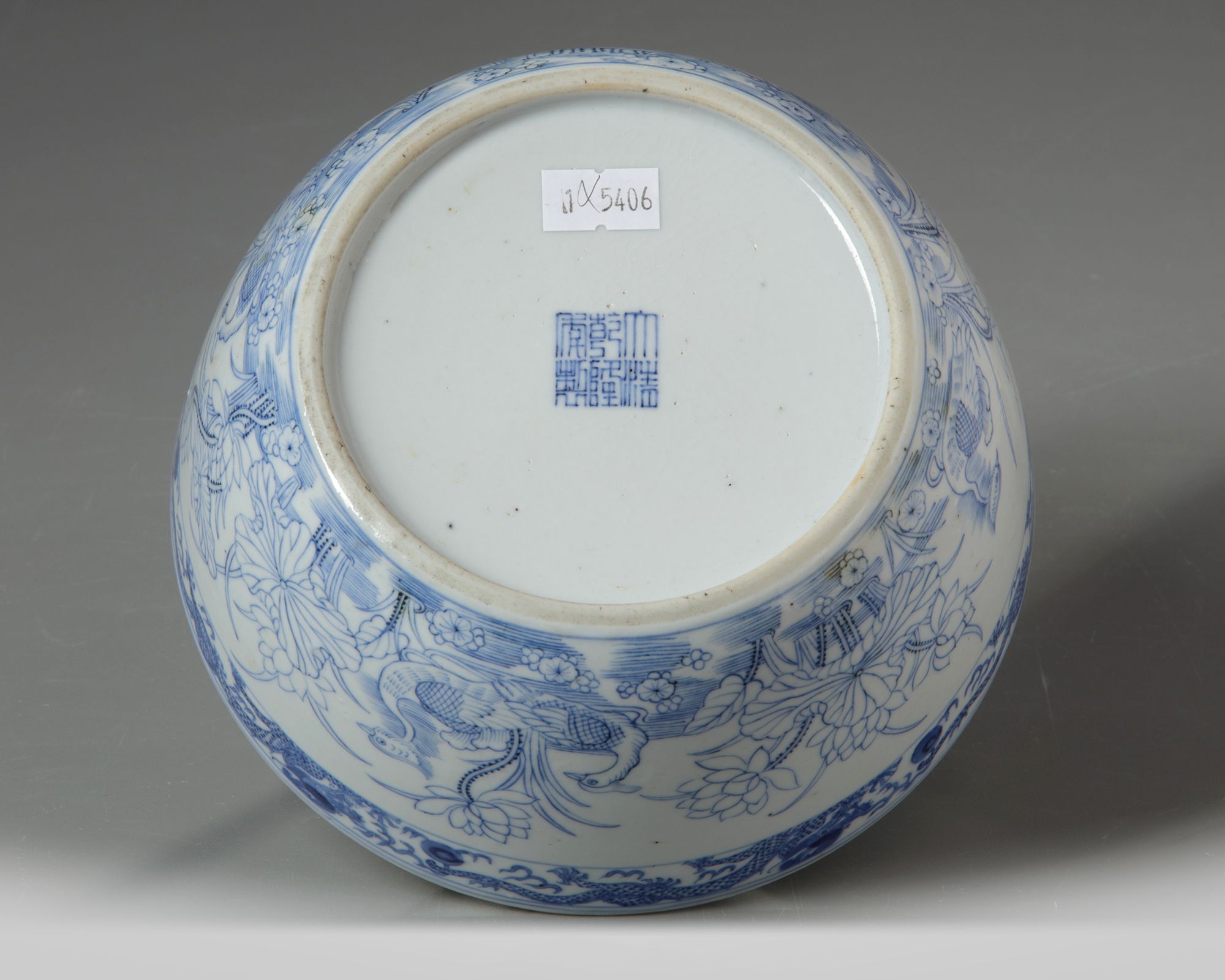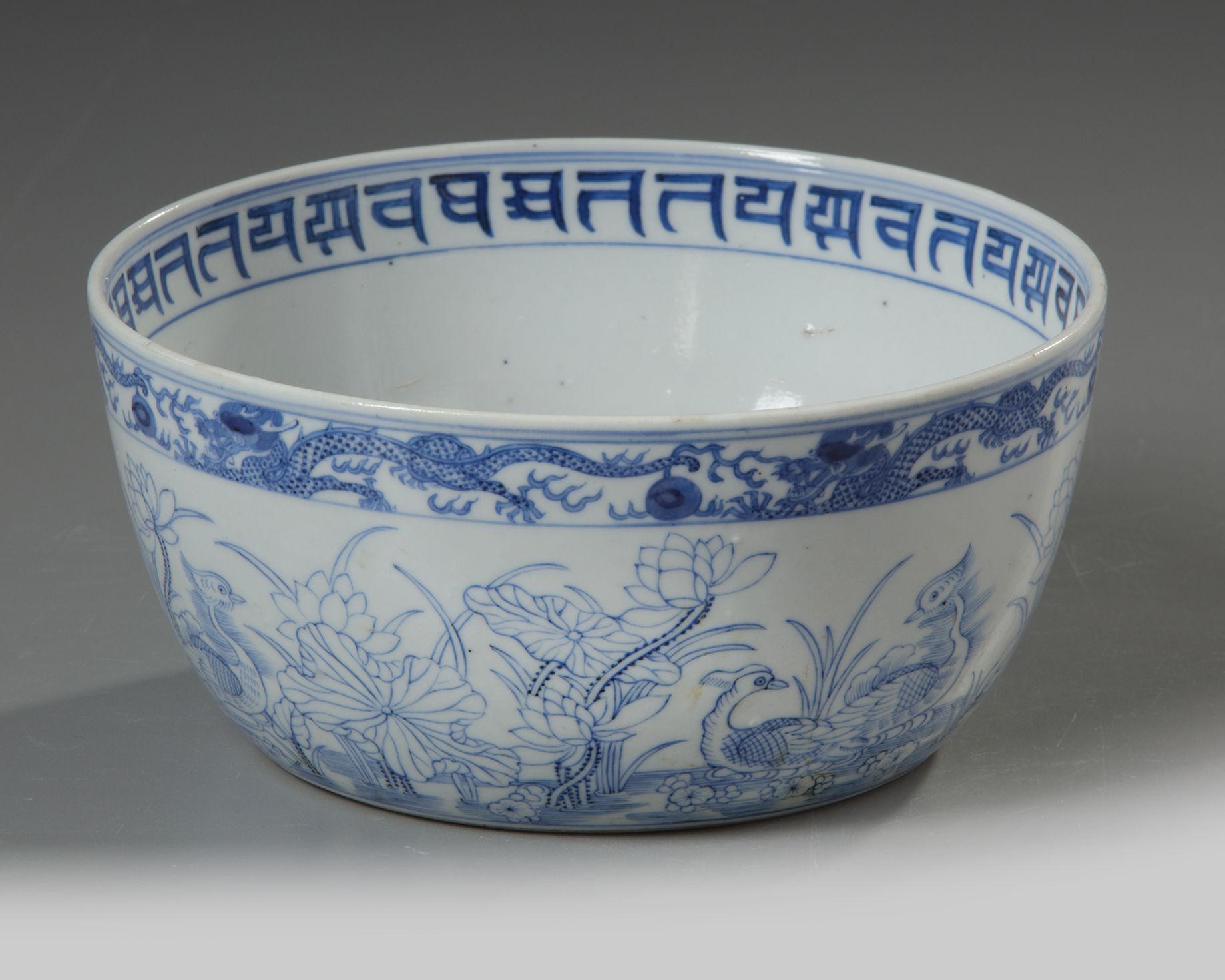 The bowl is decorated to the interior with a roundel enclosing two mandarin ducks and lotus, the rim is encircled with lanca characters. The exterior is decorated with a pairs of mandarin ducks amongst lotus flowers in a pond. The rim is decorated with striding dragons chasing the flaming pearl. The base with an apocryphal Qianlong mark. 16 cm. diam.