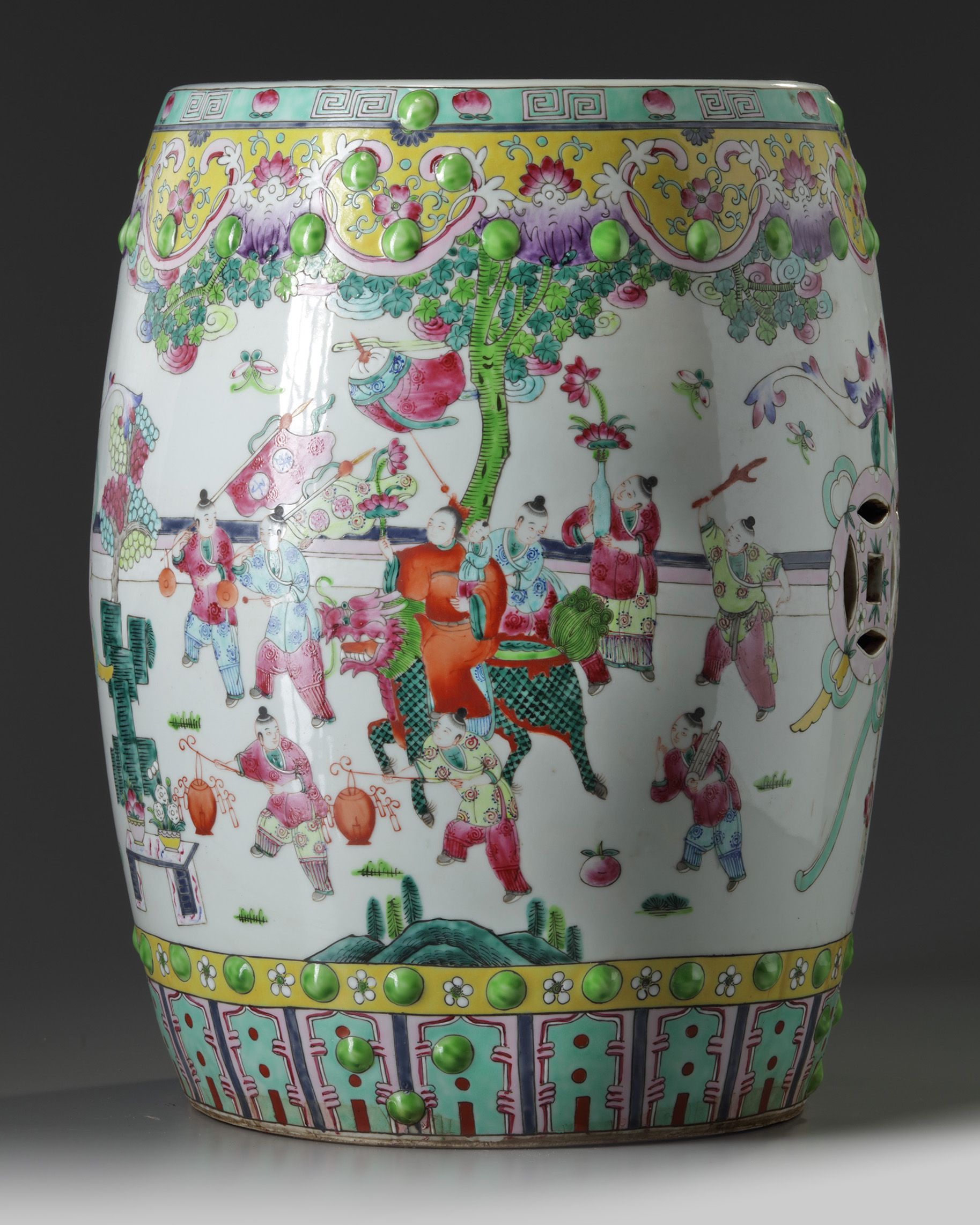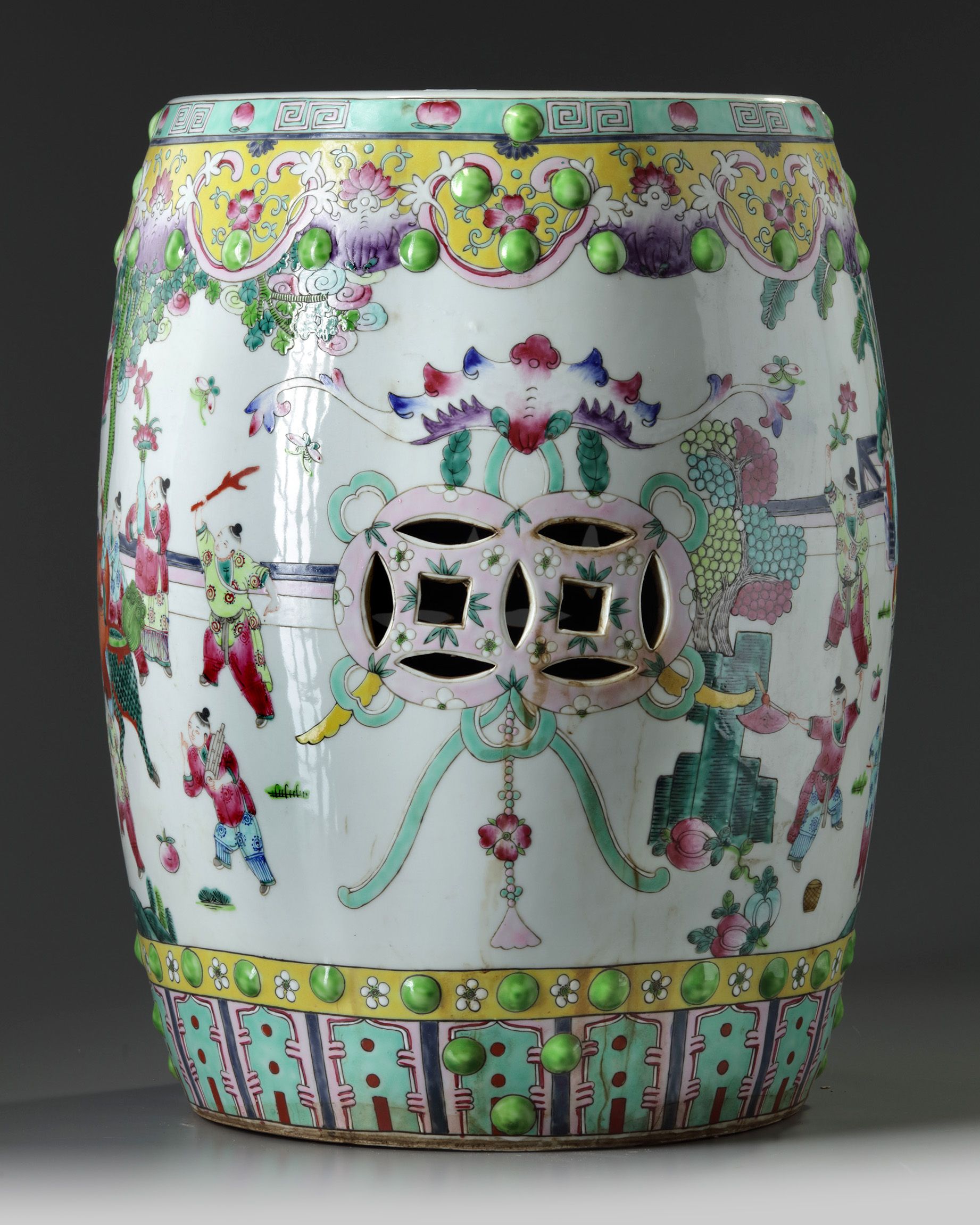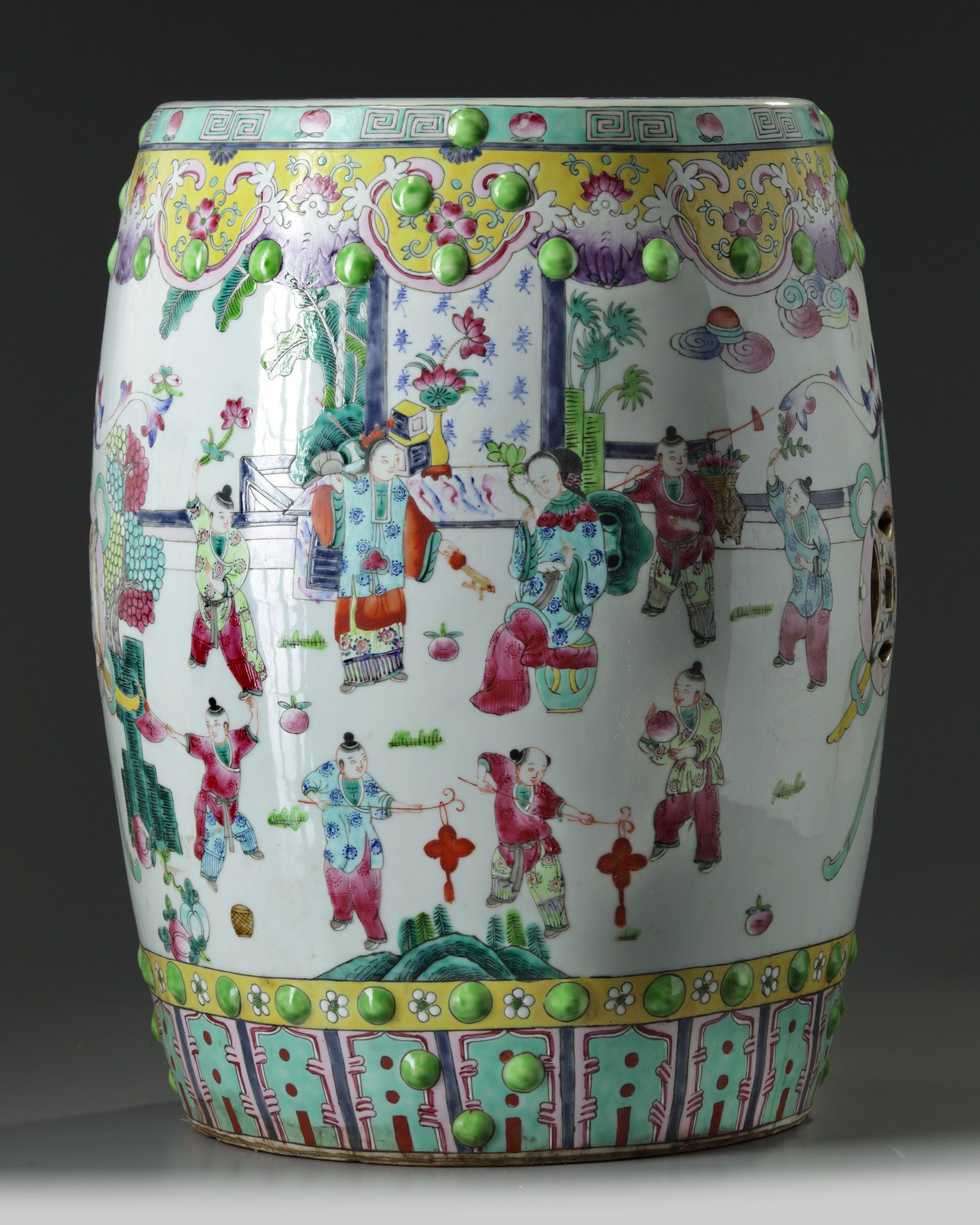 The garden seat is decorated to the sides with a continuous scene of boys at play, interrupted by a bat suspending double pierced-cash symbols, all between two bands of raised nodes and a ruyi-head and lappet band. The upper section is decorated with two boys at play around a further pierced cash symbol.
