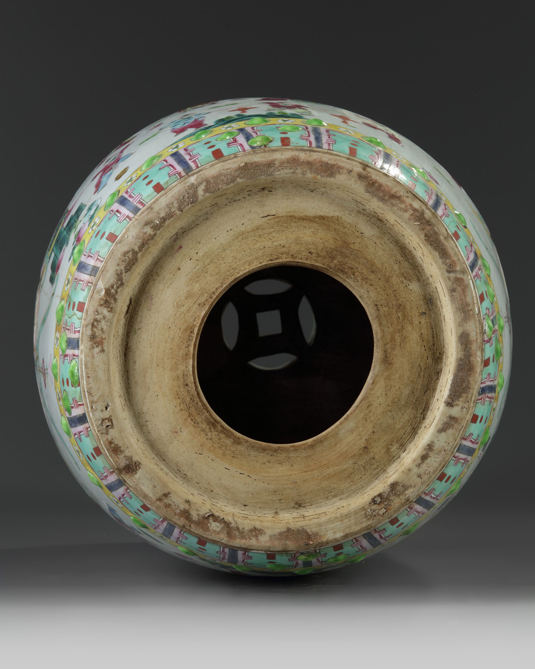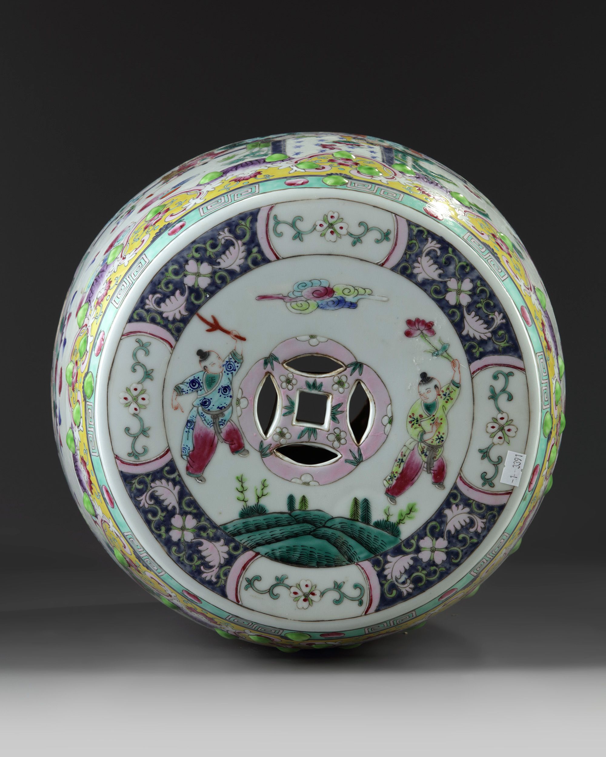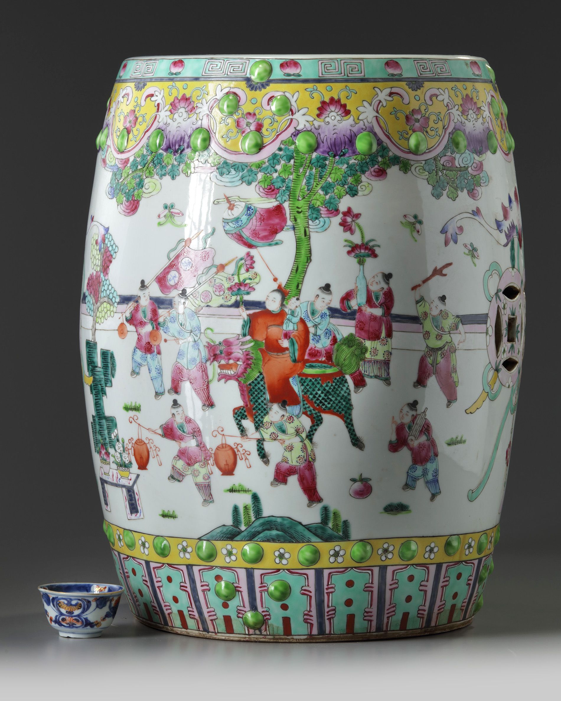 The garden seat is decorated to the sides with a continuous scene of boys at play, interrupted by a bat suspending double pierced-cash symbols, all between two bands of raised nodes and a ruyi-head and lappet band. The upper section is decorated with two boys at play around a further pierced cash symbol.