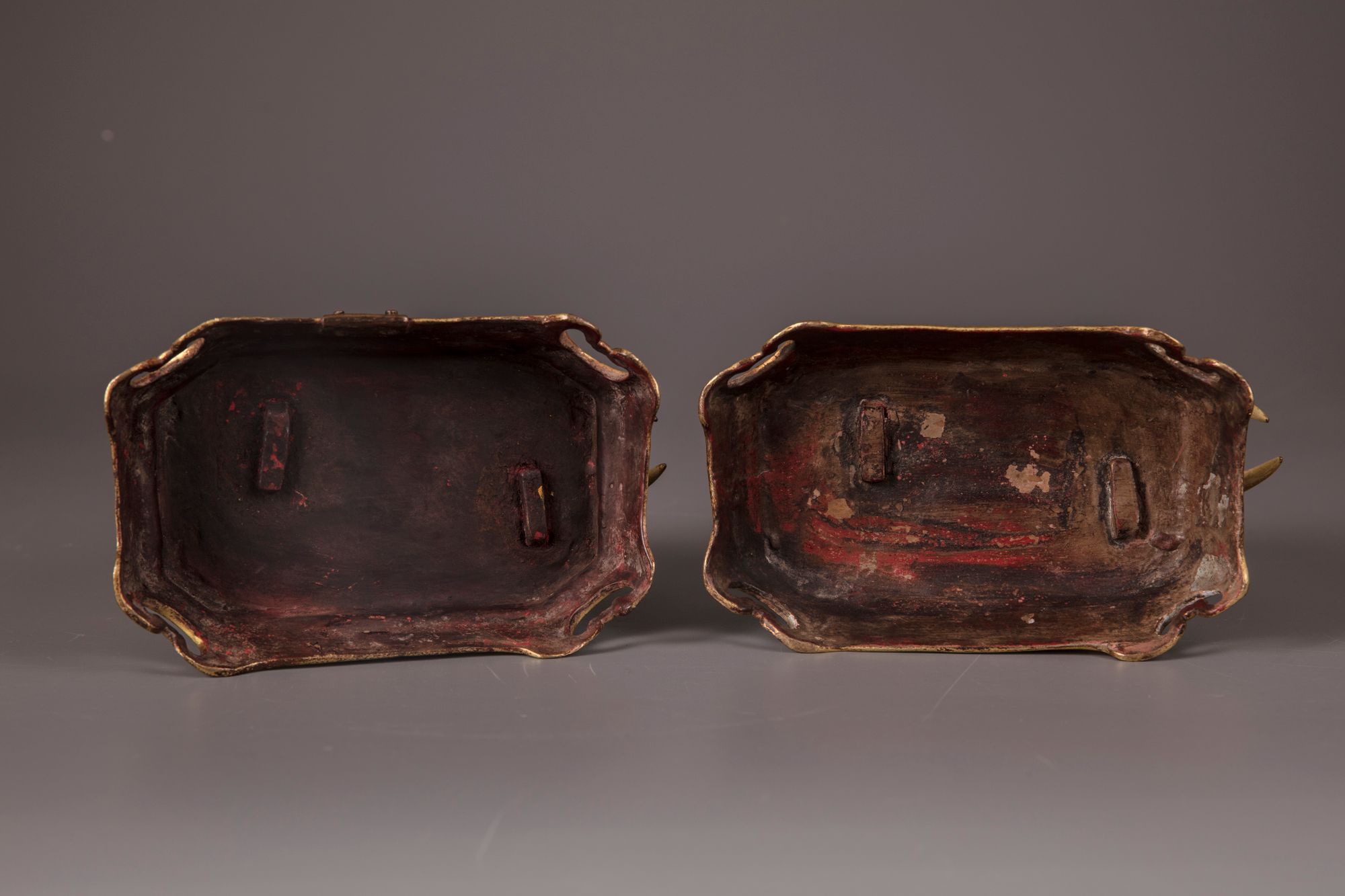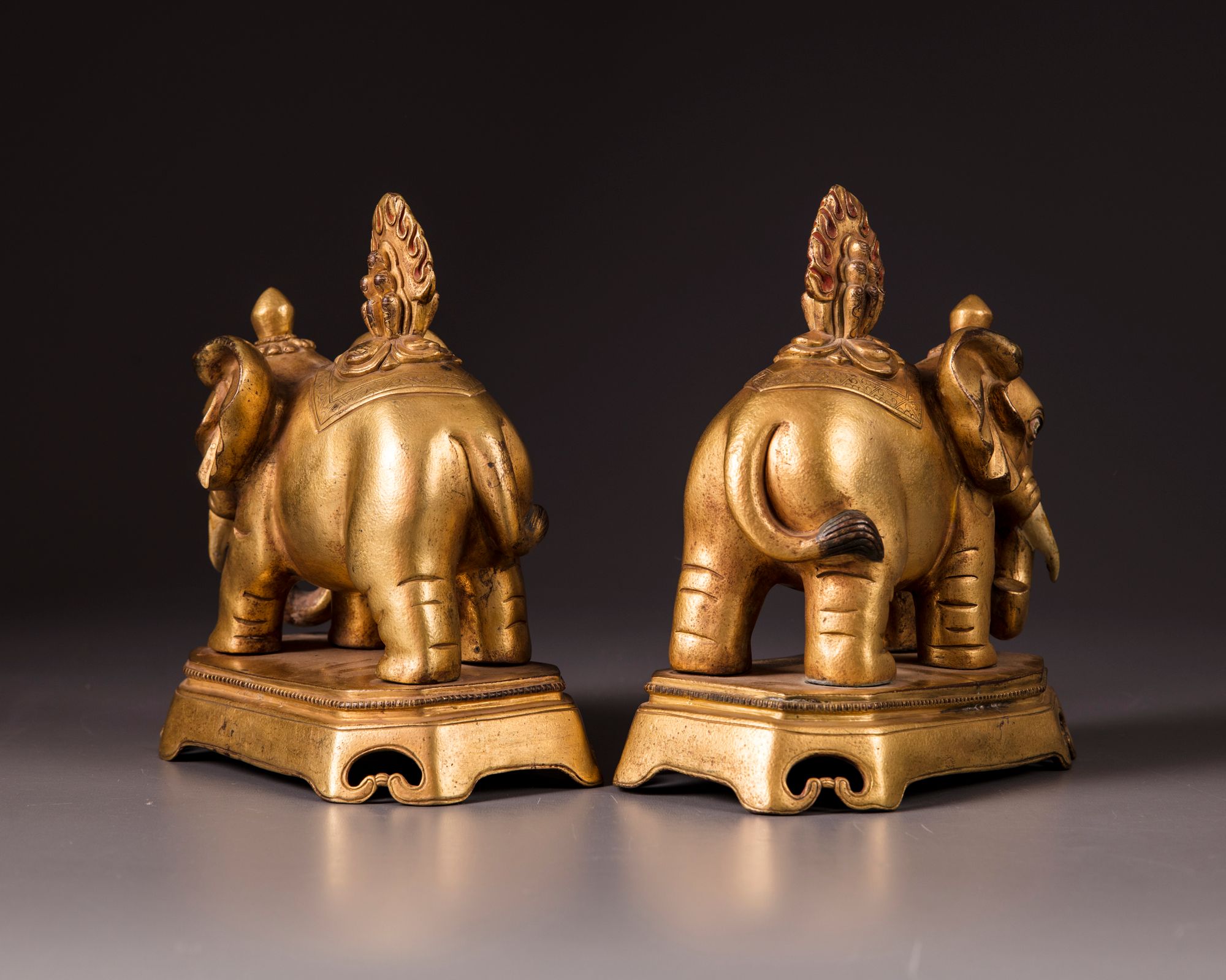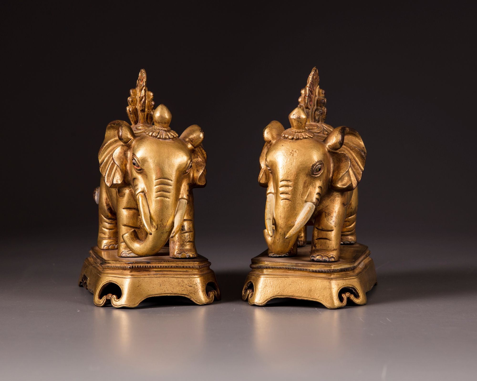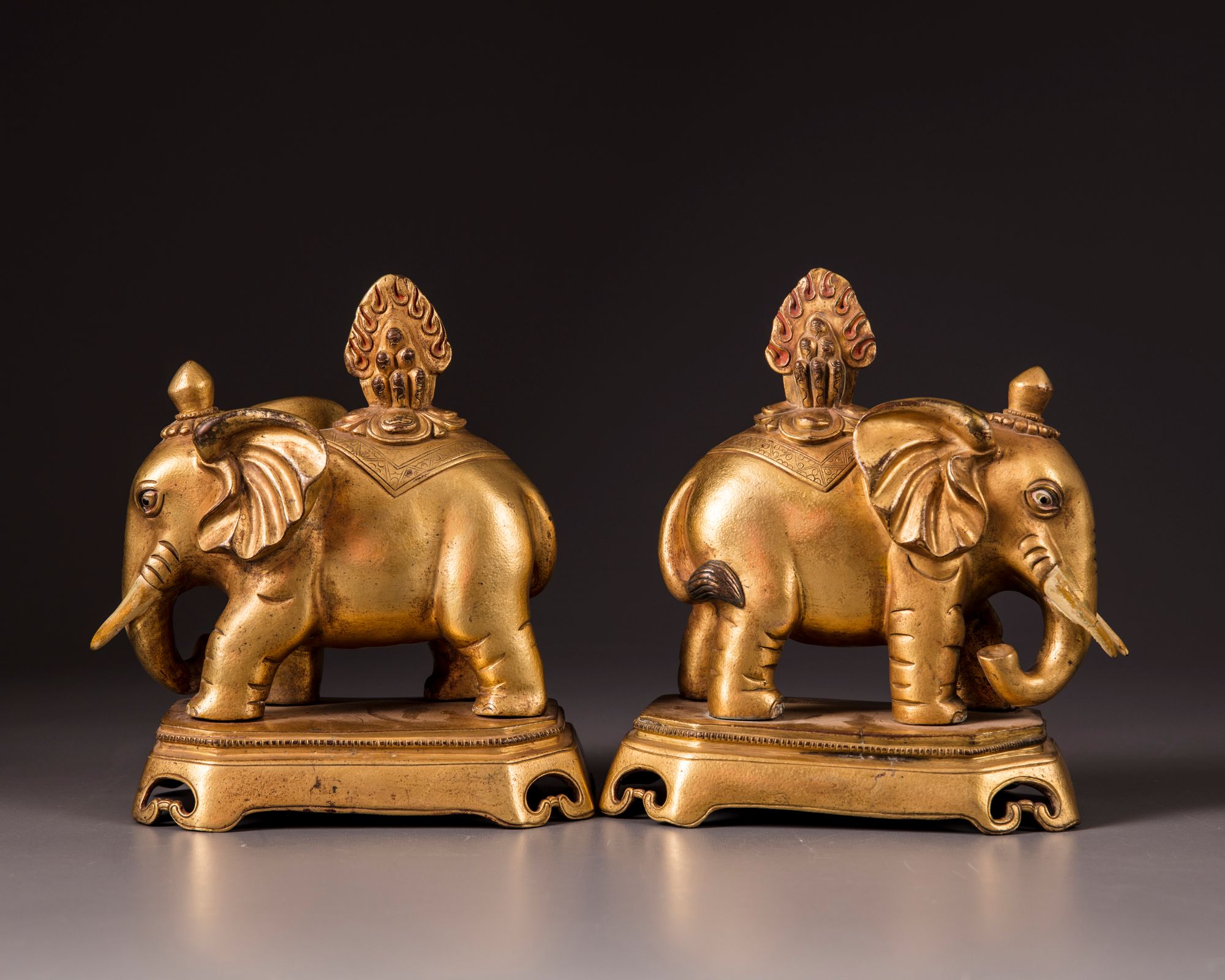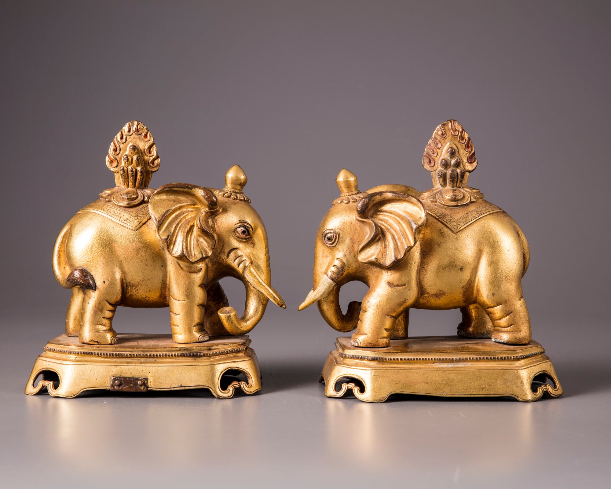 Each elephant is modelled foursquare with its trunk flicked backwards, each bearing the Three Jewels of Buddhism, standing on a four-legged base.