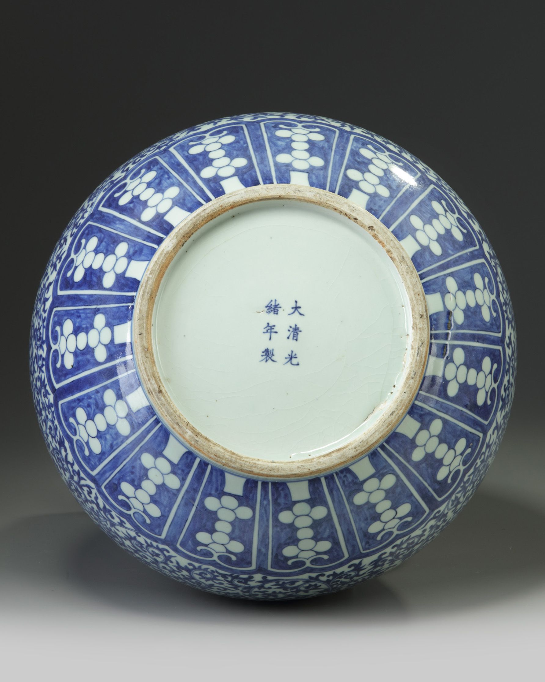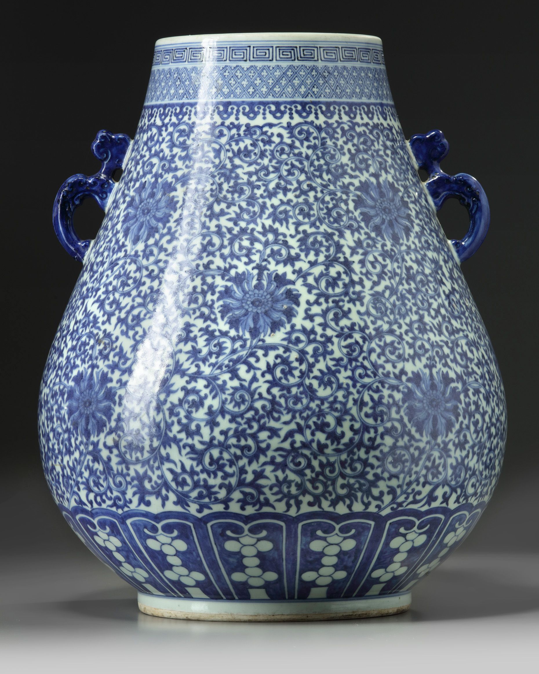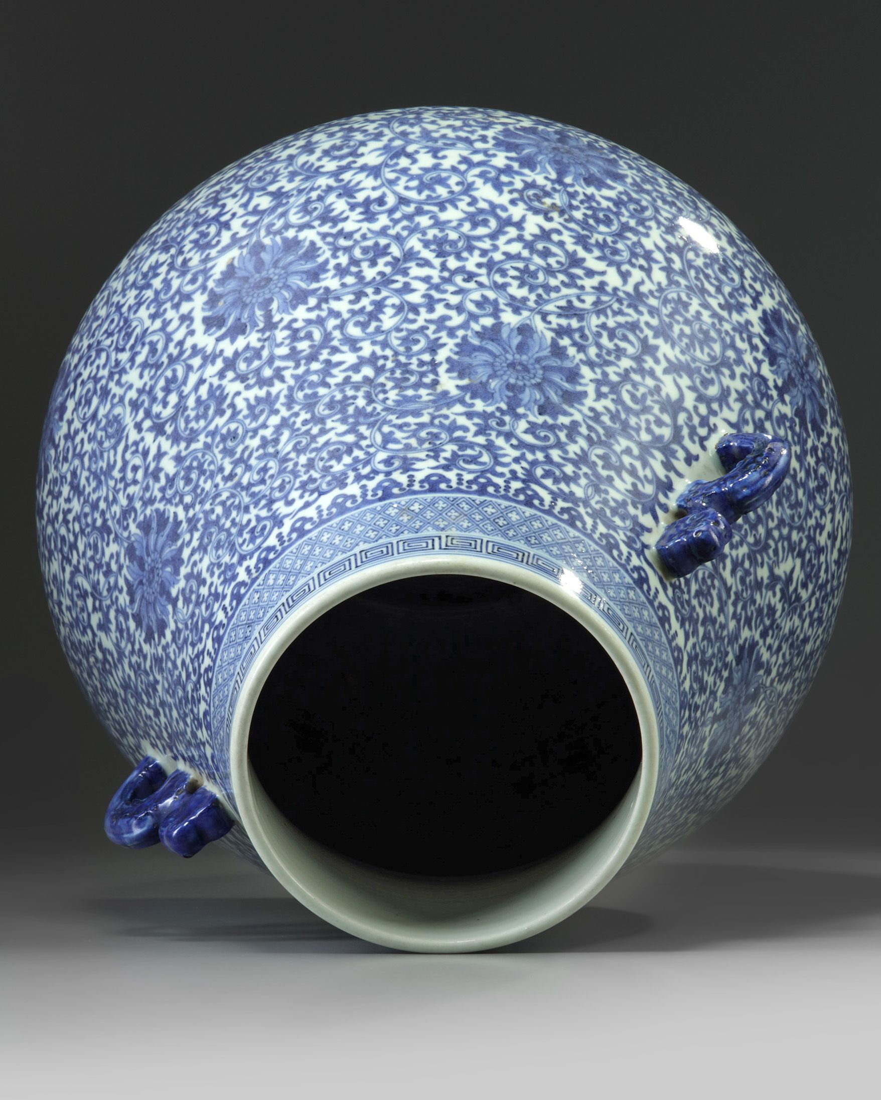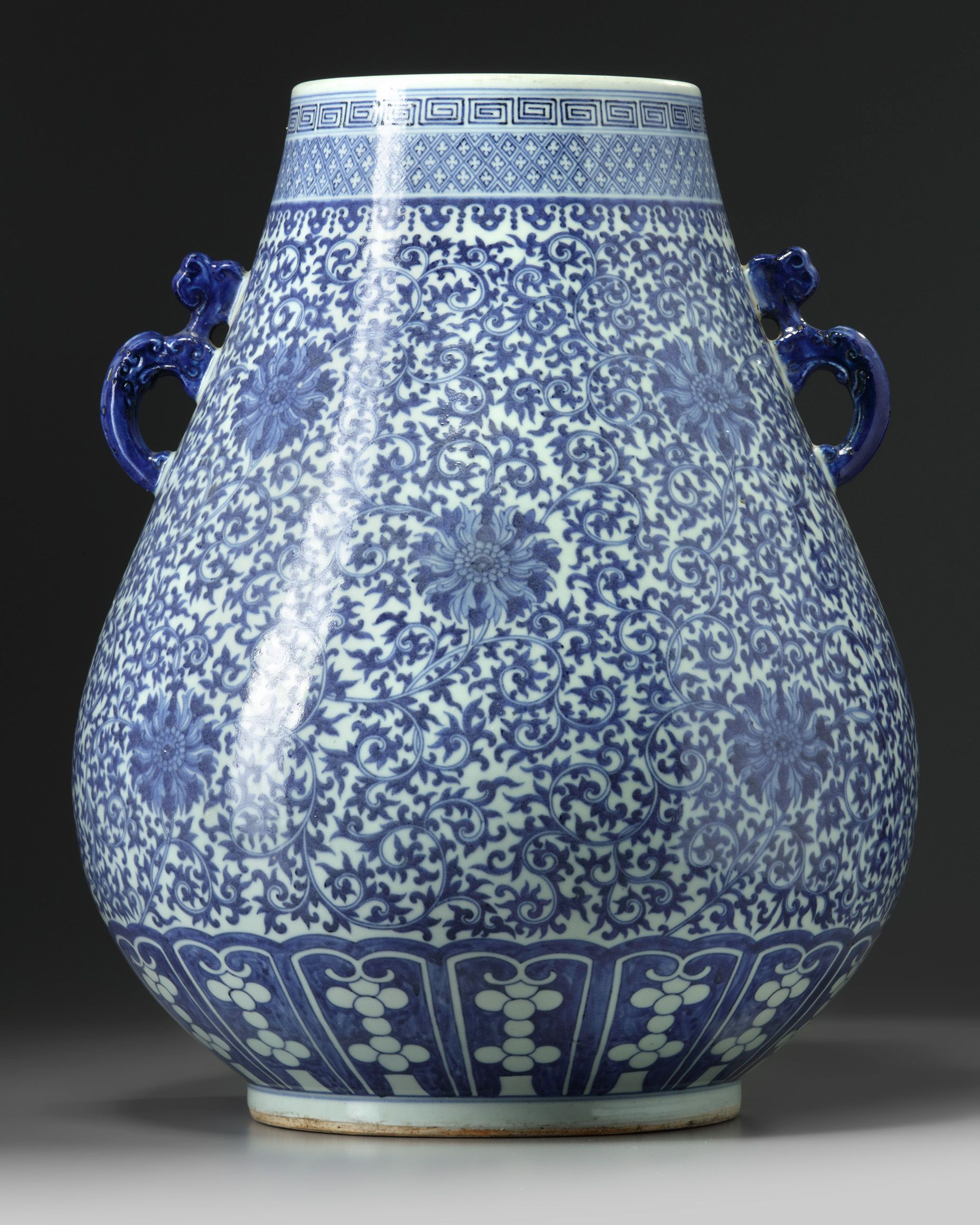 The vase is decorated with two stylised beast handles to the neck, the pear-shaped body is decorated with densely scrolling lotus above a lappet band by the foot. The rim is decorated with a pendant ruyi-head band, trellis band, and a squared scroll band. The base is decorated with a Guangxu mark.