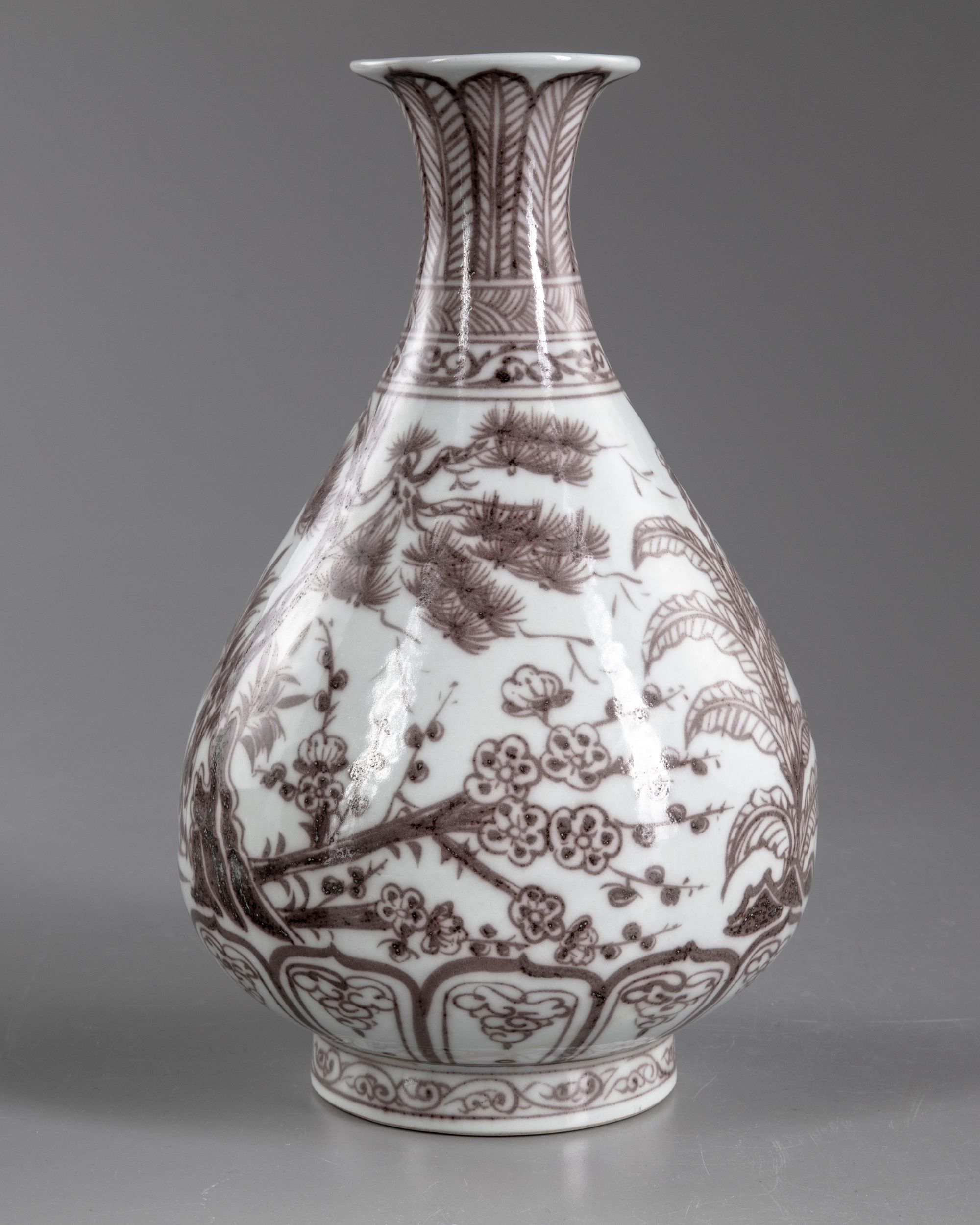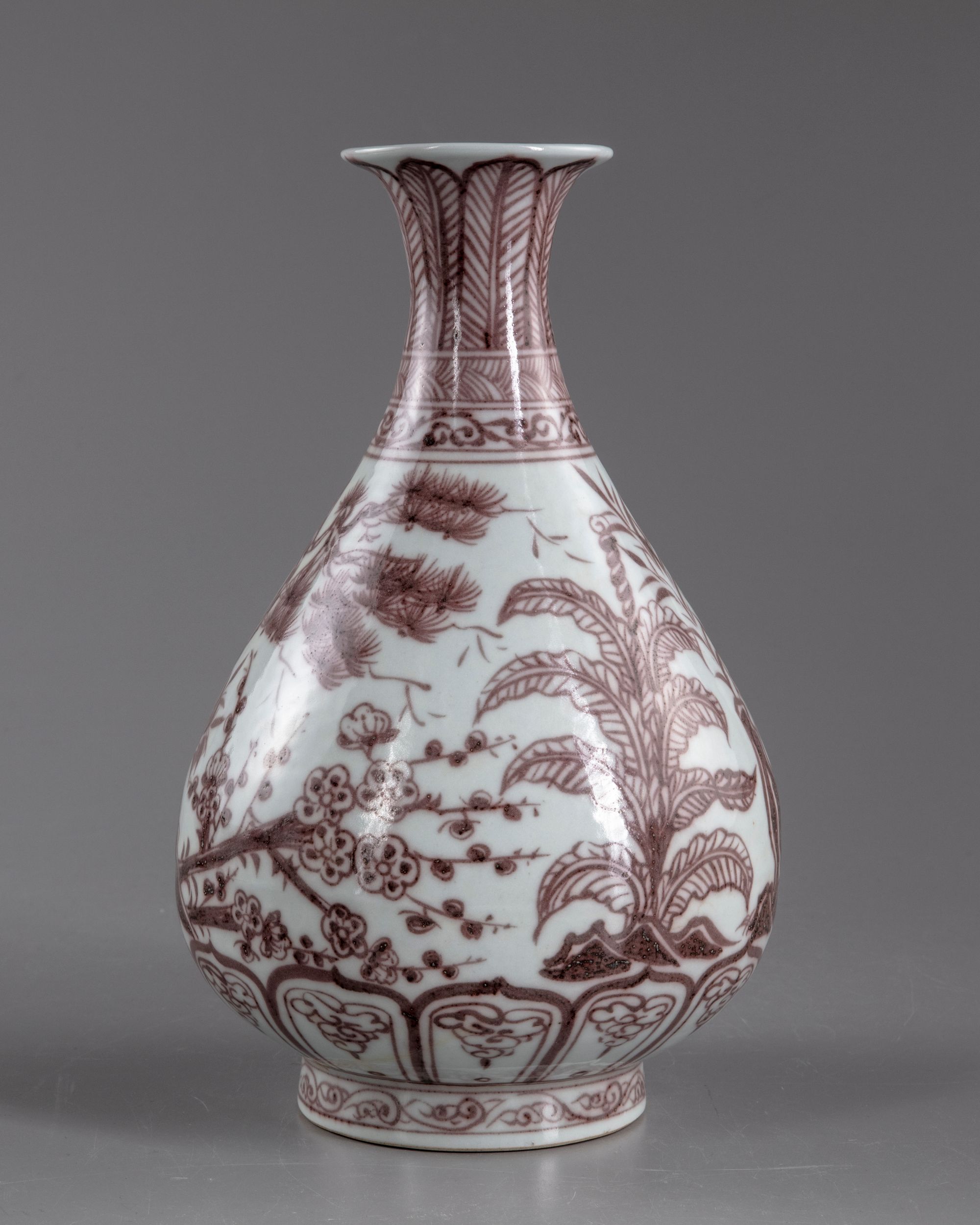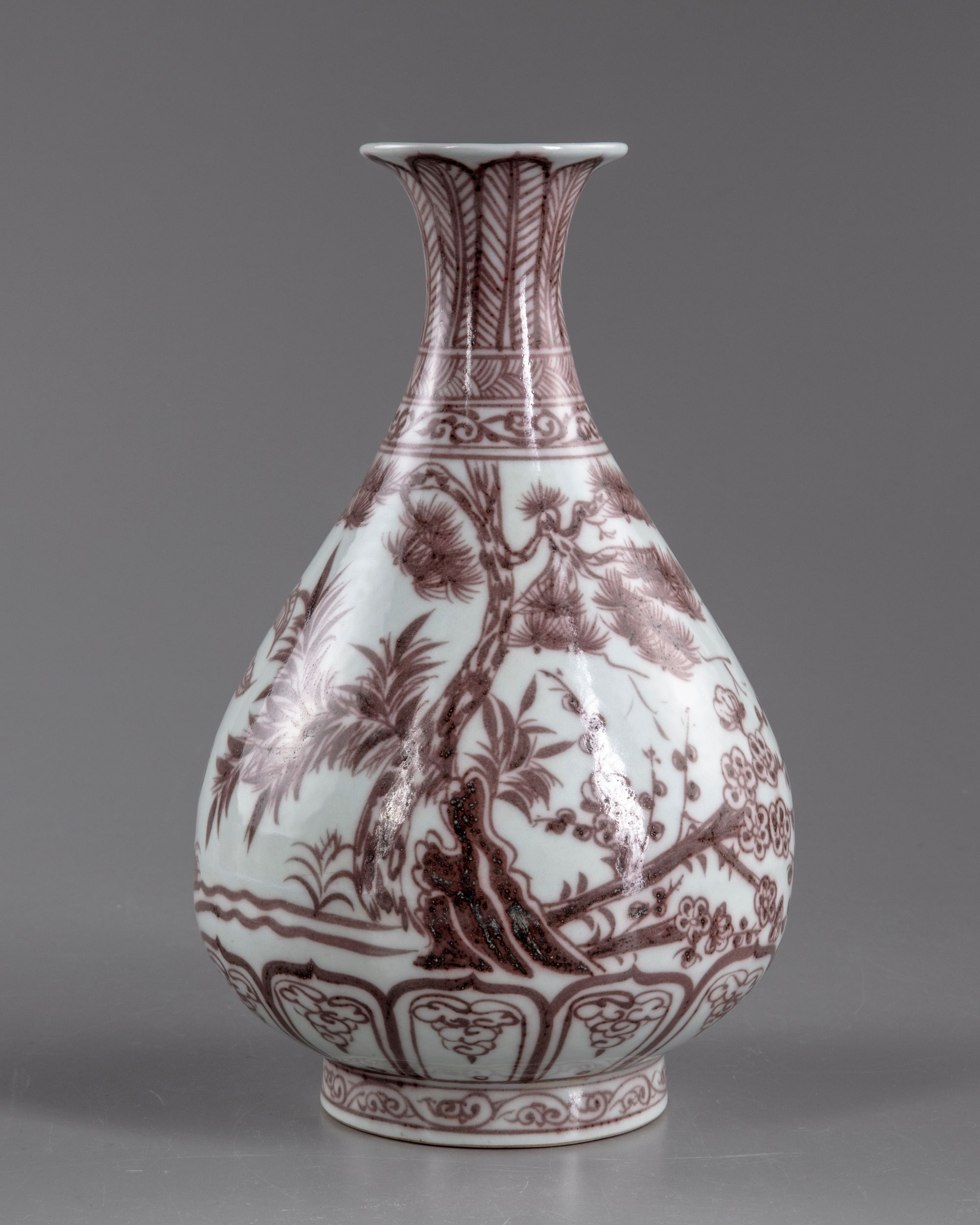 A CHINESE UNDERGLAZE COPPER-RED 'THREE FRIENDS OF WINTER' PEAR-SHAPED VASE, YUHUCHUNPING