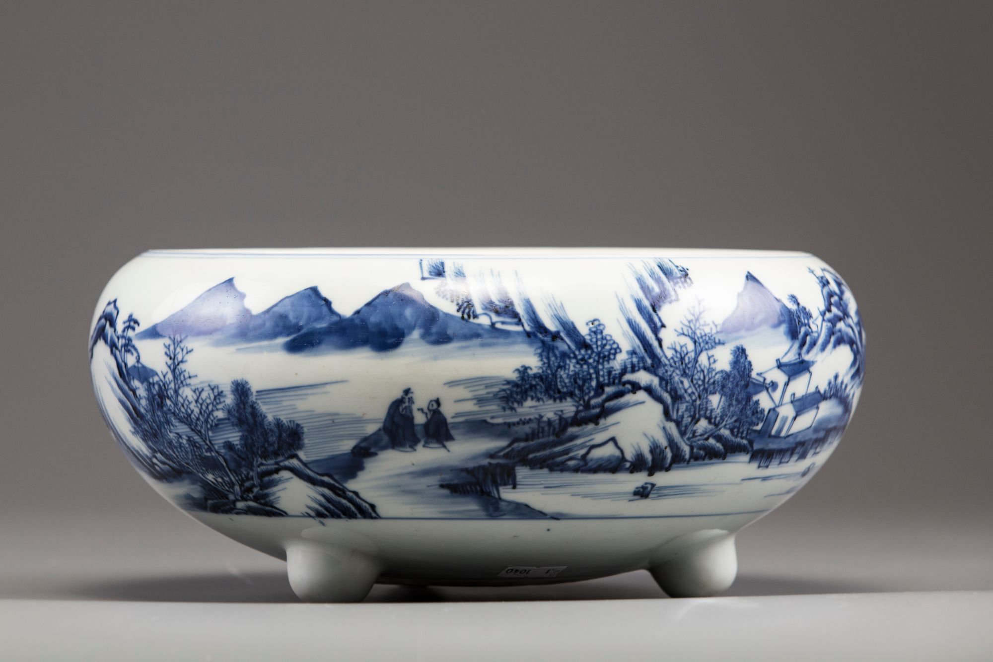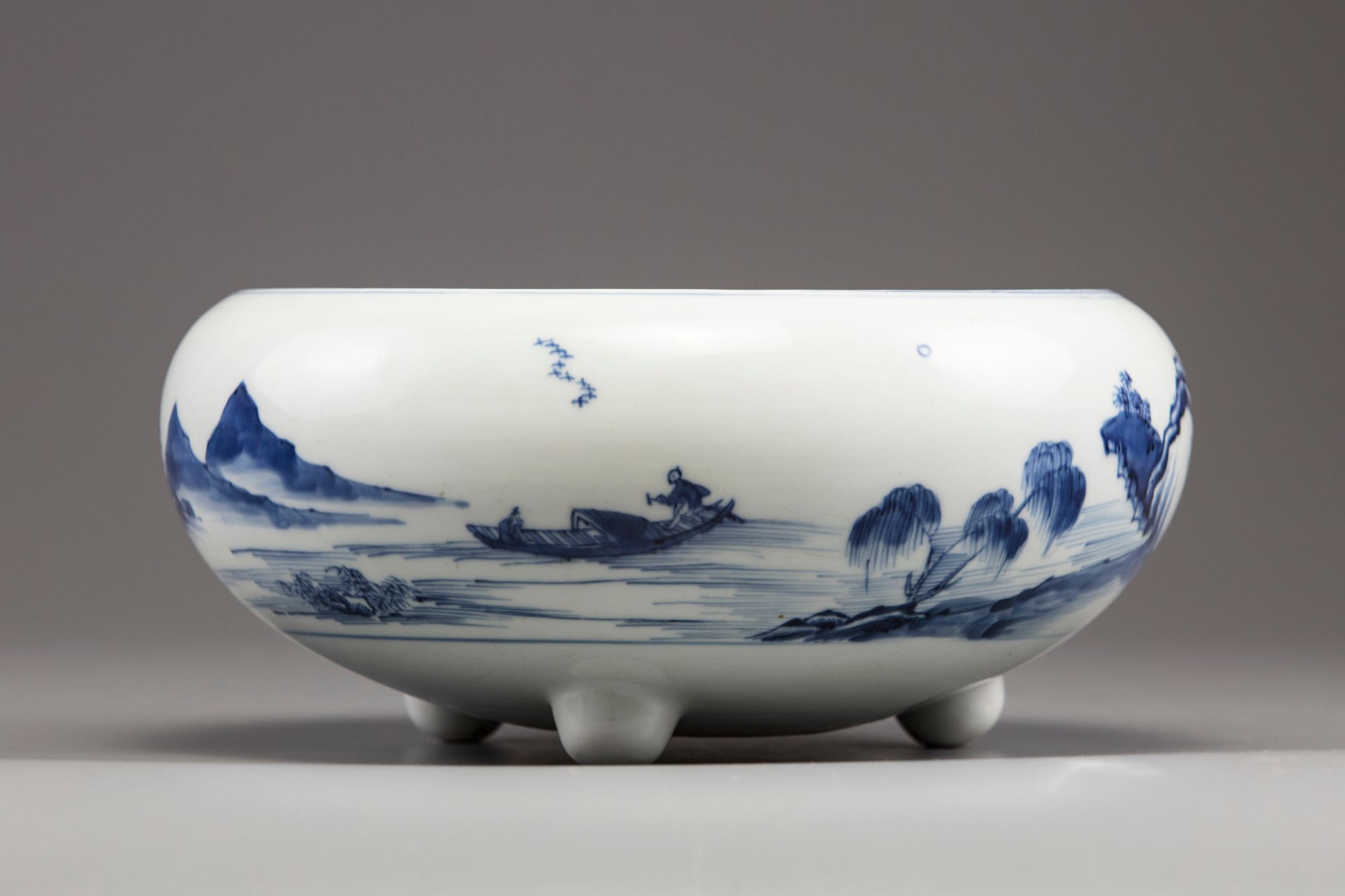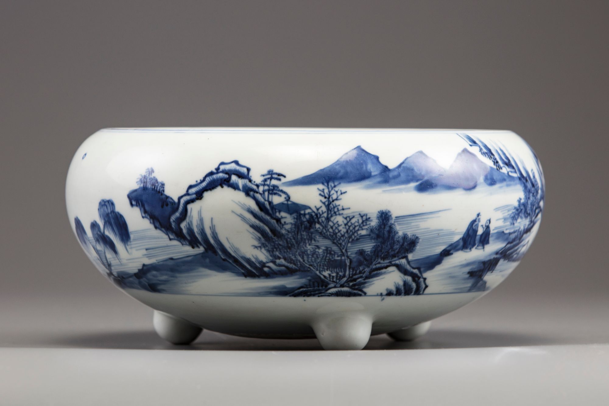 The compressed globular body is decorated with a continuous scene of figures at leisure and on a sampan amongst pavilions in a mountainous river landscape. The censer stands on three rounded feet and a circular area to the base left unglazed.
