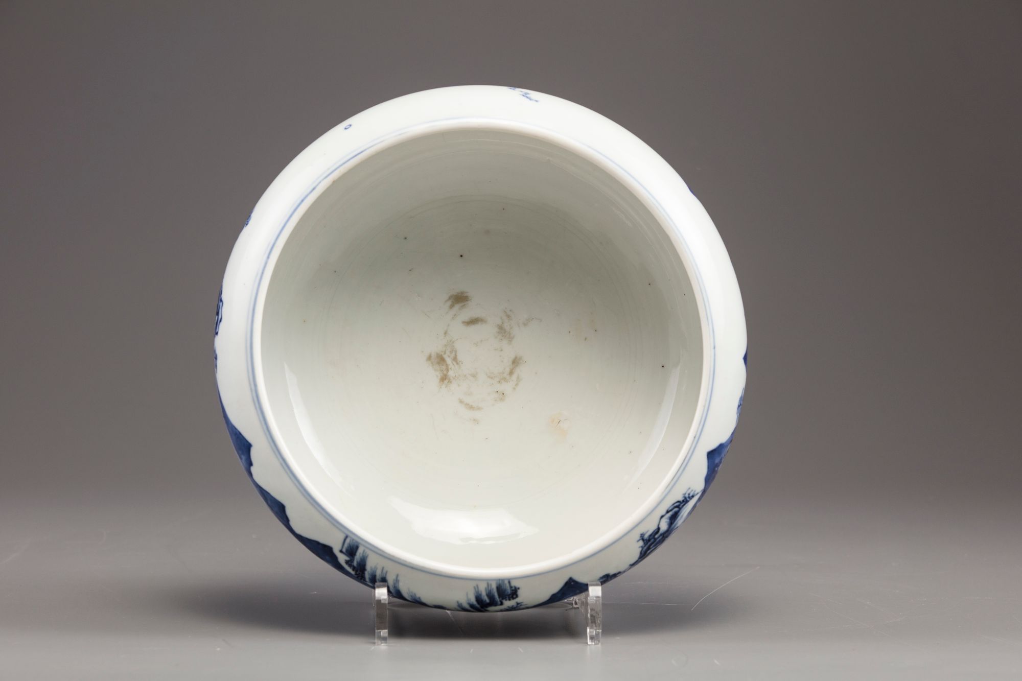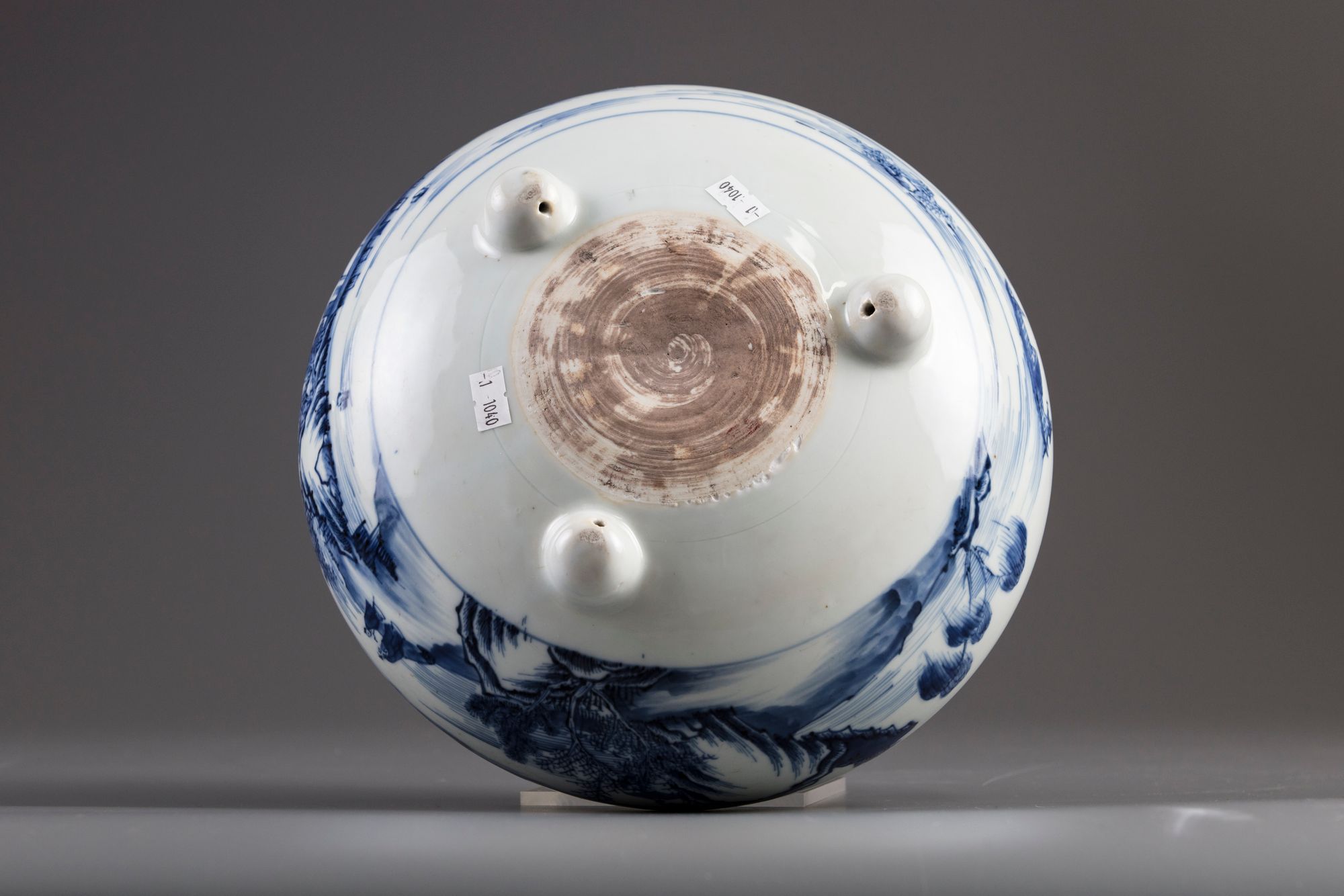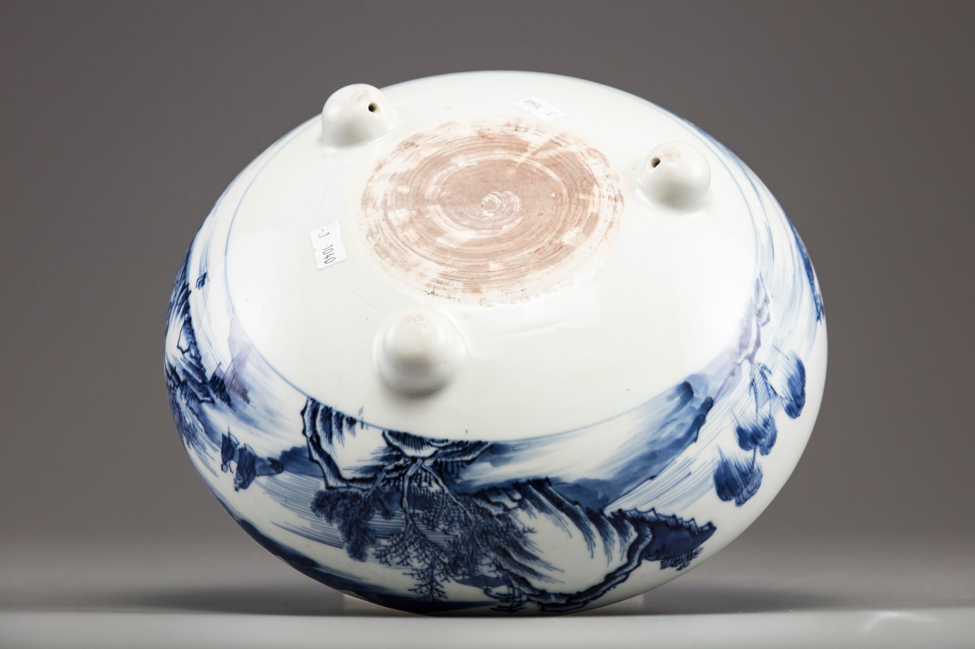The compressed globular body is decorated with a continuous scene of figures at leisure and on a sampan amongst pavilions in a mountainous river landscape. The censer stands on three rounded feet and a circular area to the base left unglazed.