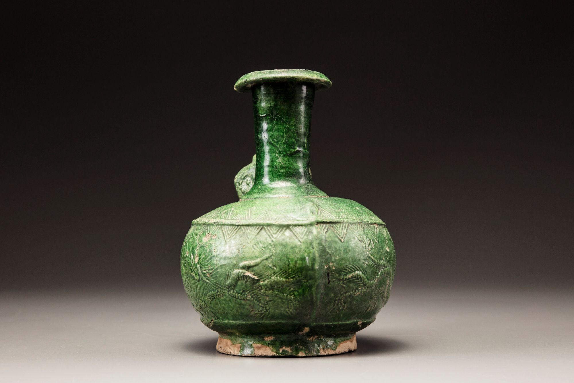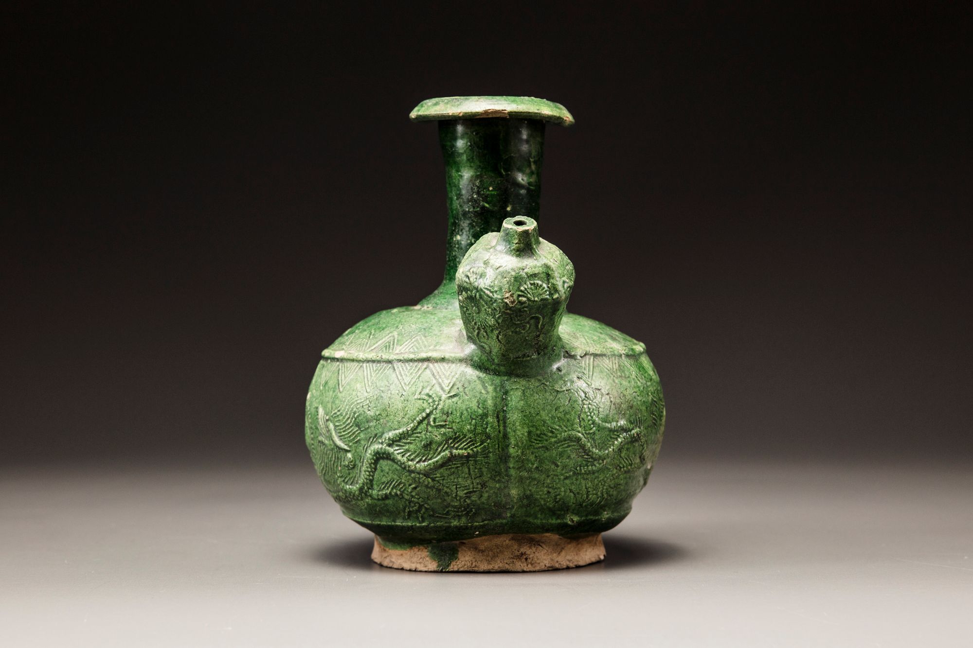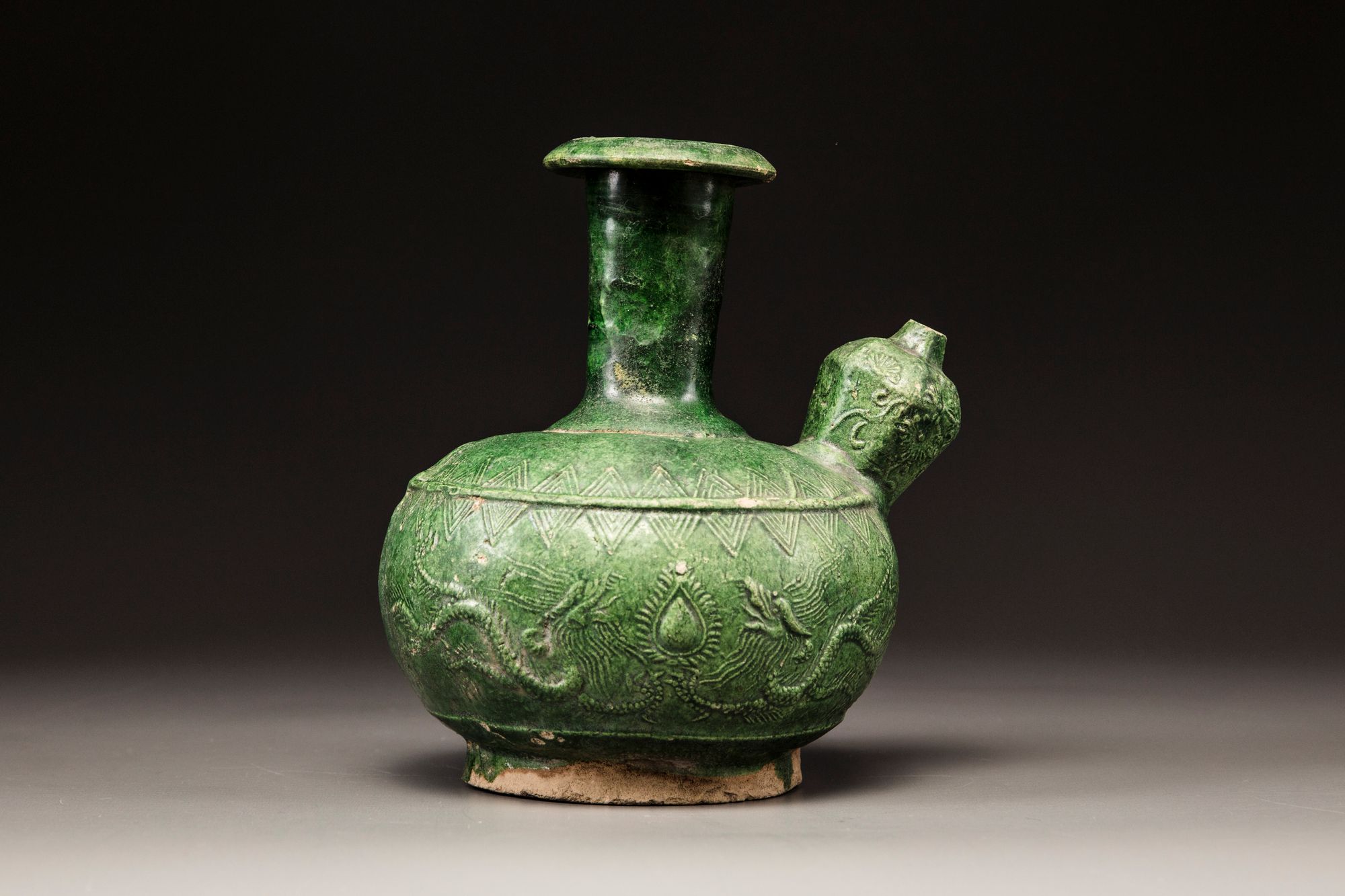 The vessel is decorated on both sides in relief with two dragons chasing the flaming pearl. The spout is decorated with flowers.