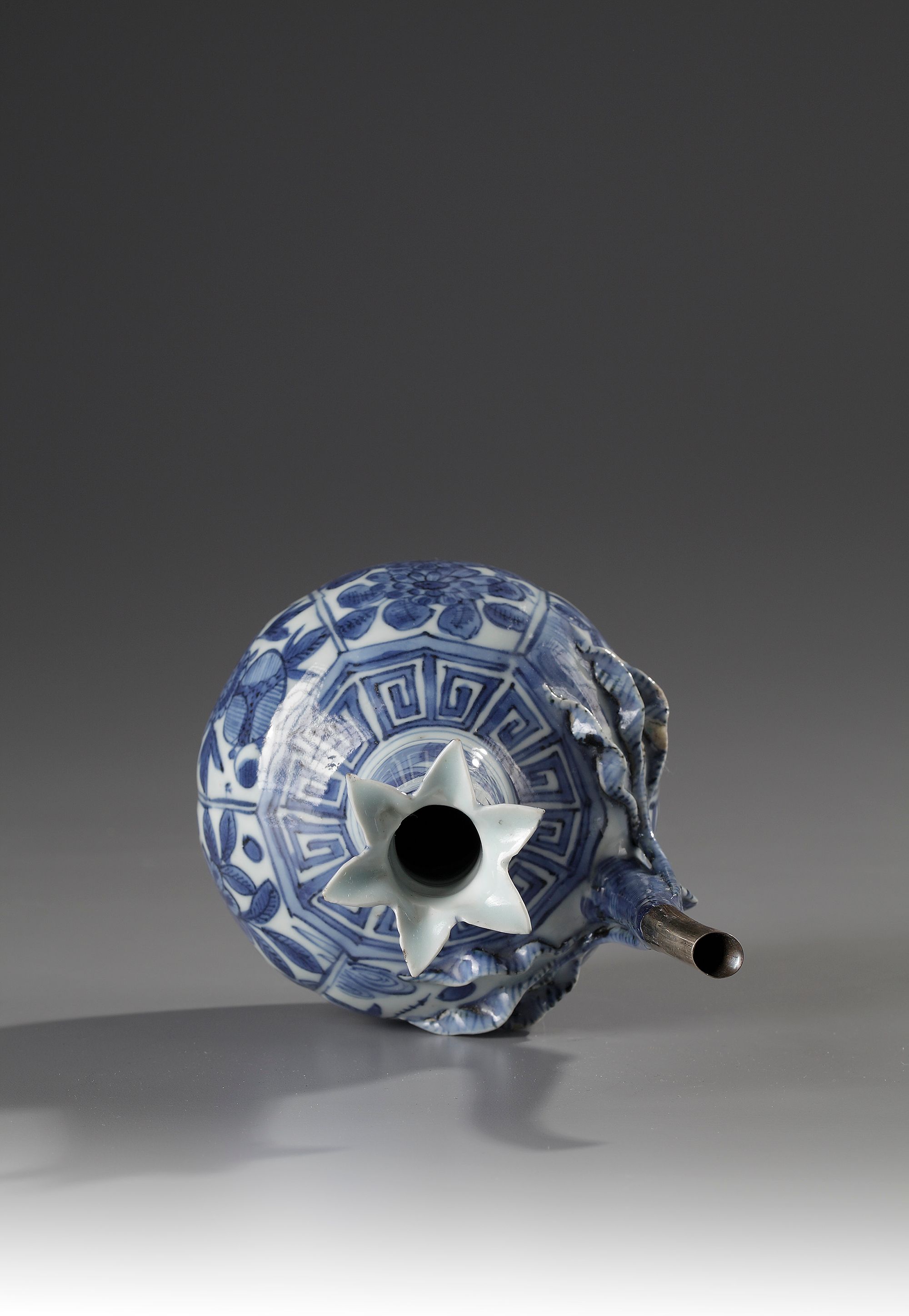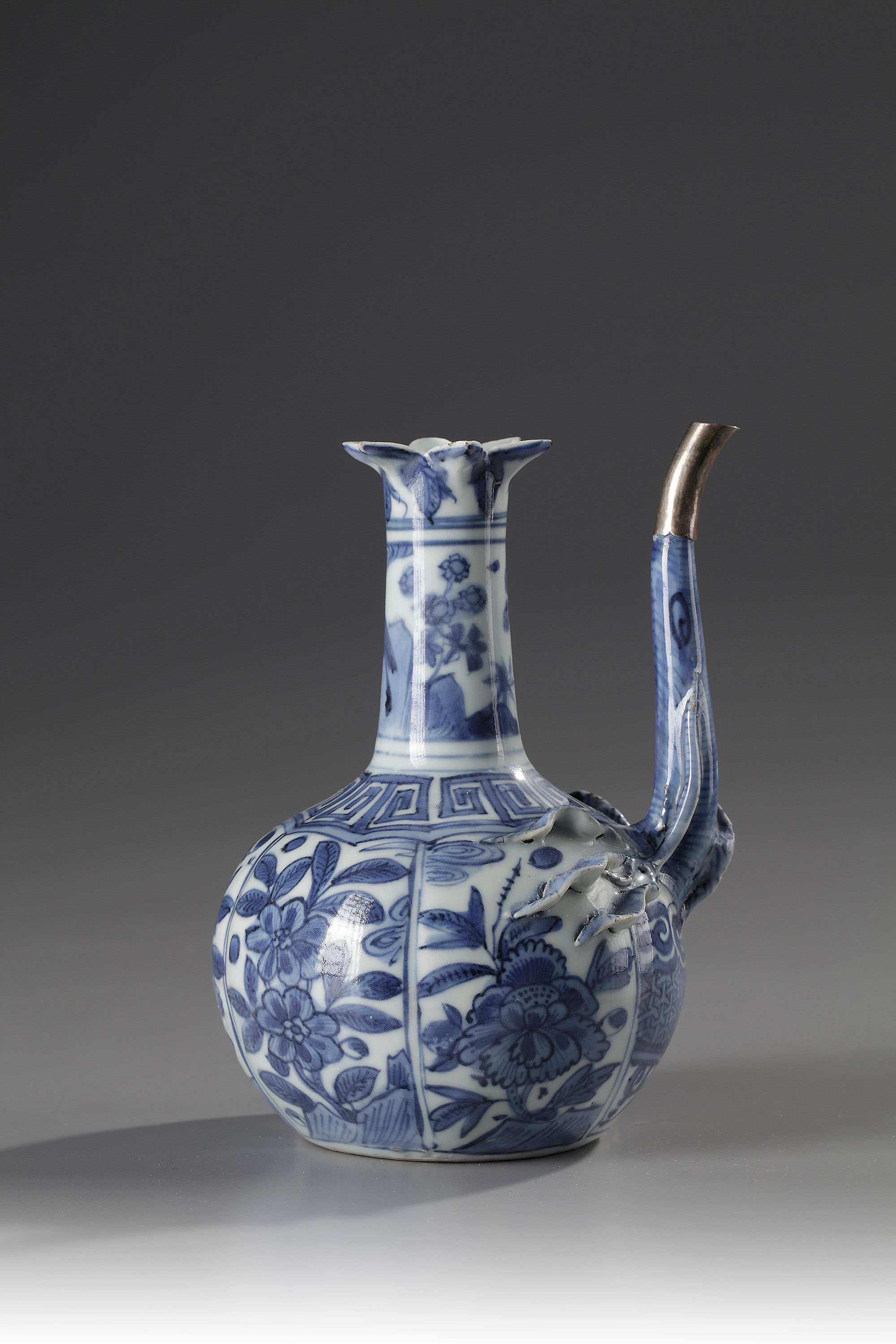 The moulded ewer is decorated with panels enclosing flowers and is applied to the base of the spout with trailing leaves.
