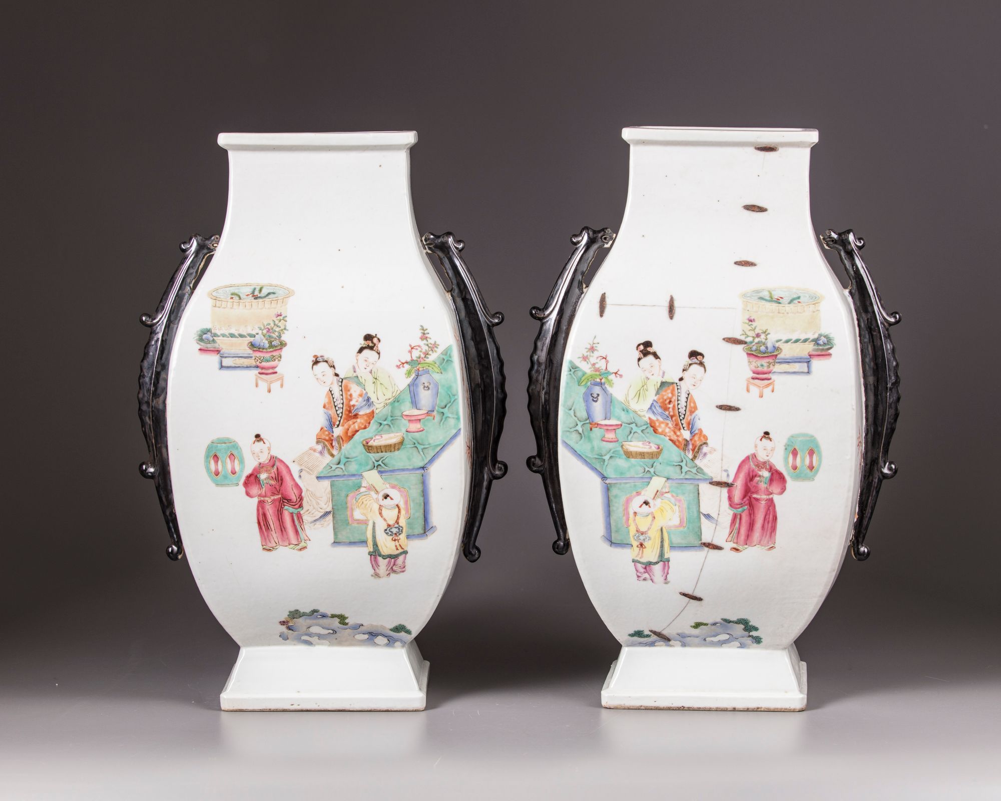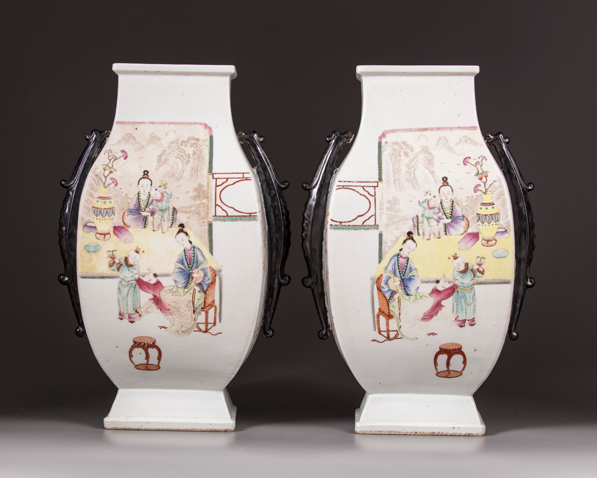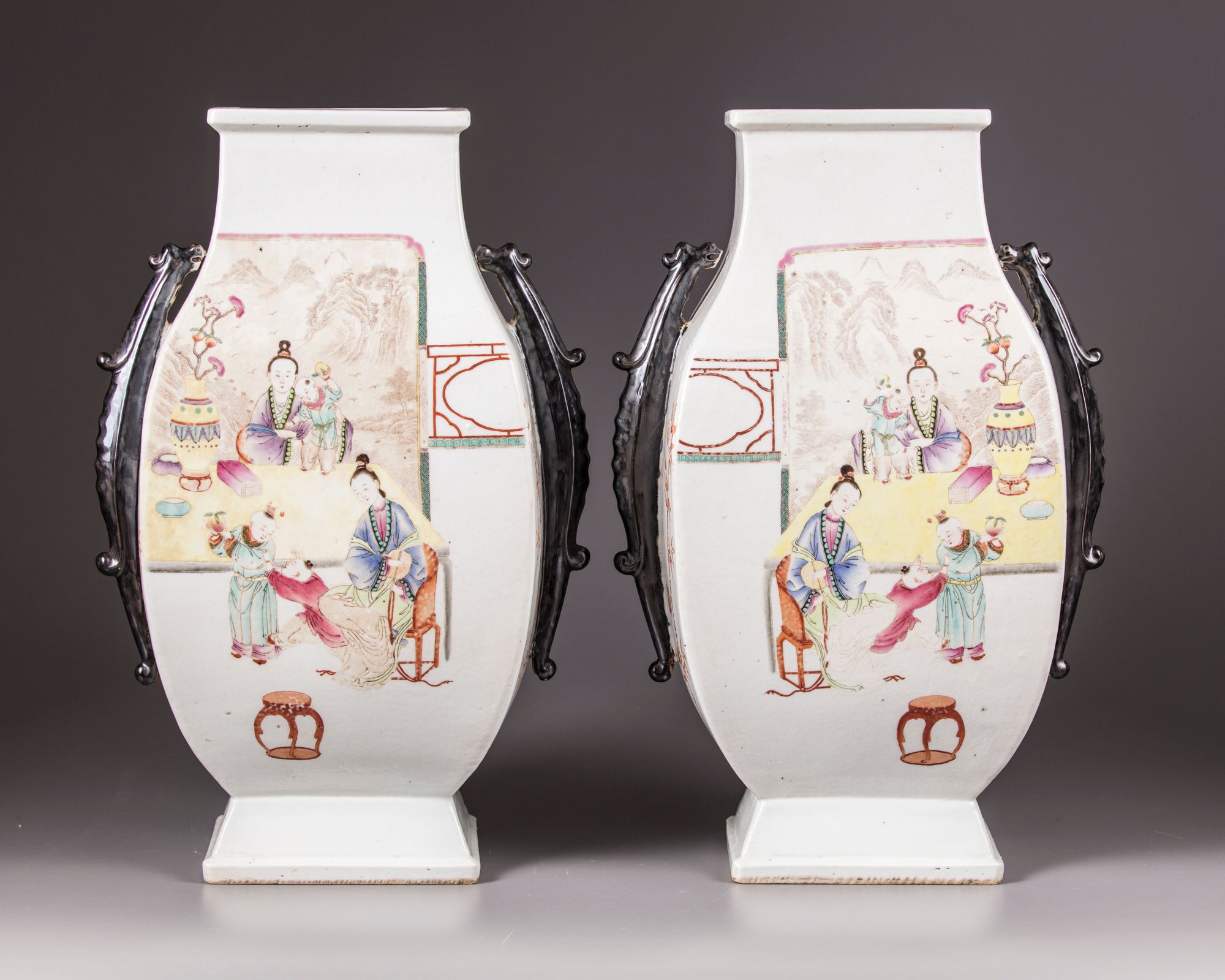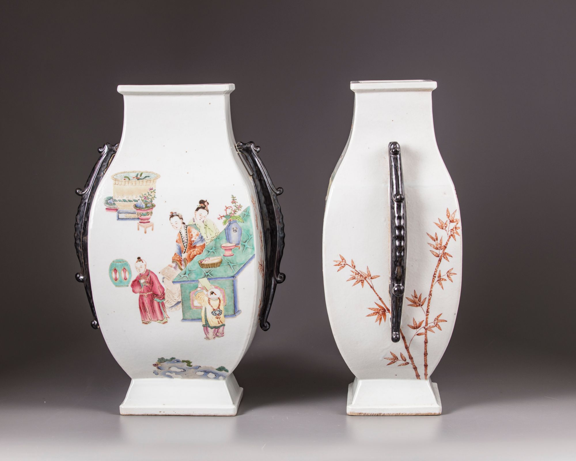 Both vases are decorated in mirror image with two openwork dark-glazed dragon handles, with scenes of ladies at leisure and boys at play in elegant interiors. The narrow sides are decorated with iron-red bamboo sprays.