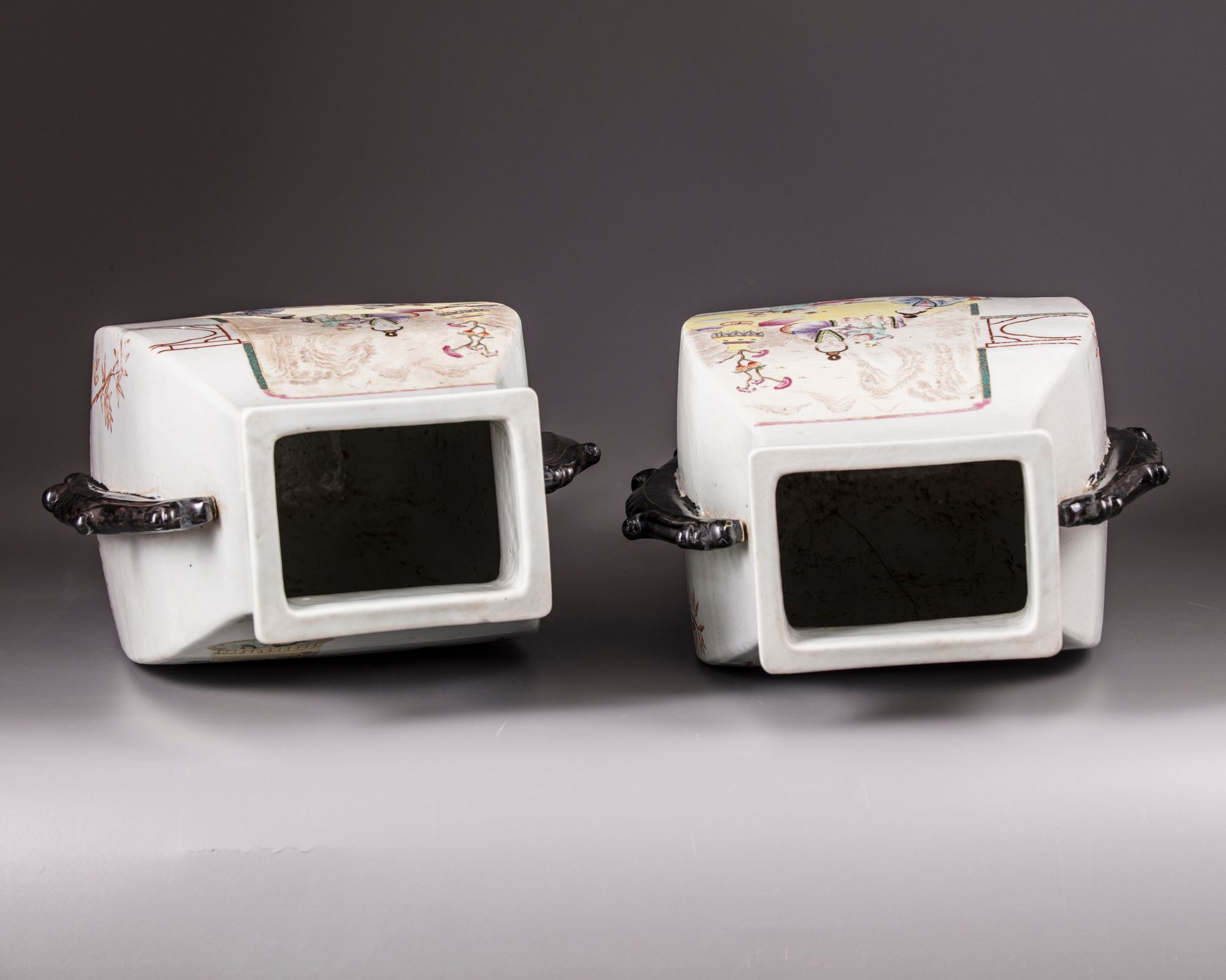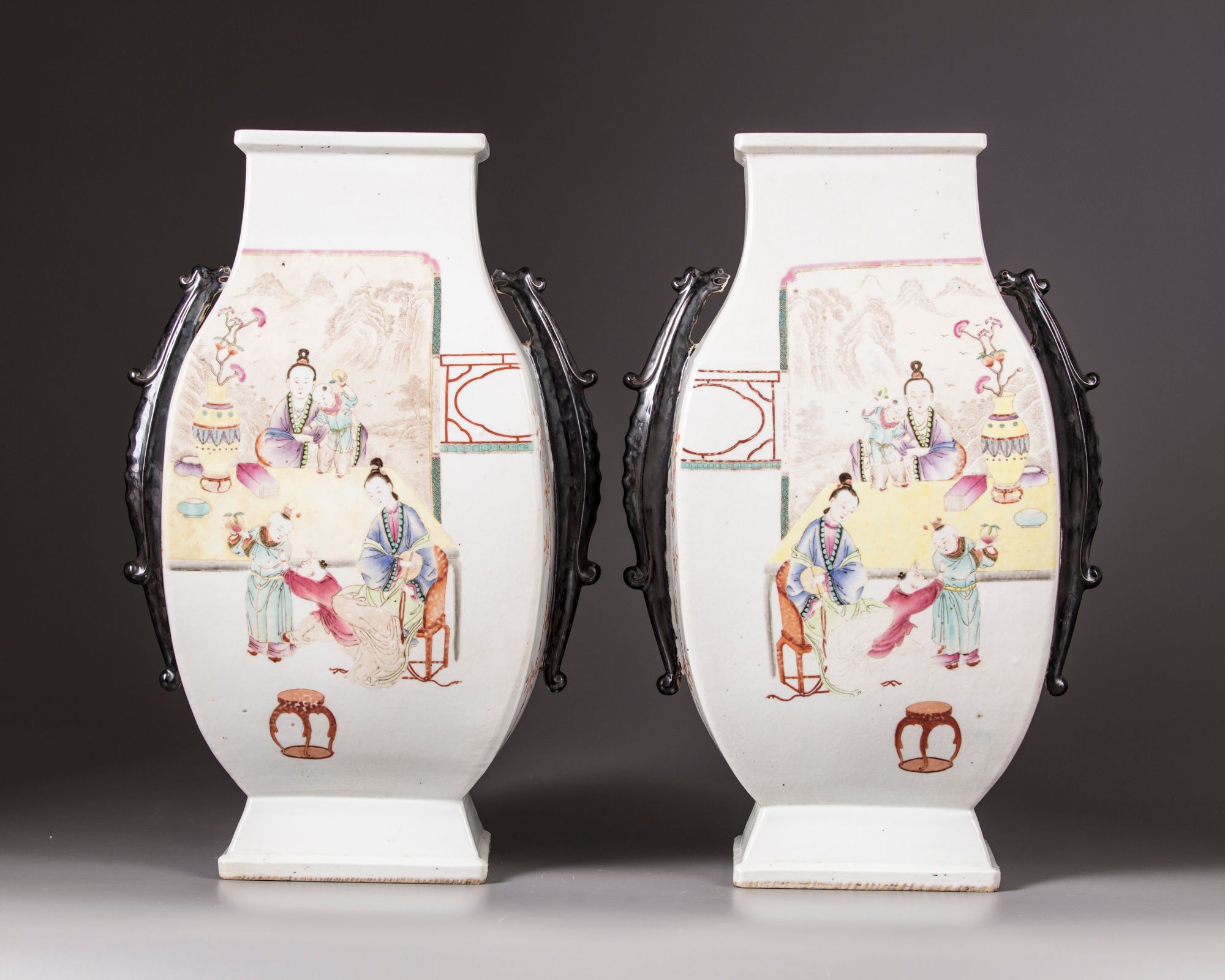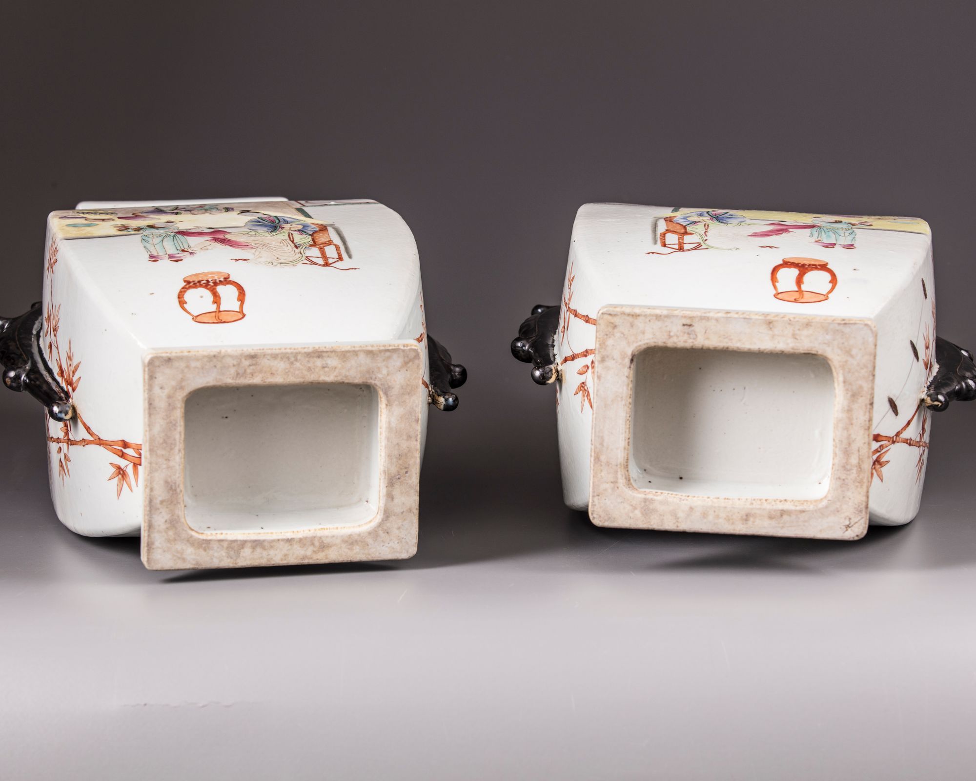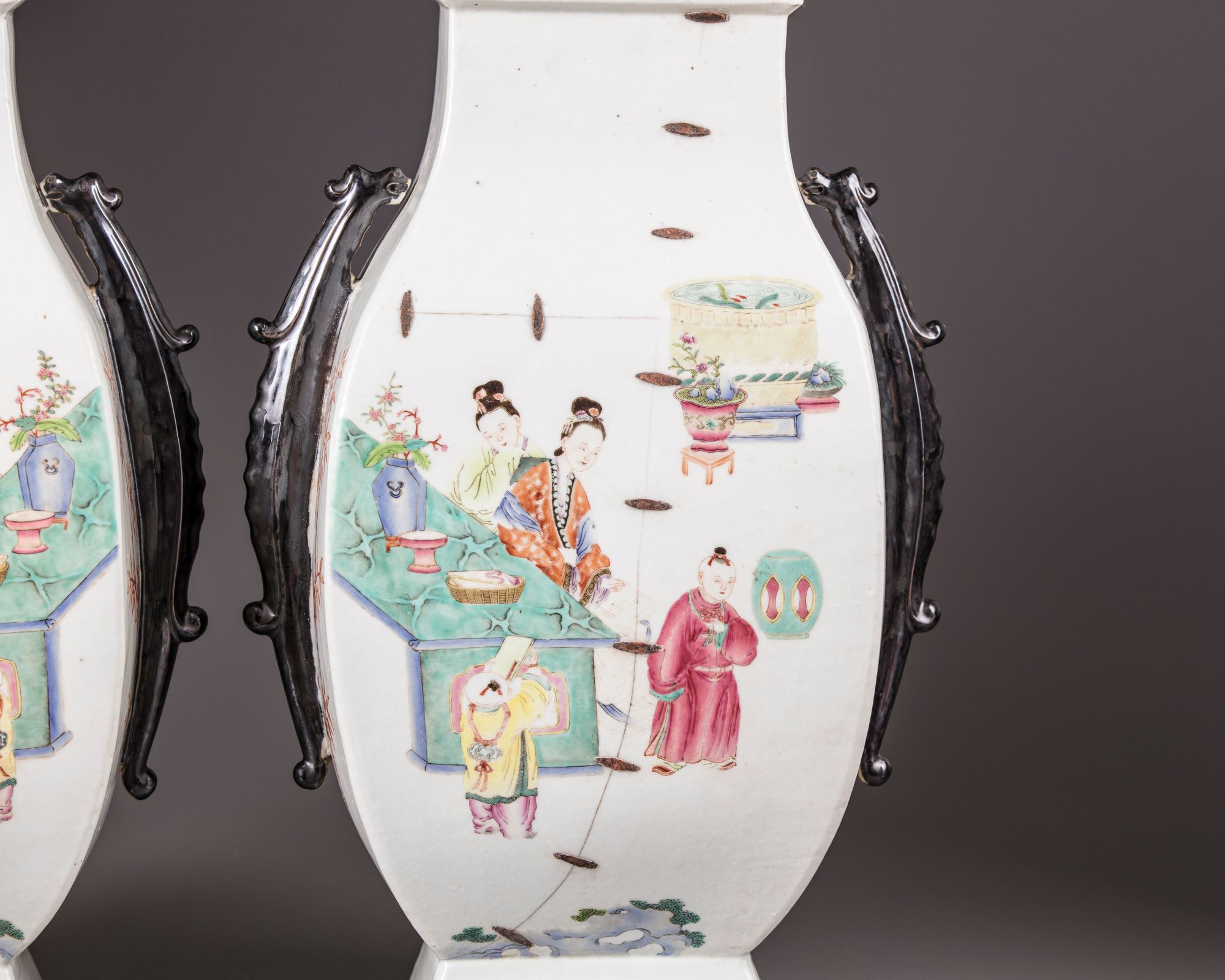 Both vases are decorated in mirror image with two openwork dark-glazed dragon handles, with scenes of ladies at leisure and boys at play in elegant interiors. The narrow sides are decorated with iron-red bamboo sprays.