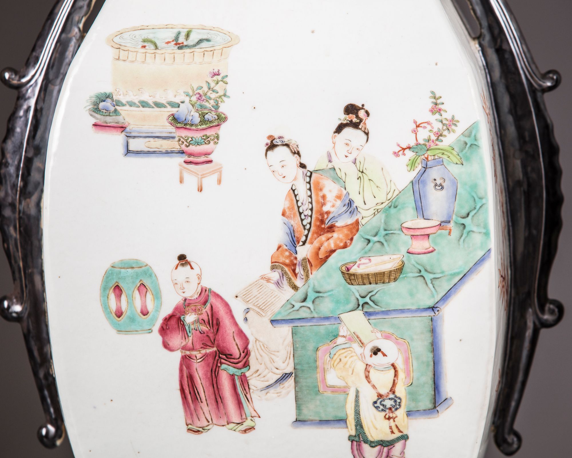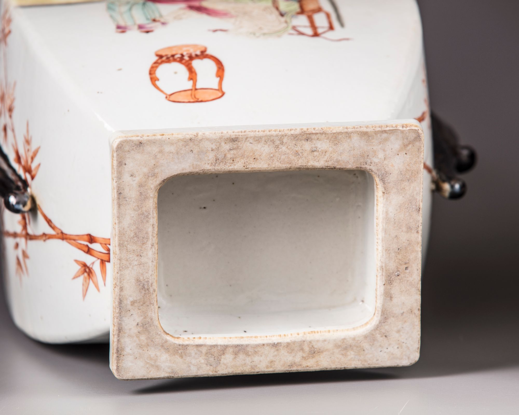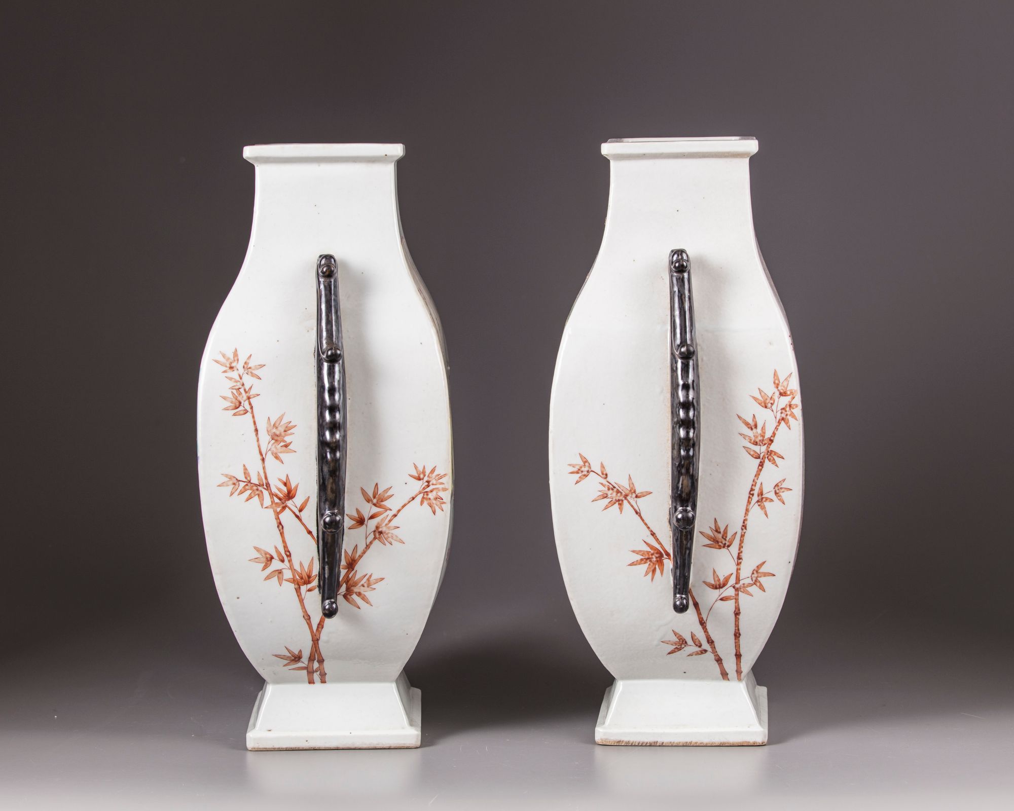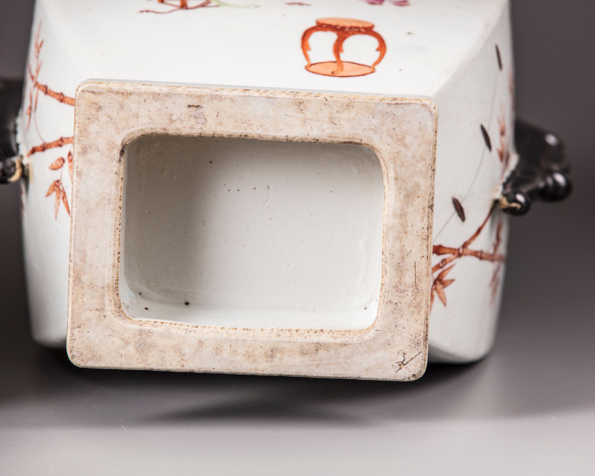 Both vases are decorated in mirror image with two openwork dark-glazed dragon handles, with scenes of ladies at leisure and boys at play in elegant interiors. The narrow sides are decorated with iron-red bamboo sprays.