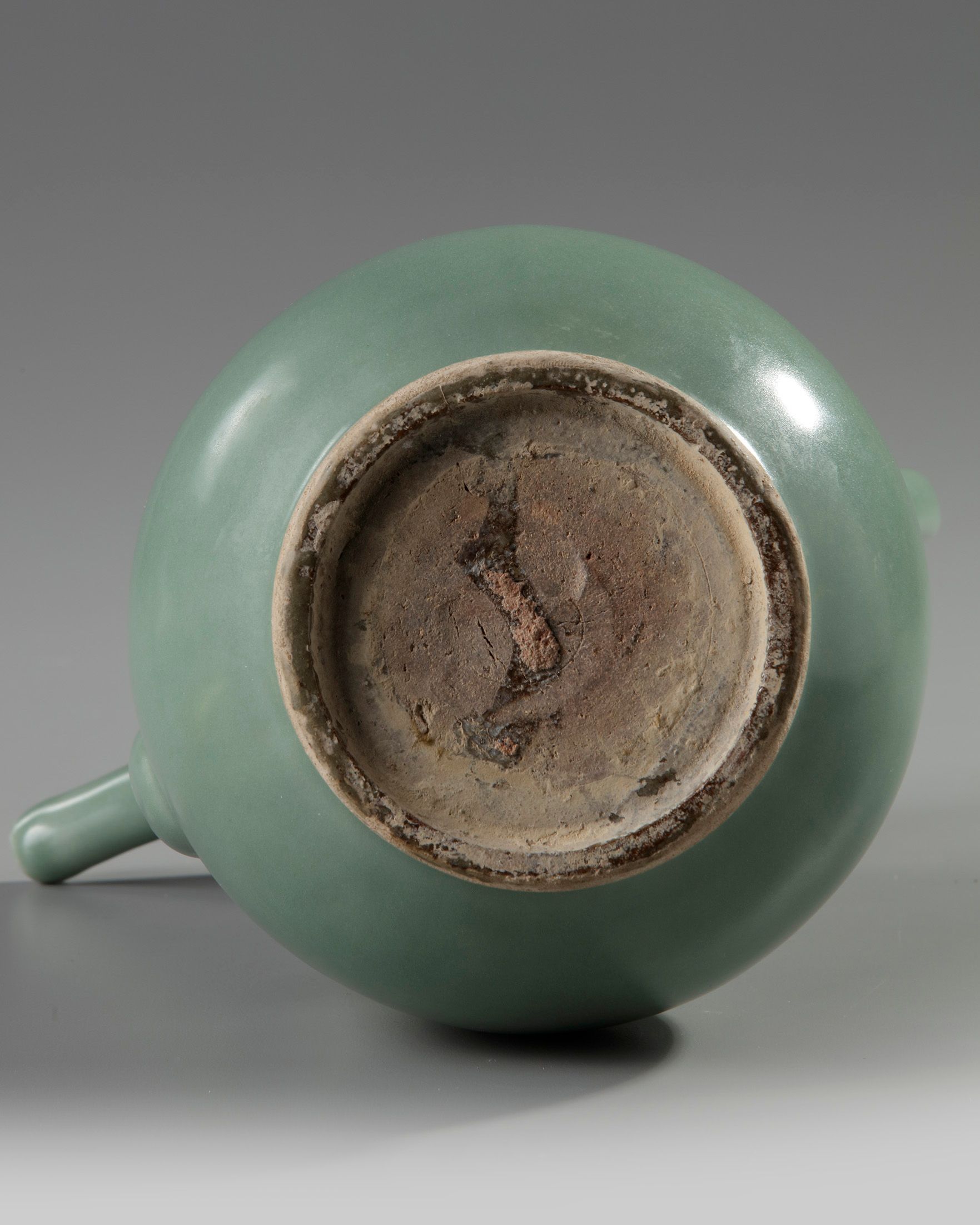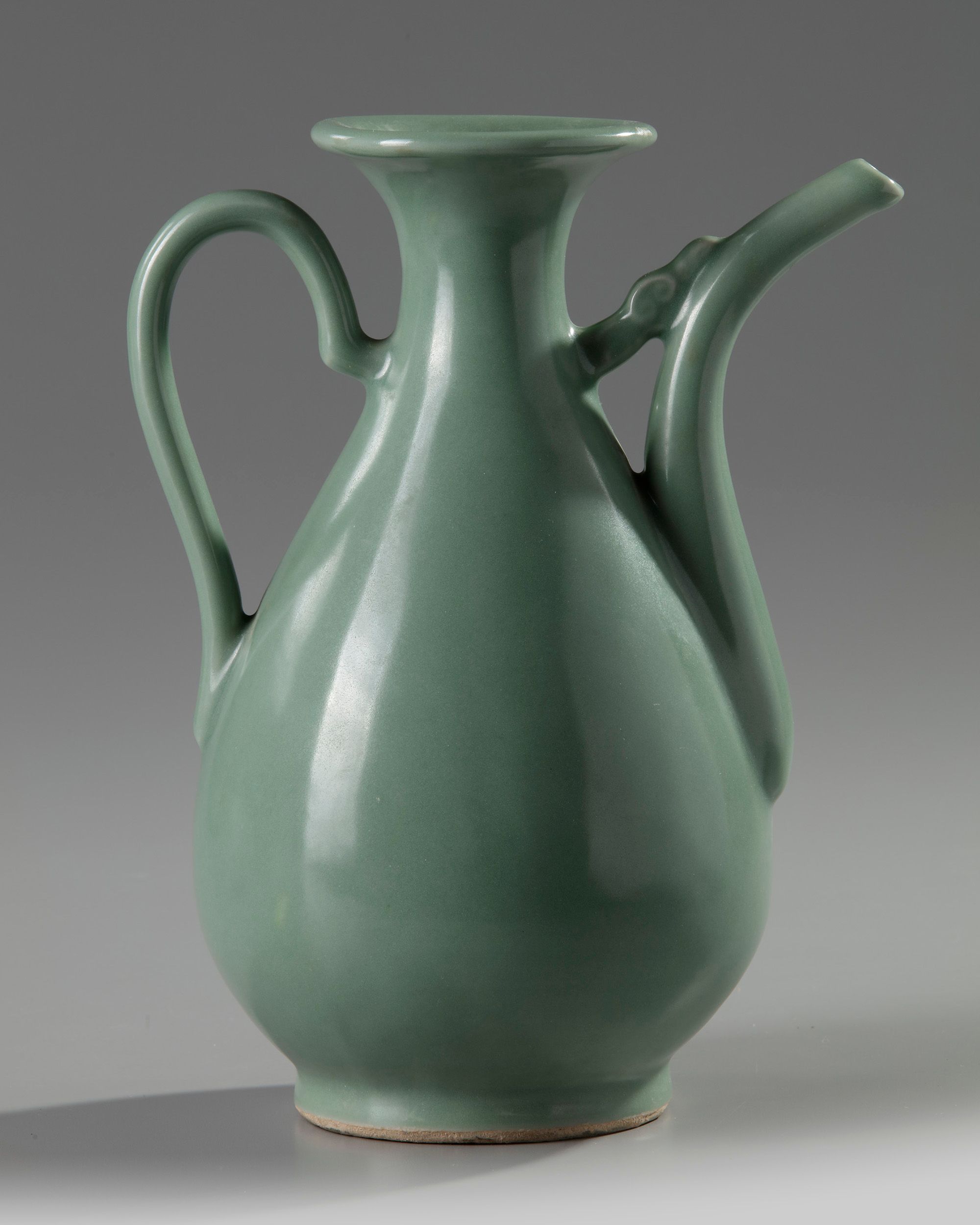 The ewer is modelled with a pear-shaped body and a flaring mouth, the slender curving spout is held by a stylised dragon truss, the ear-shaped handle is shaped after a metal original. The ewer is covered overall in a thick sea-green glaze which stops just above the foot to reveal the unglazed base.