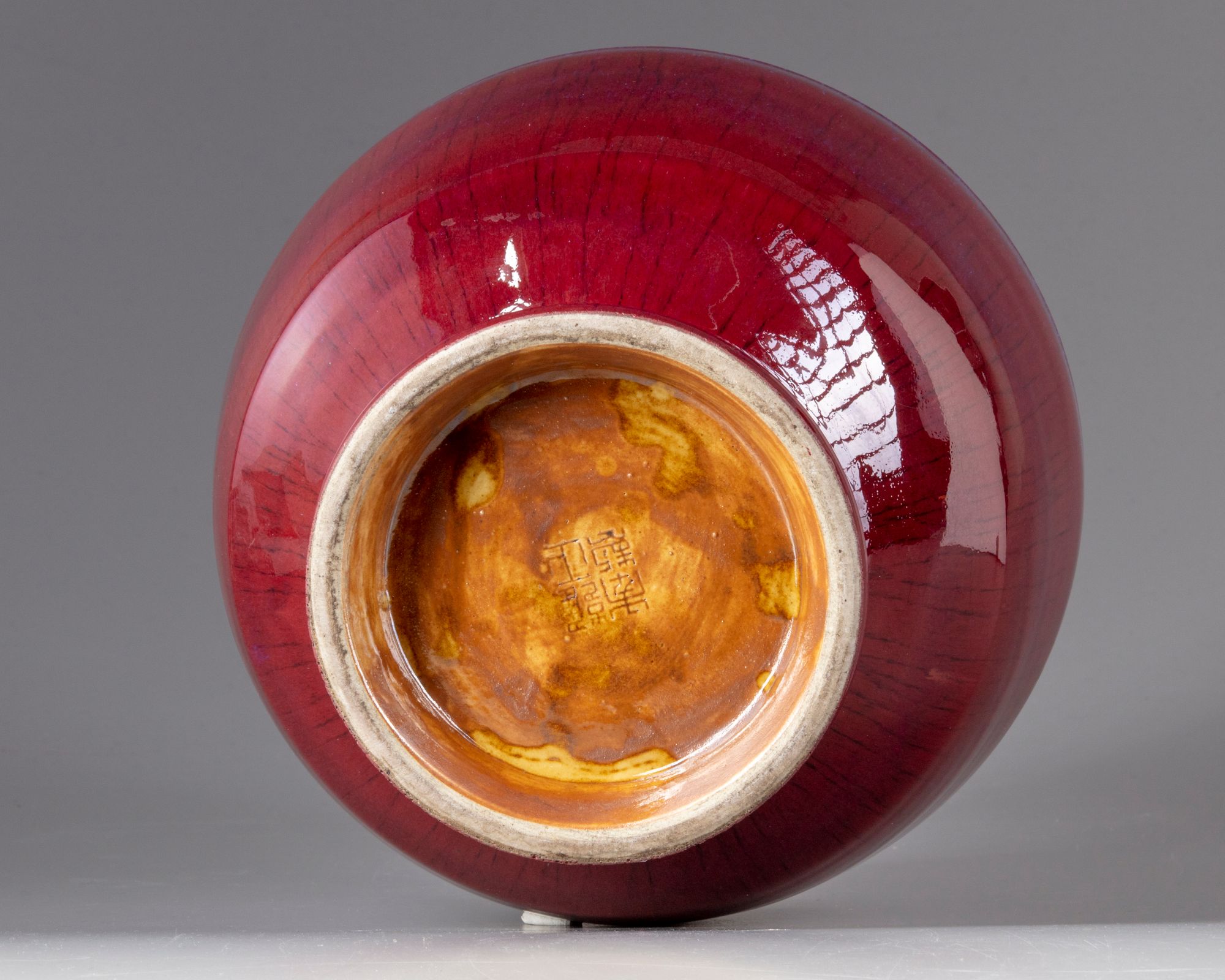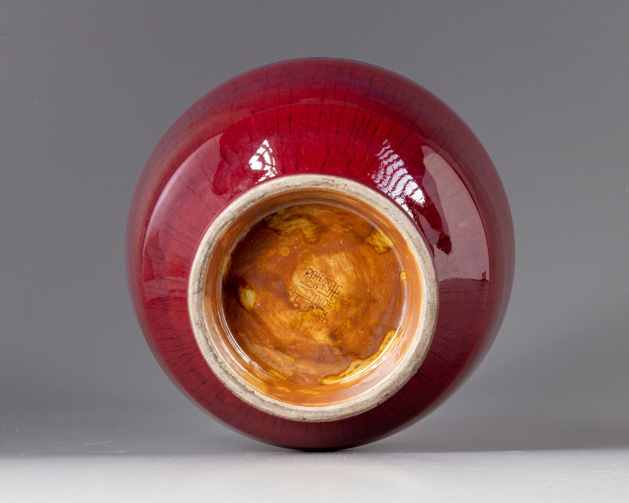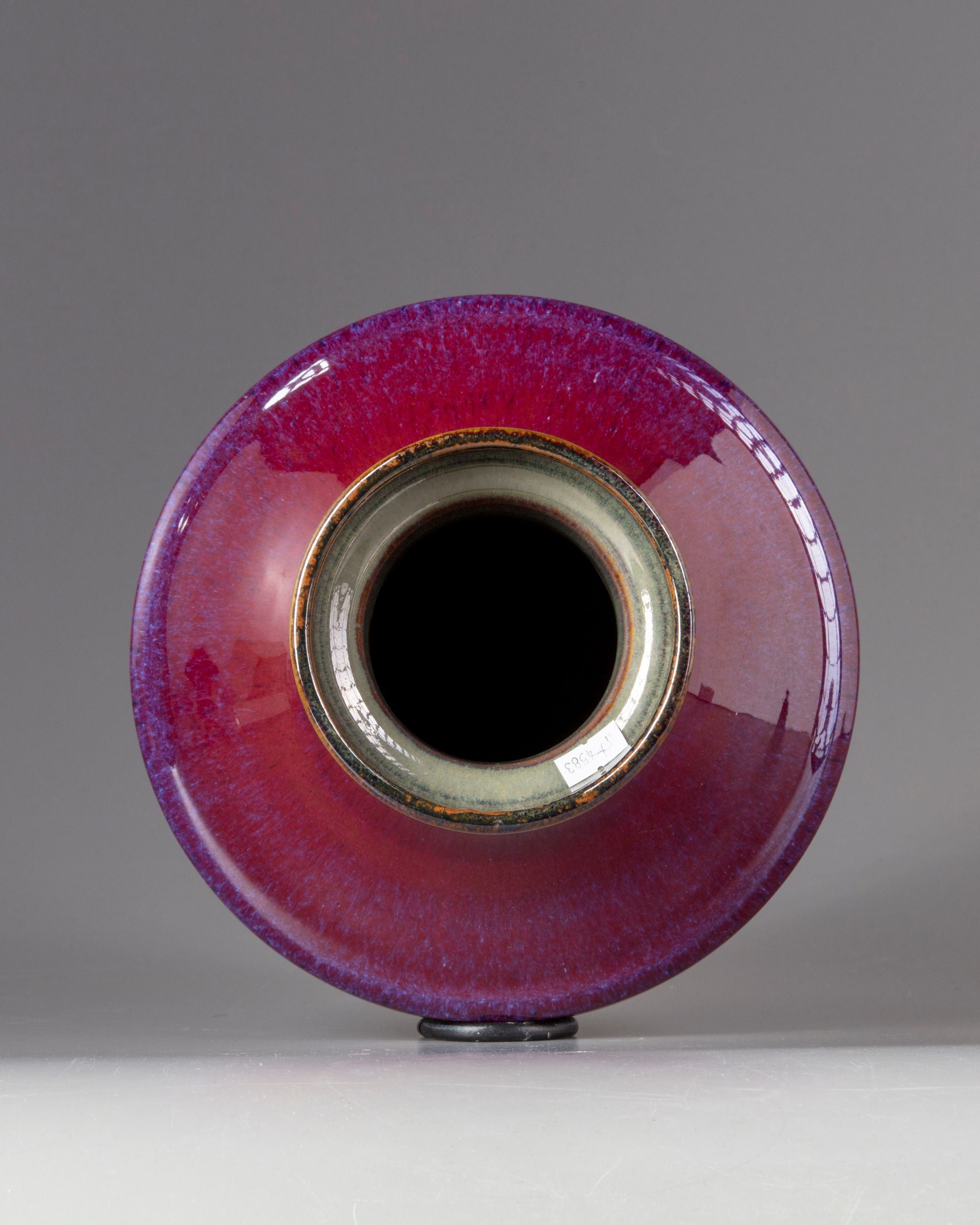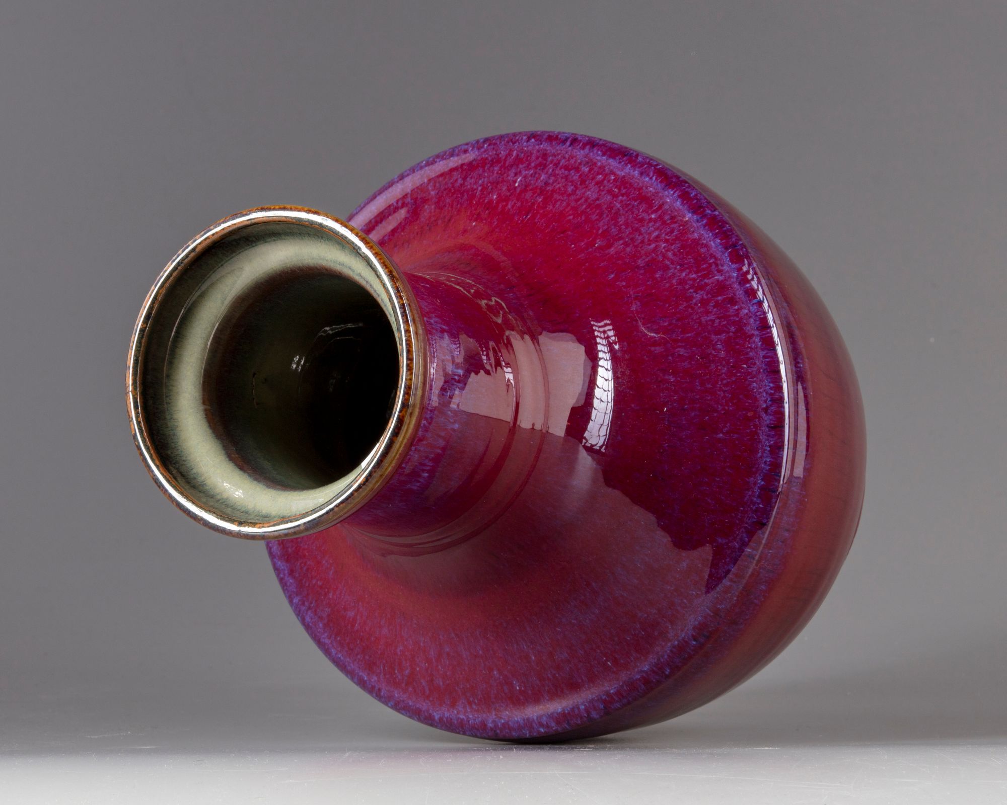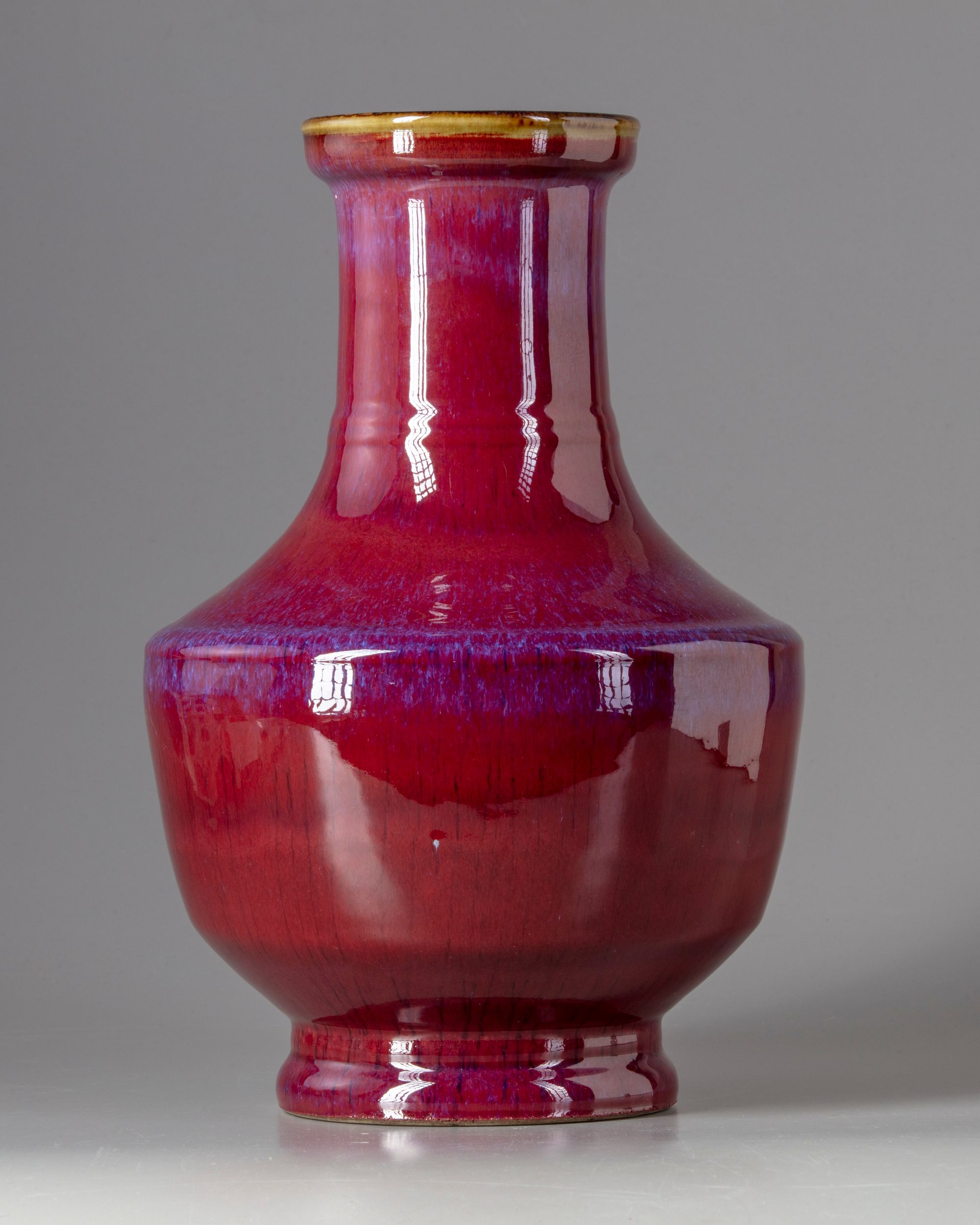 The vase is fashioned with an angular shoulder and some low ribs to the neck. The vase is covered with a deep red glaze of crushed strawberry tone with purple inclusions thinning to mushroom at the rim, the interior with a cafe au lait tone. The base is glazed brown with an apocryphal Yongzheng mark.