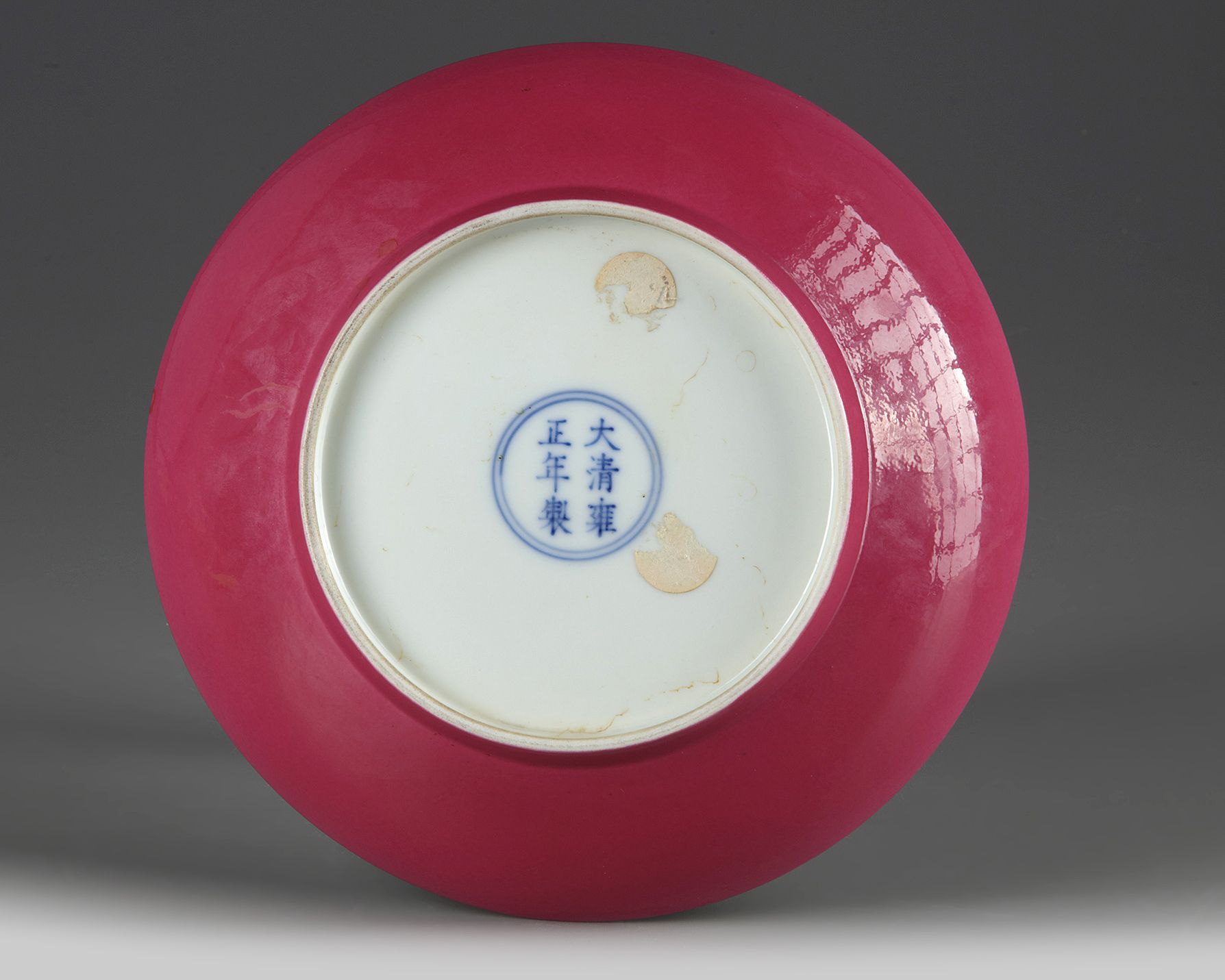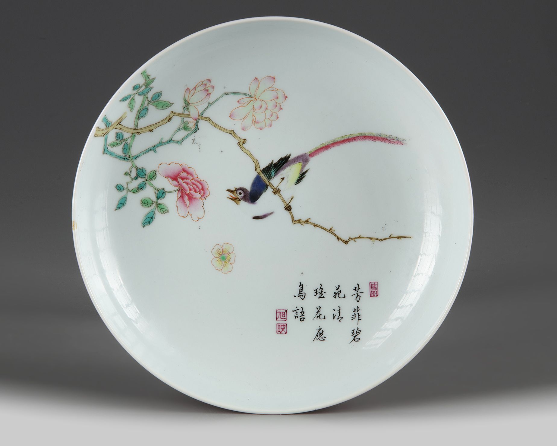 The dish is decorated to the centre with a long-tailed bird perched on a prunus and peony branch, accompanied by a poetic inscription. The reverse is decorated in a vibrant ruby enamel, with an apocryphal Yongzheng mark to the base.