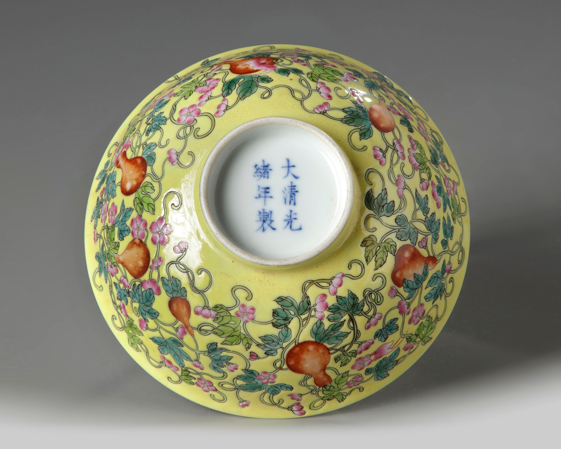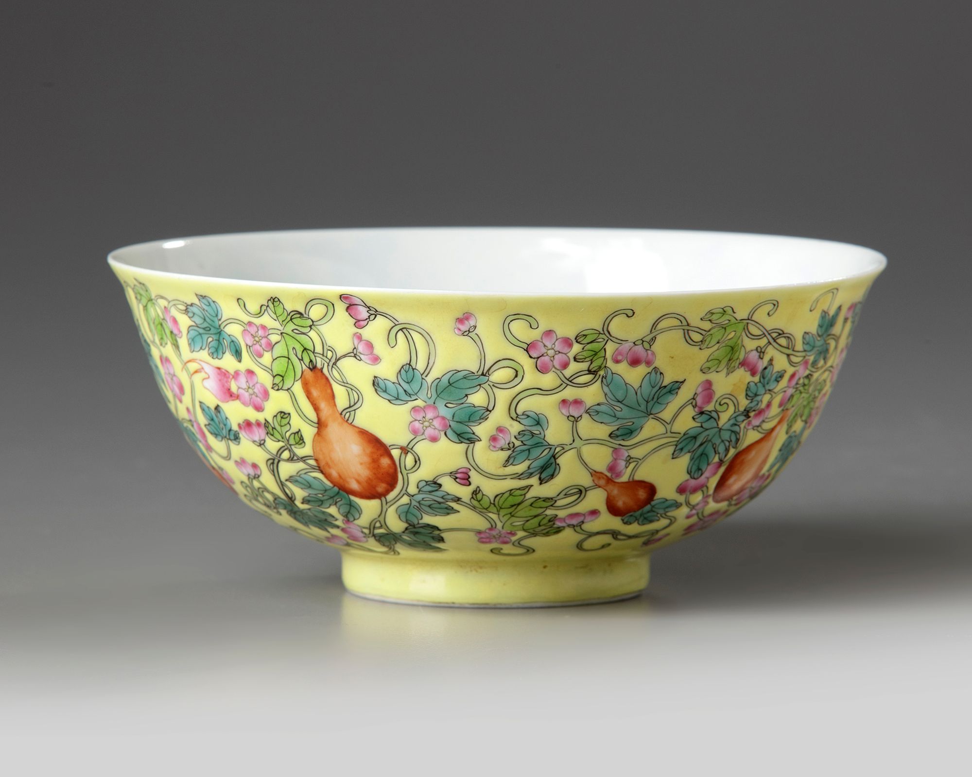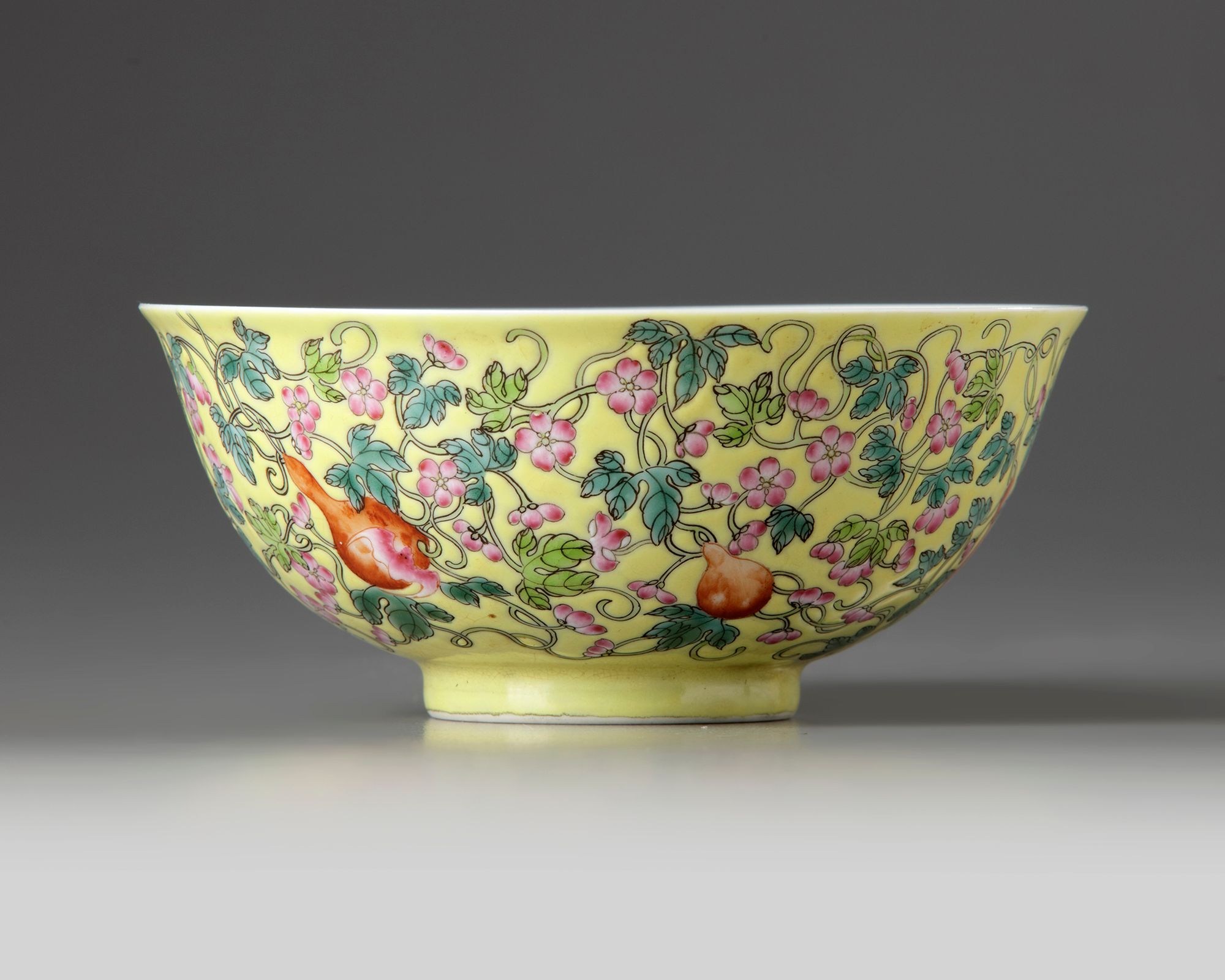 A Chinese yellow-ground famille rose 'gourds' bowl