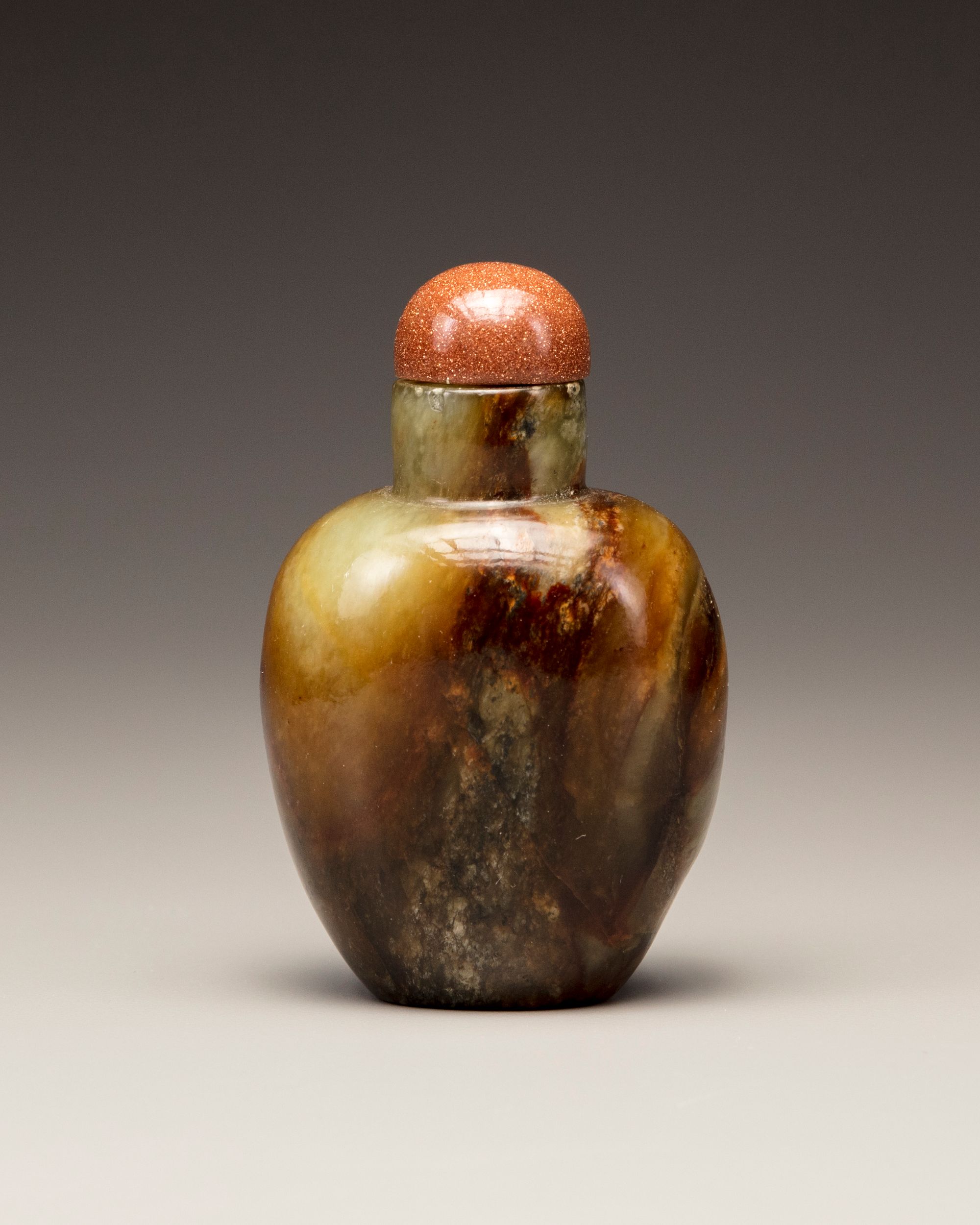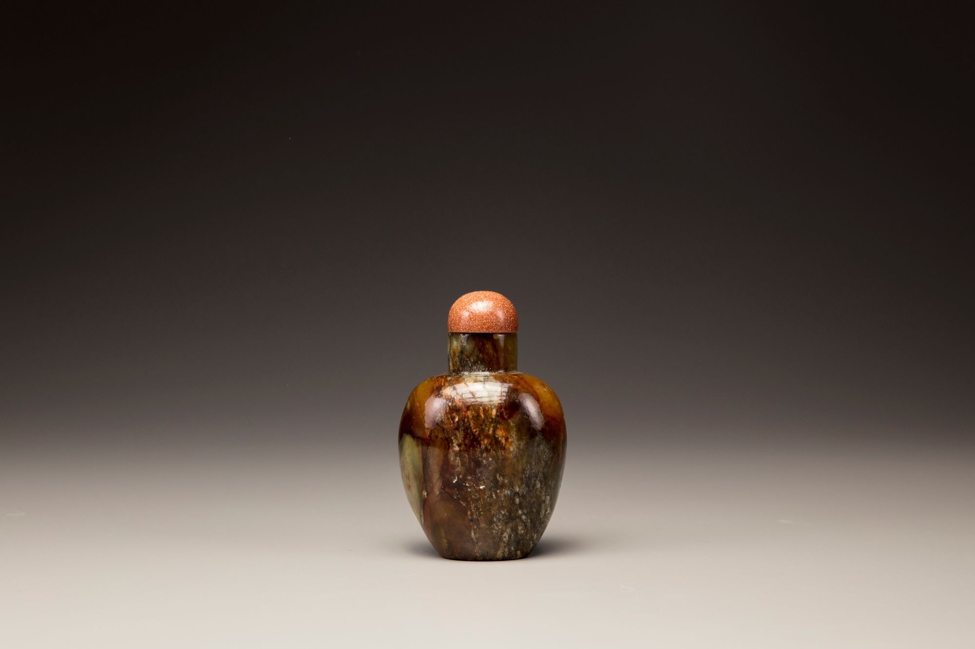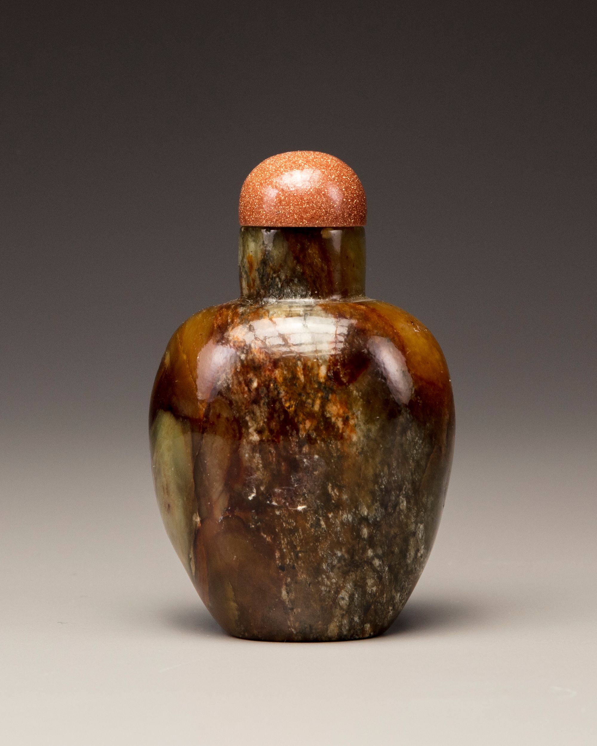 The large jade snuff bottle is simply decorated with rounded shoulders. The stone is of a celadon tone with russet and grey inclusions. With a goldstone stopper.